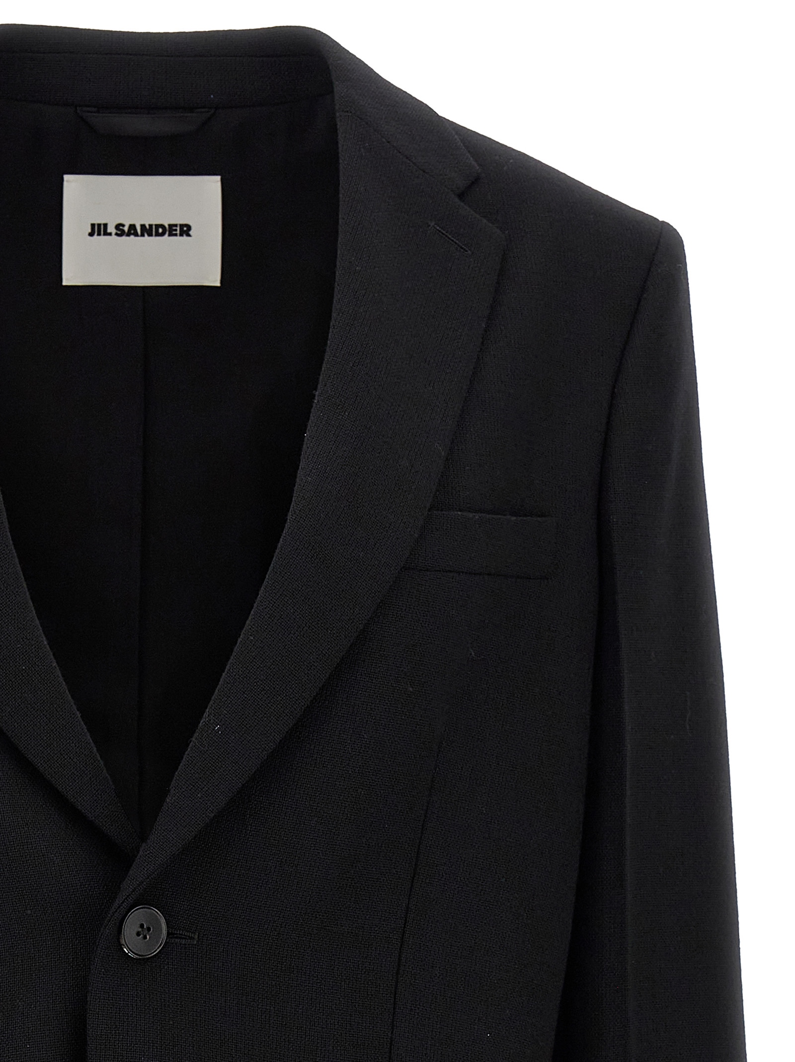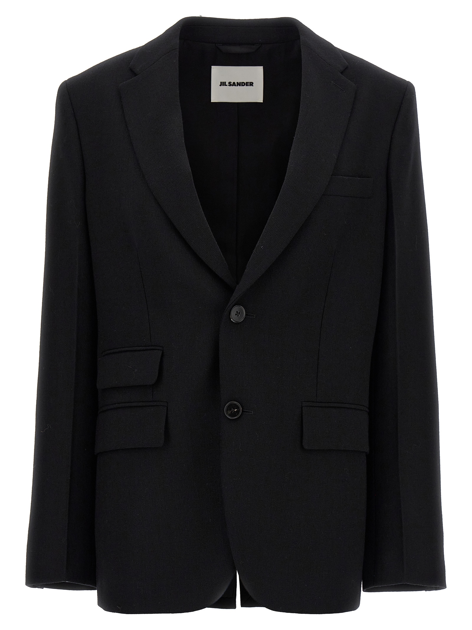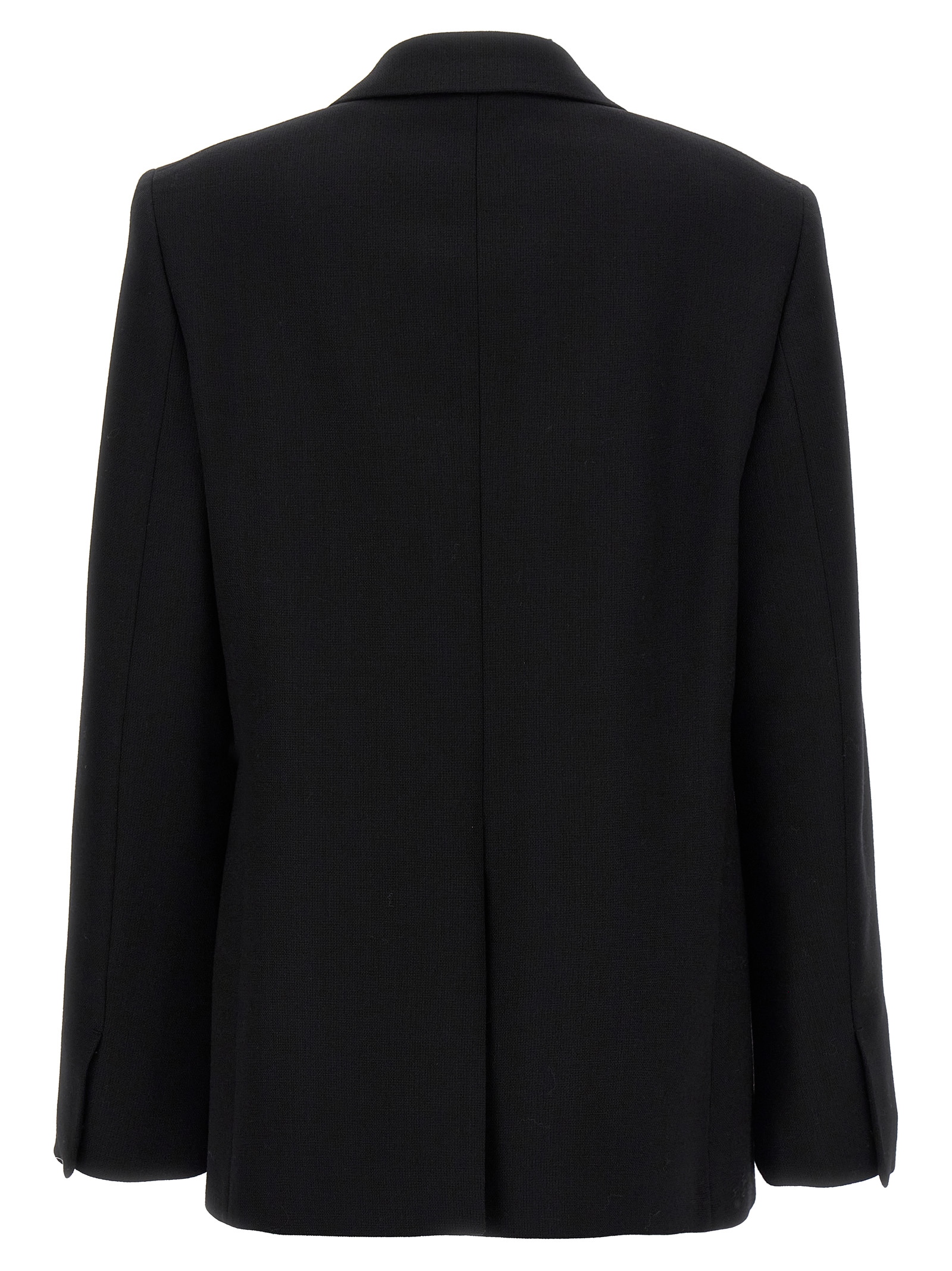 Single-breasted tailored wool blazer with button closure, mirror lapels, flap pockets, long sleeves, back vent.
