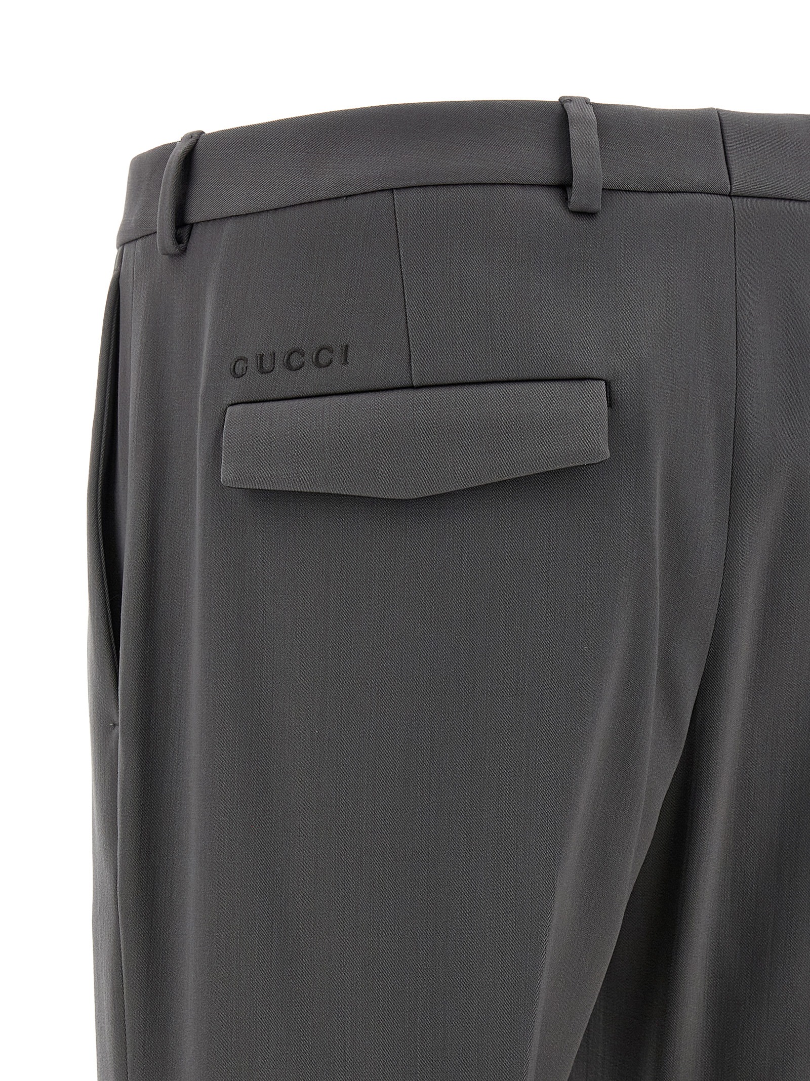 Heavy wool satin trousers, tailored cut, stretched pleat, front zip hook and button closure, pockets, straight leg, tone-on-tone logo embroidery and slit on the back leg bottom.