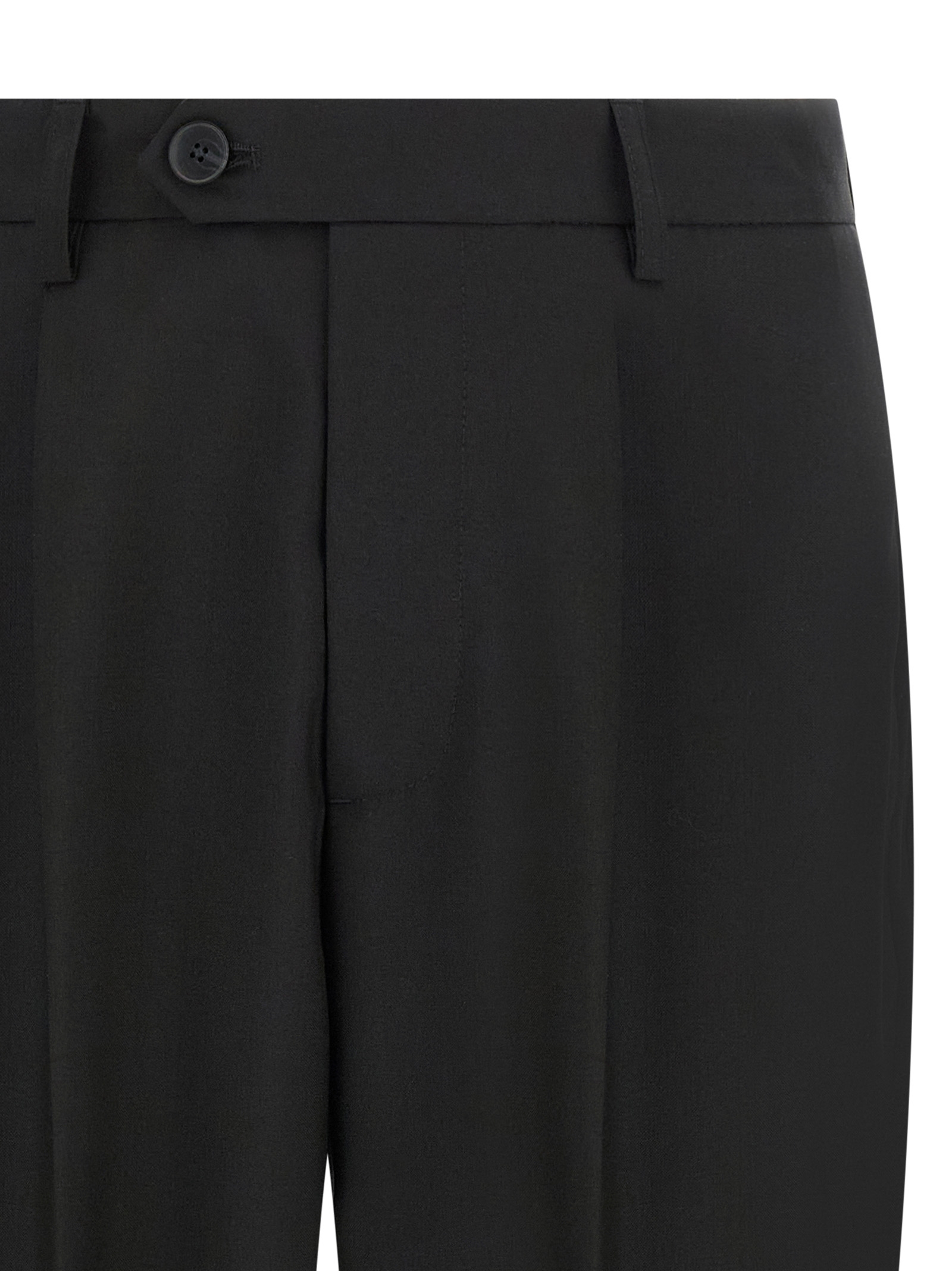 Tailored trousers in Italian tropical wool, mid waist, pins, ironed pleat, straight leg, zip hook and front button closure, pockets.