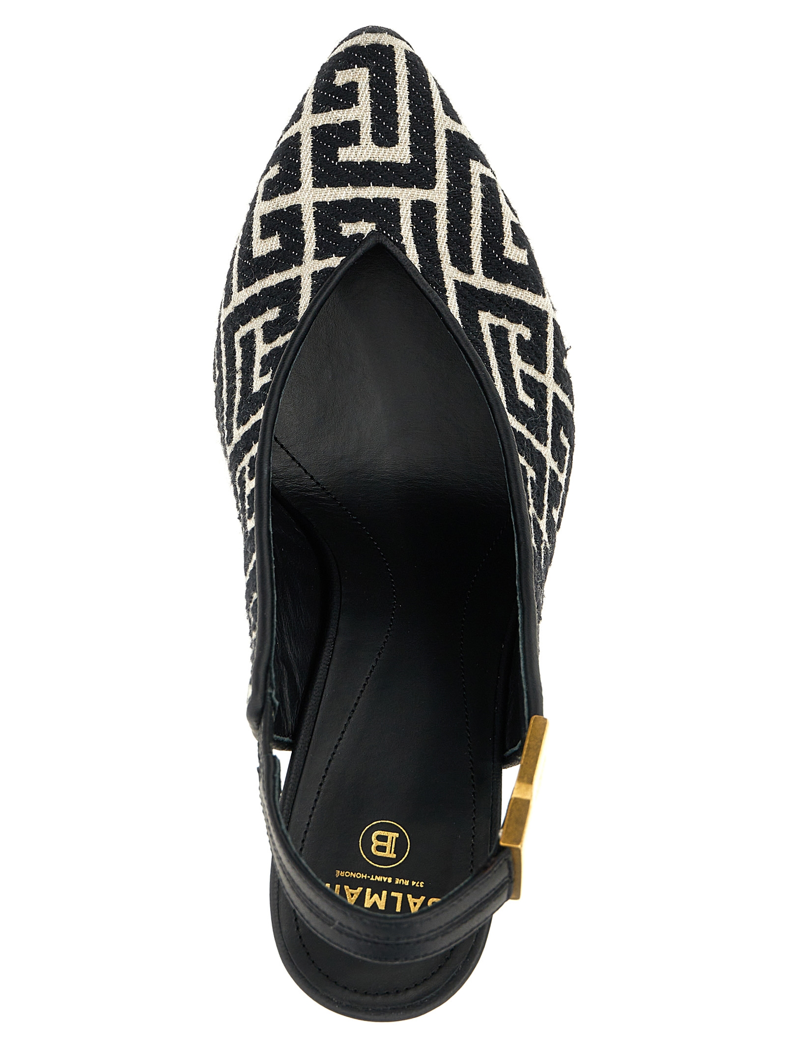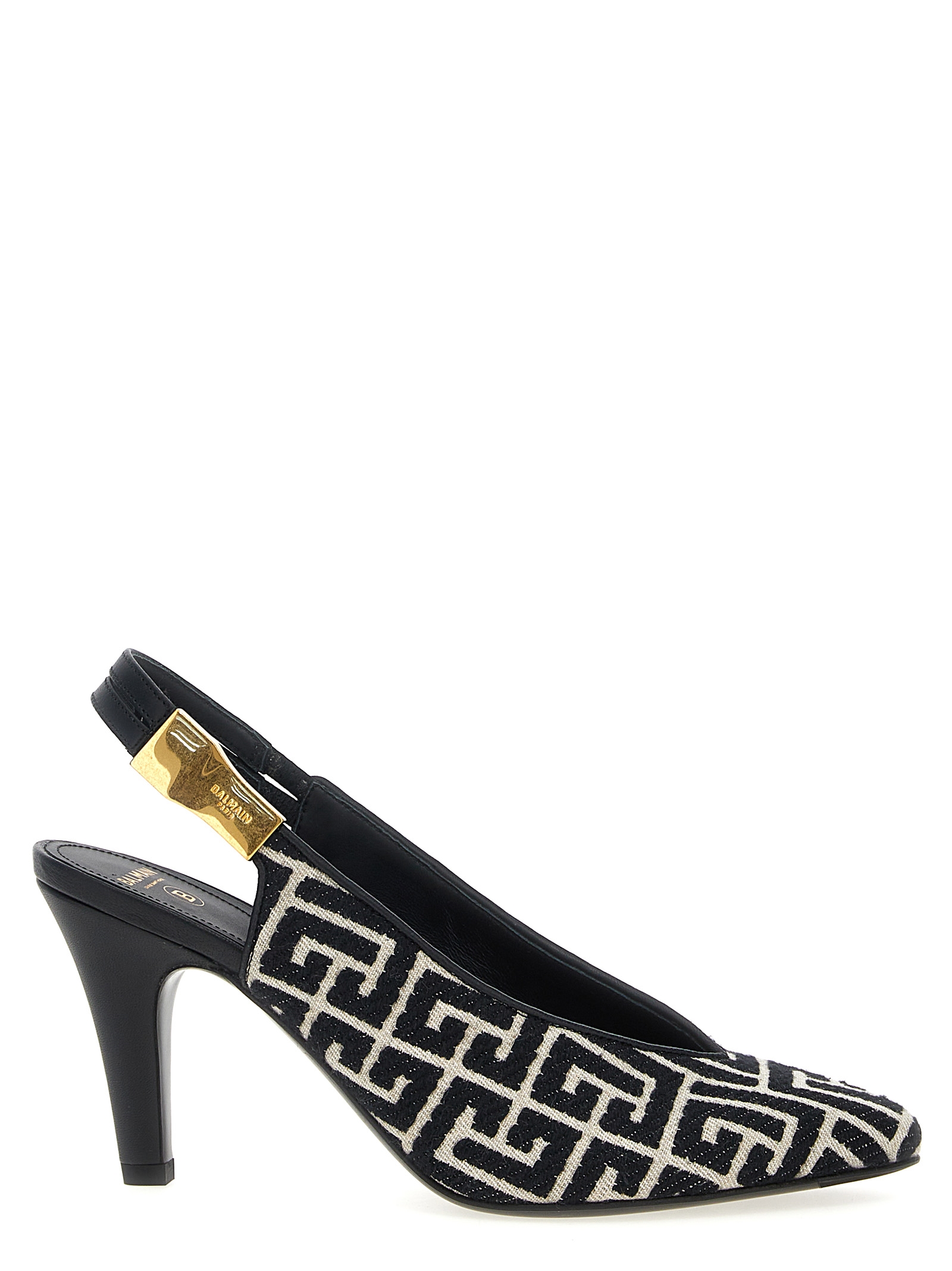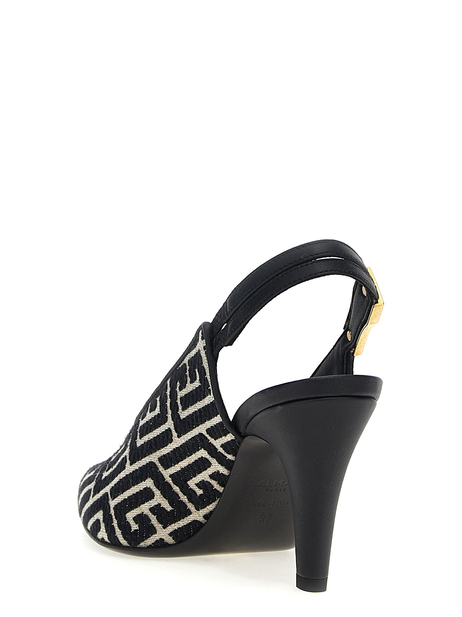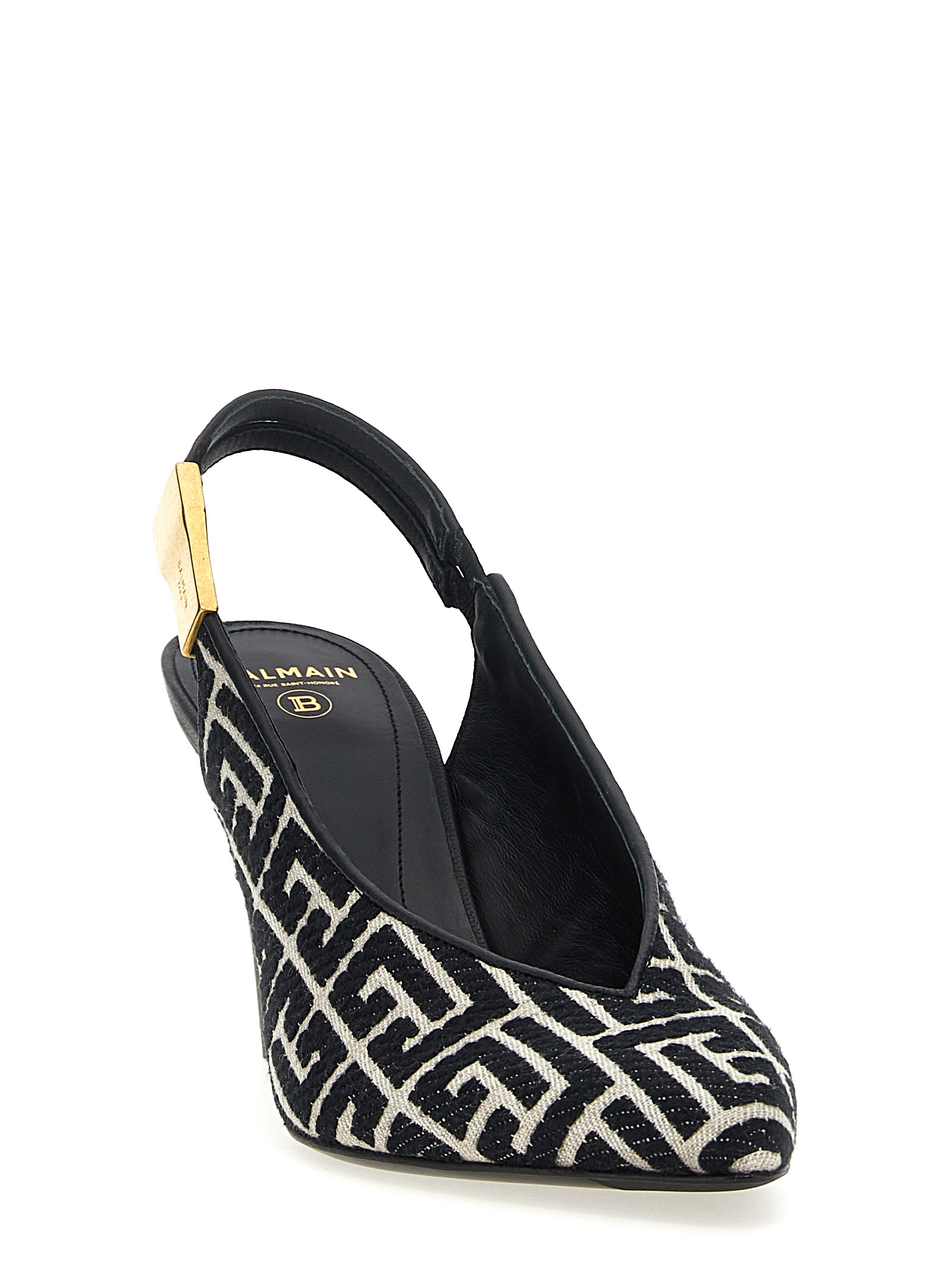 ‘Tara’ jacquard fabric slingbacks with monogram logo and leather, antiqued metal detail on the side, pointed toe, heel, leather sole.