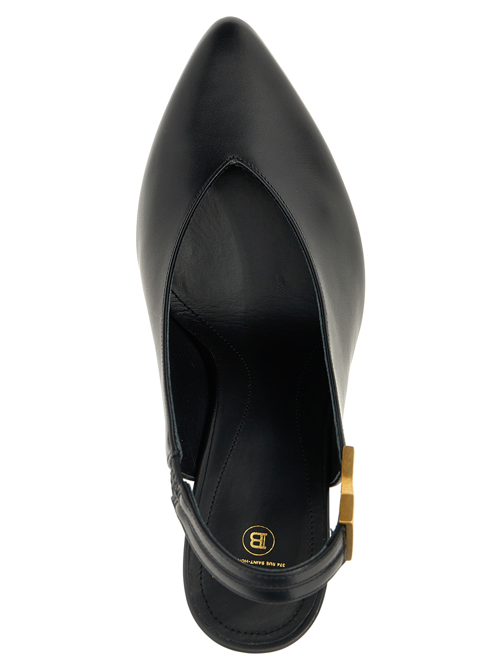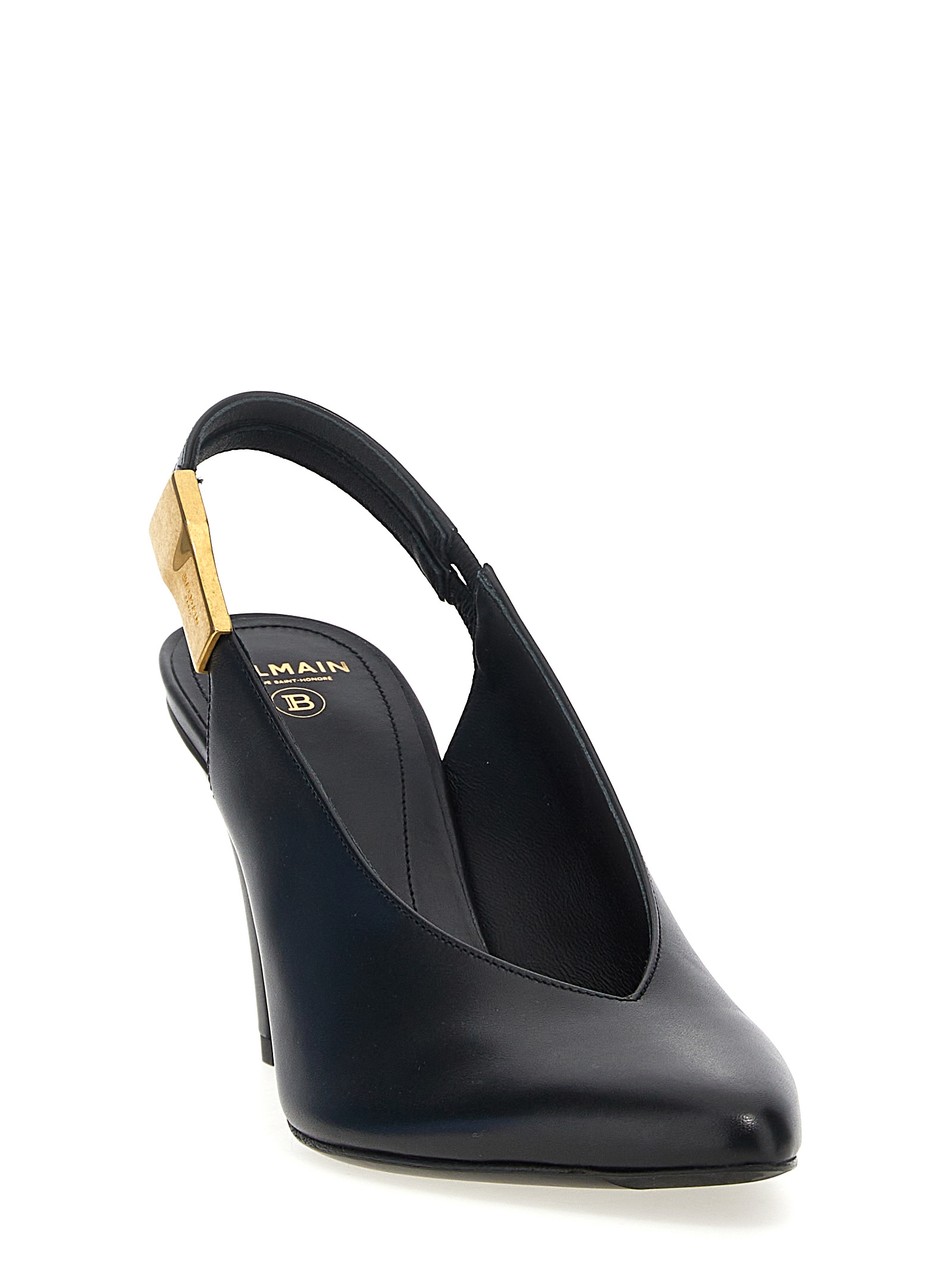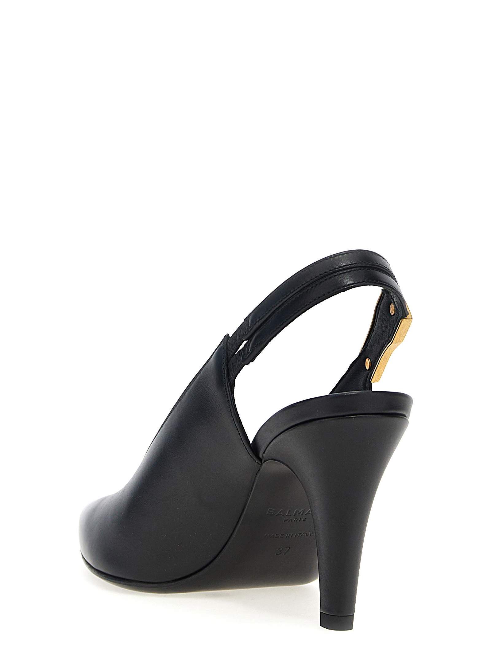 ‘Tara’ leather slingbacks, antiqued metal detail on the side, pointed toe, heel, leather sole.