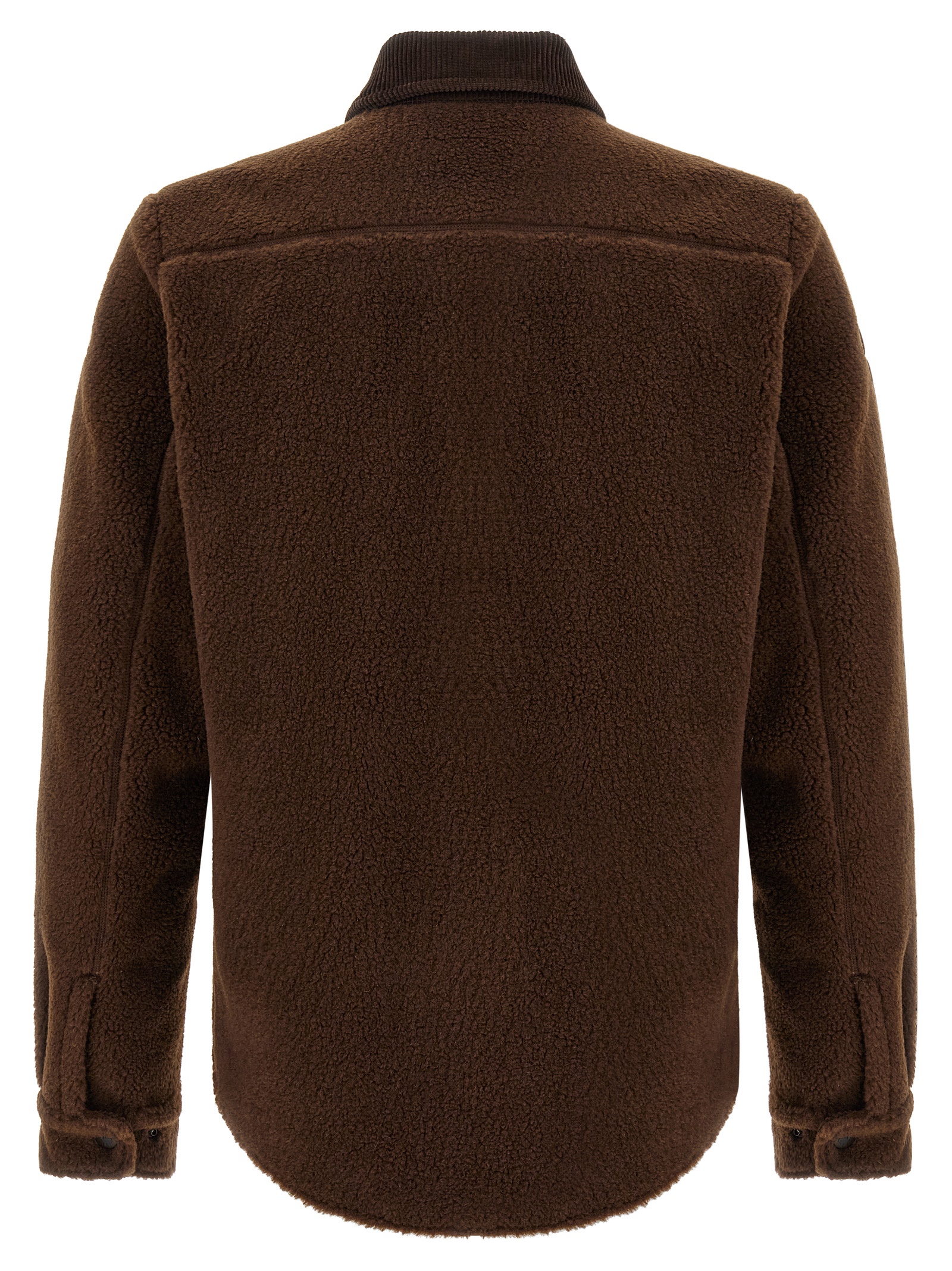 Shirt-style jacket in Teddy-effect fabric with corduroy collar and trims, lined interior, front closure with snap buttons, long sleeves with cuffs.