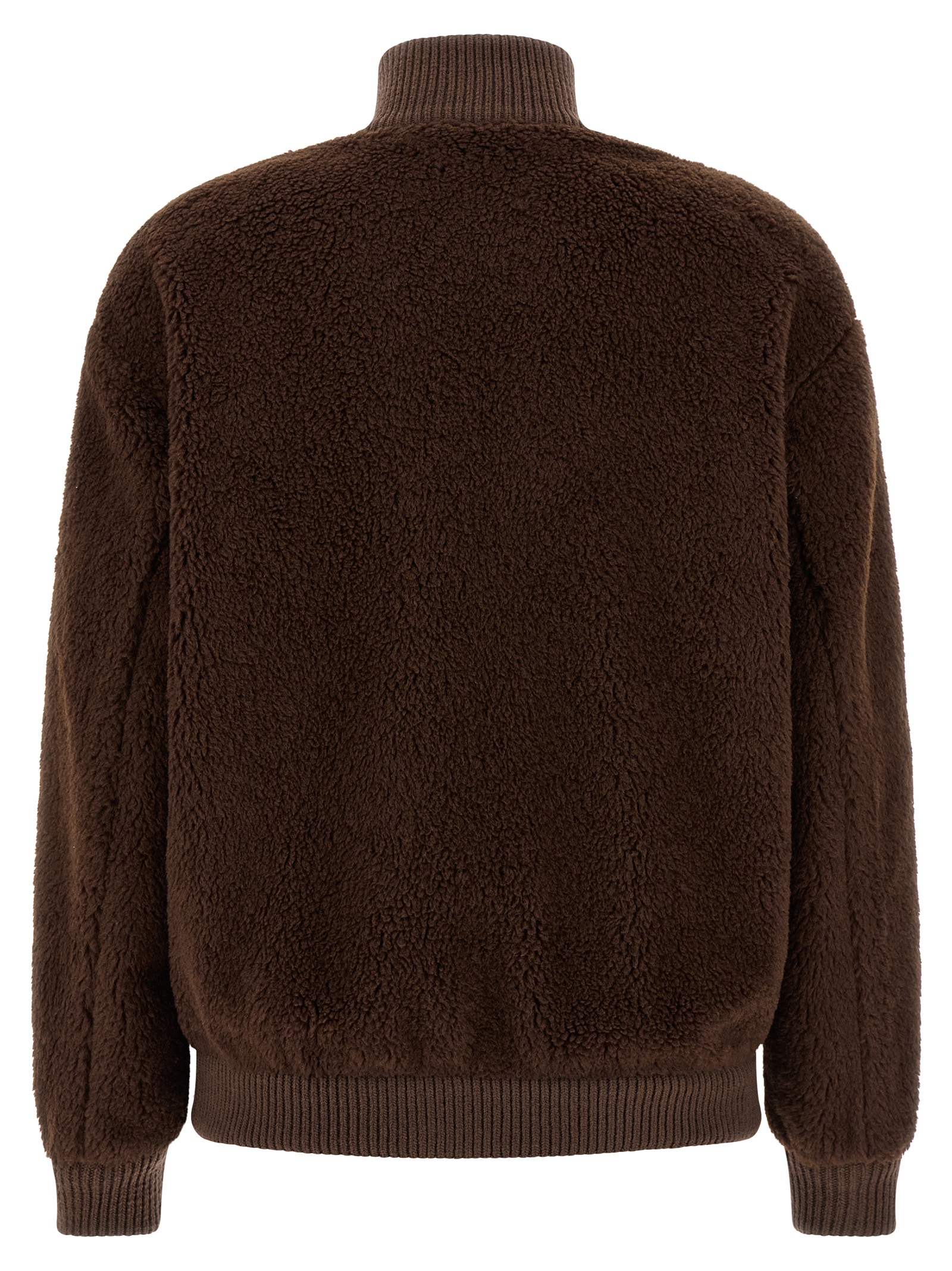 ‘Teddy’ effect fur jacket, ribbed knit collar and cuffs, front logo patch, pockets, front zip closure, long sleeves.