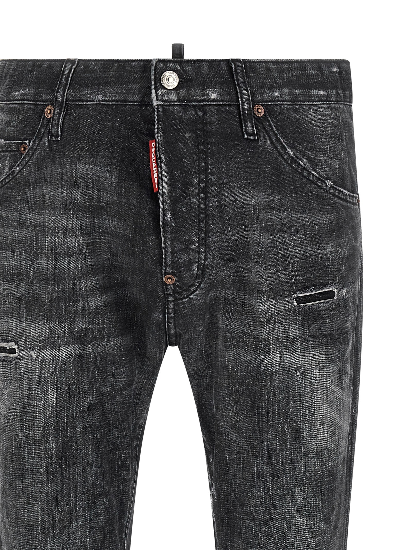 5-pocket ‘Teddy’ used-effect wash cotton denim jeans, medium waist, narrow leg, front button closure, leather back logo tag detail.