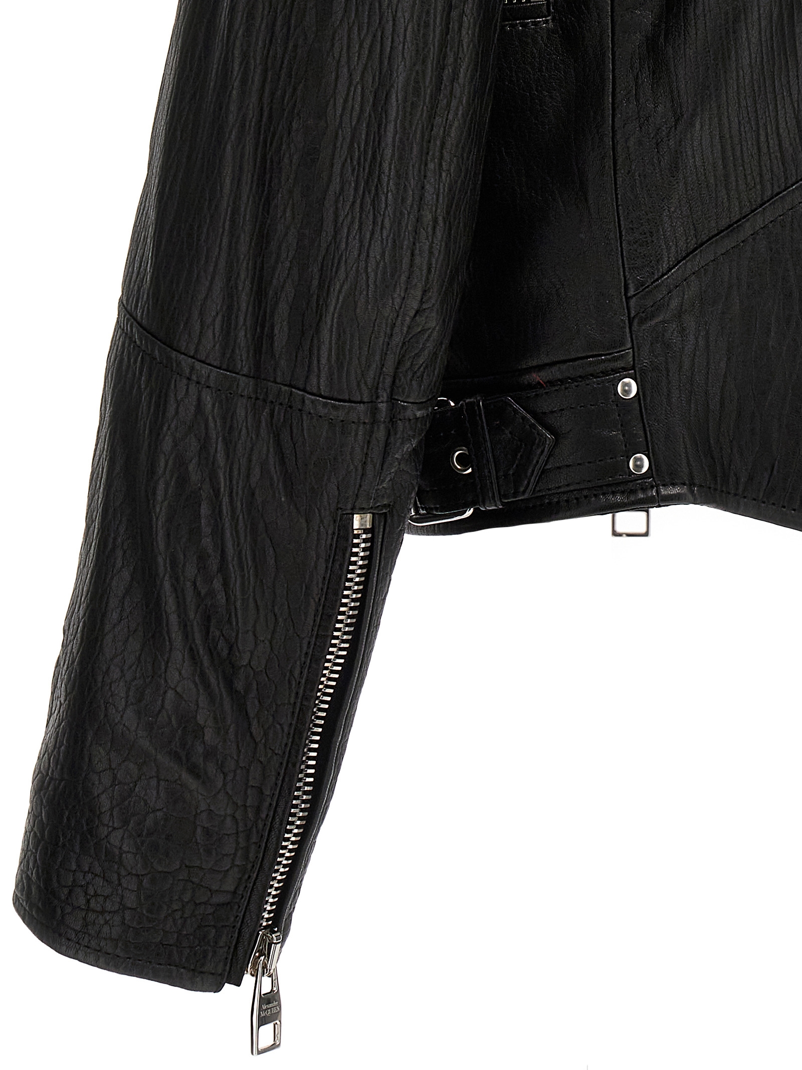 Leather jacket with texture, zip closure, pockets and long sleeves.