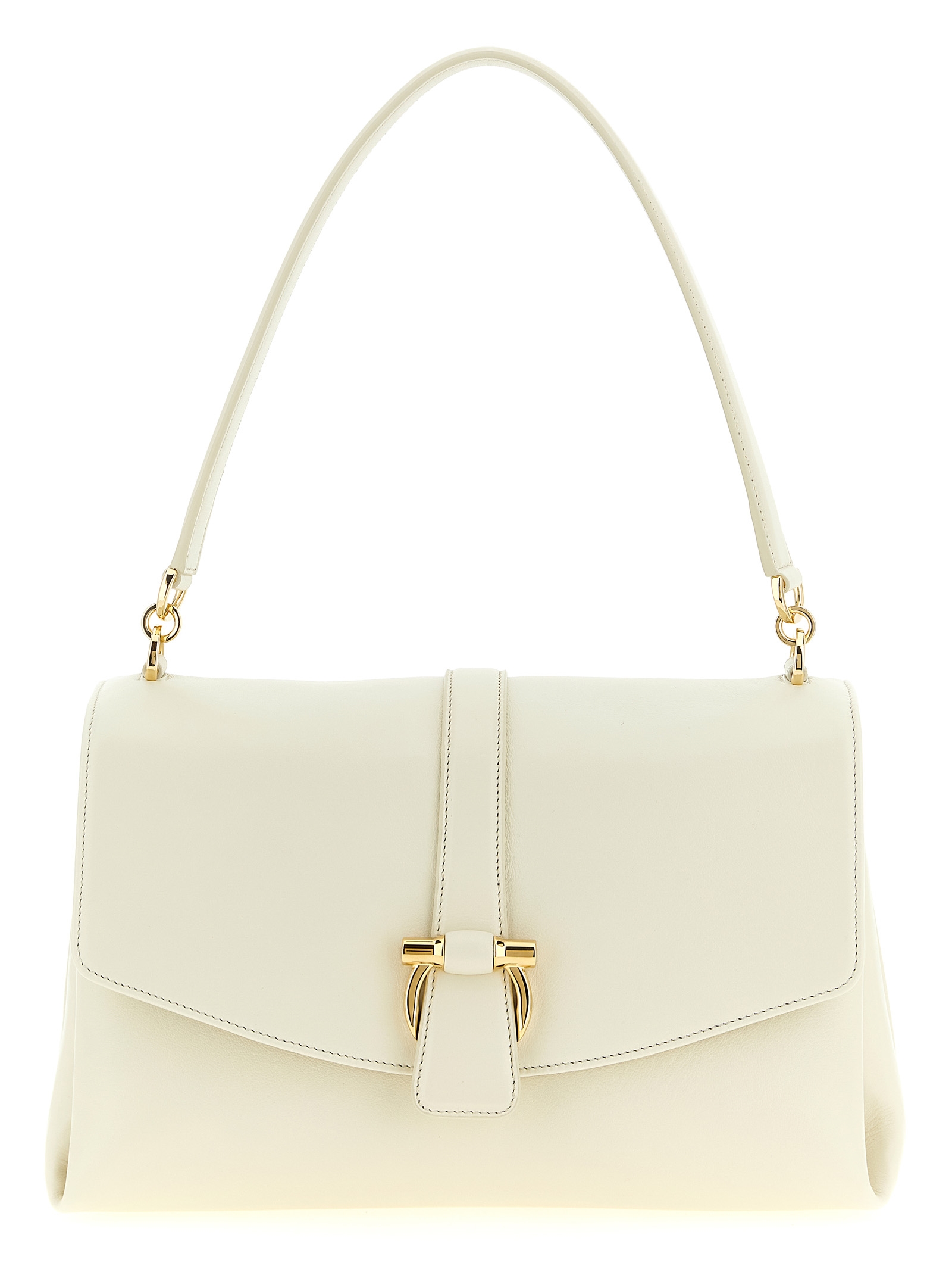 ‘TH (M)’ shoulder bag in calf leather, magnetic flap closure with front ‘Gancini’ detail, side gussets, fixed handle, adjustable and removable shoulder strap.