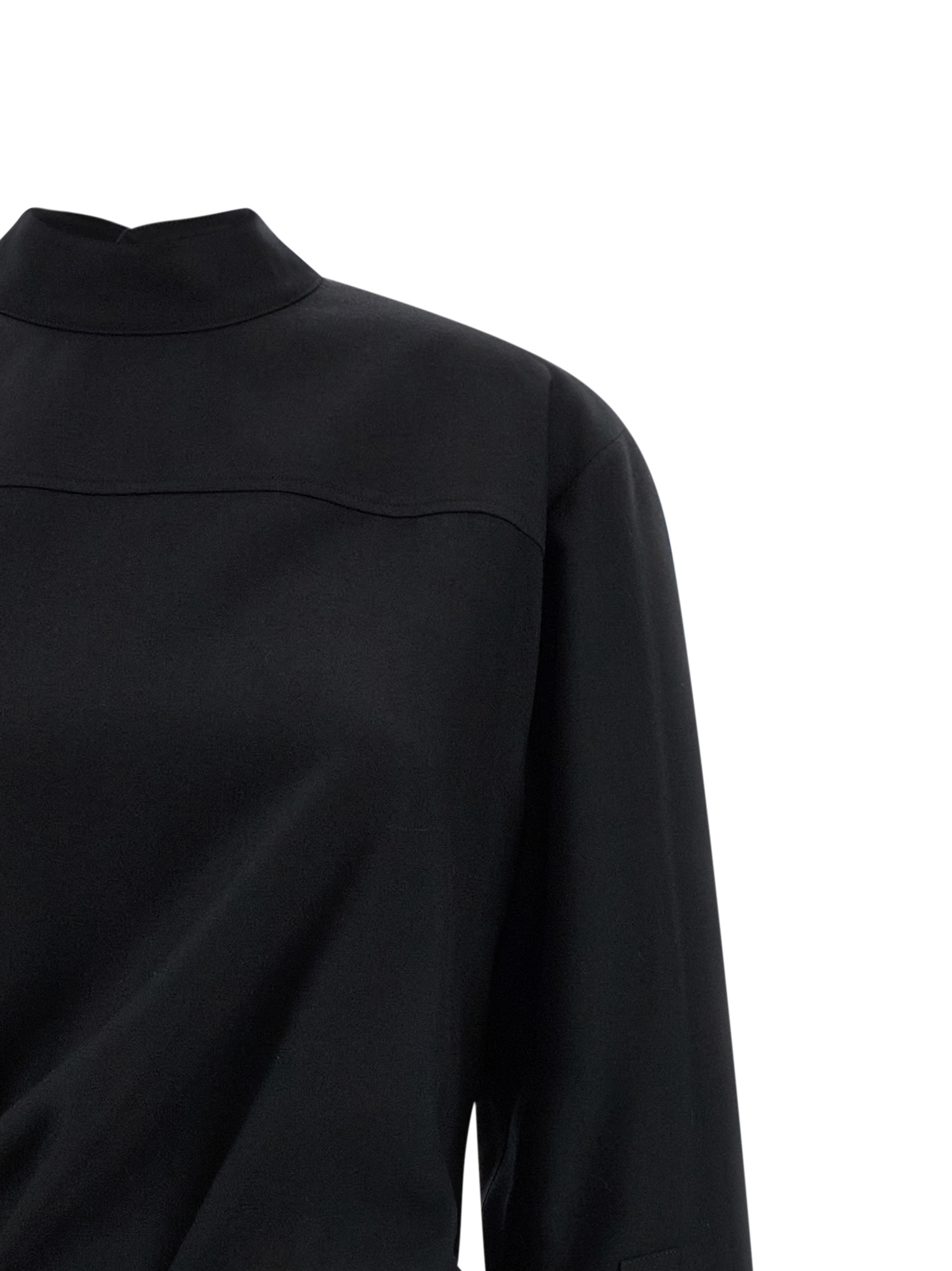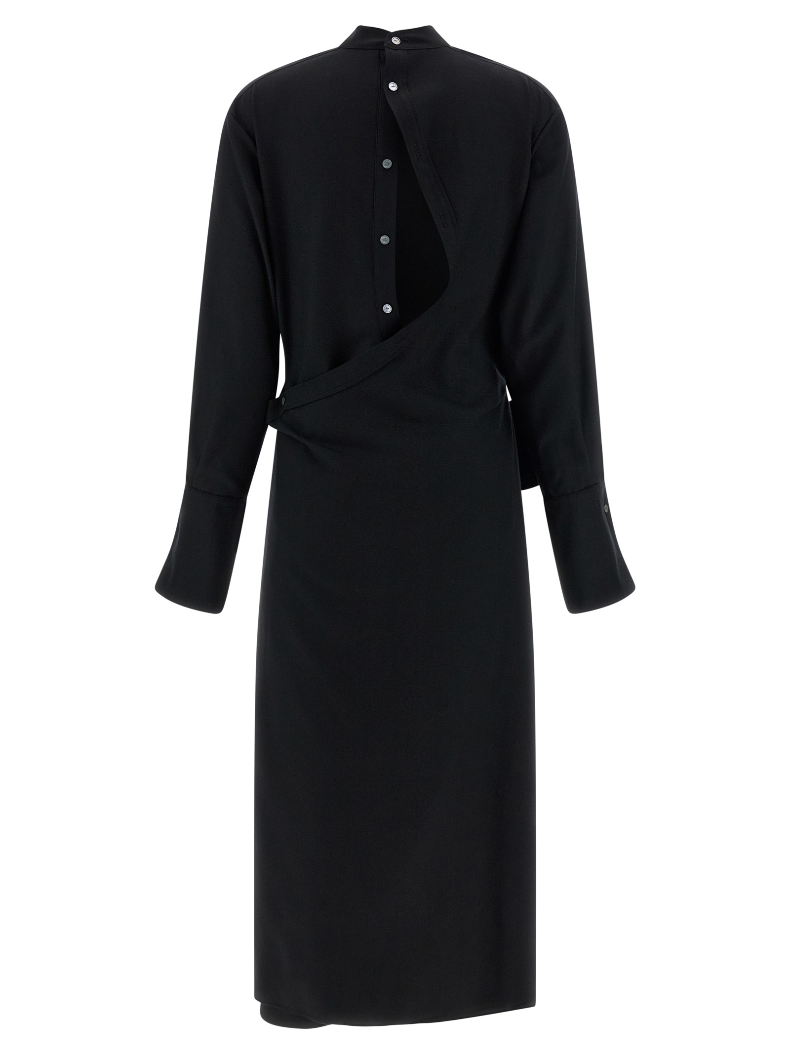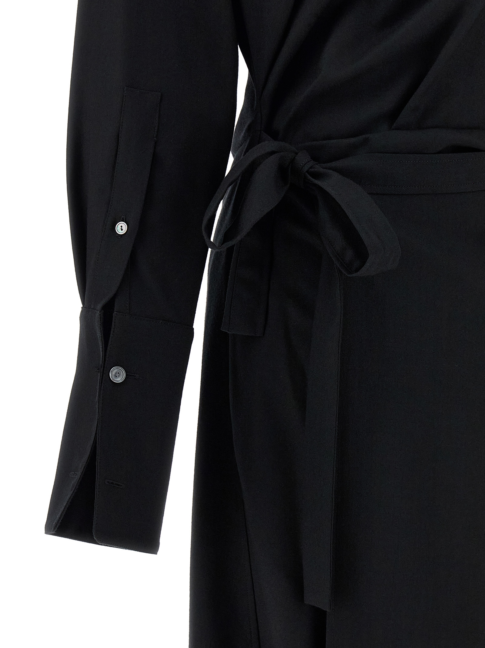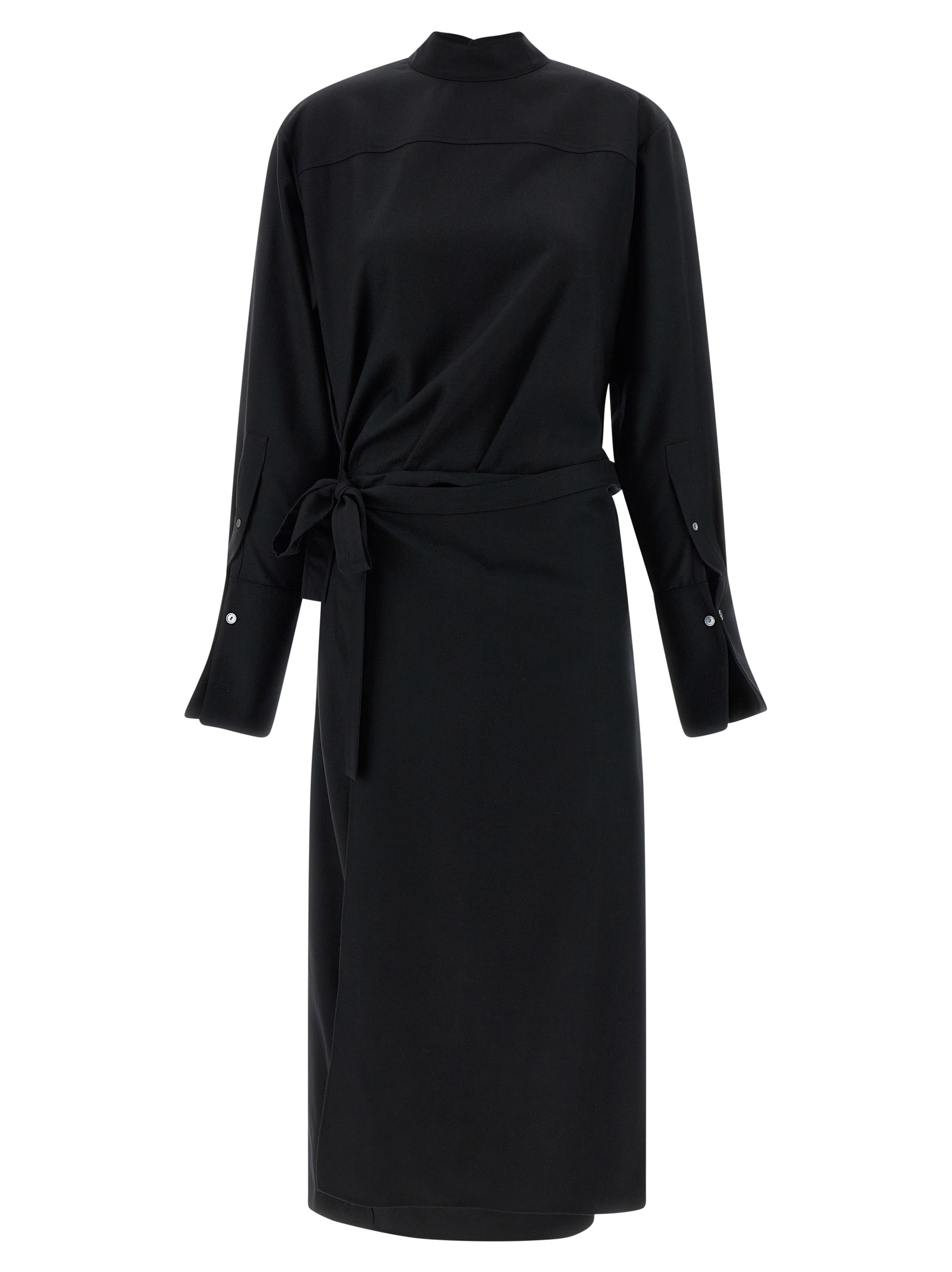 Thalassa’ virgin wool flannel midi dress with silk lining, chemisier style, high neck, back button closure, long sleeves with wide cuffs and dropped shoulders, wallet skirt with side laces.
