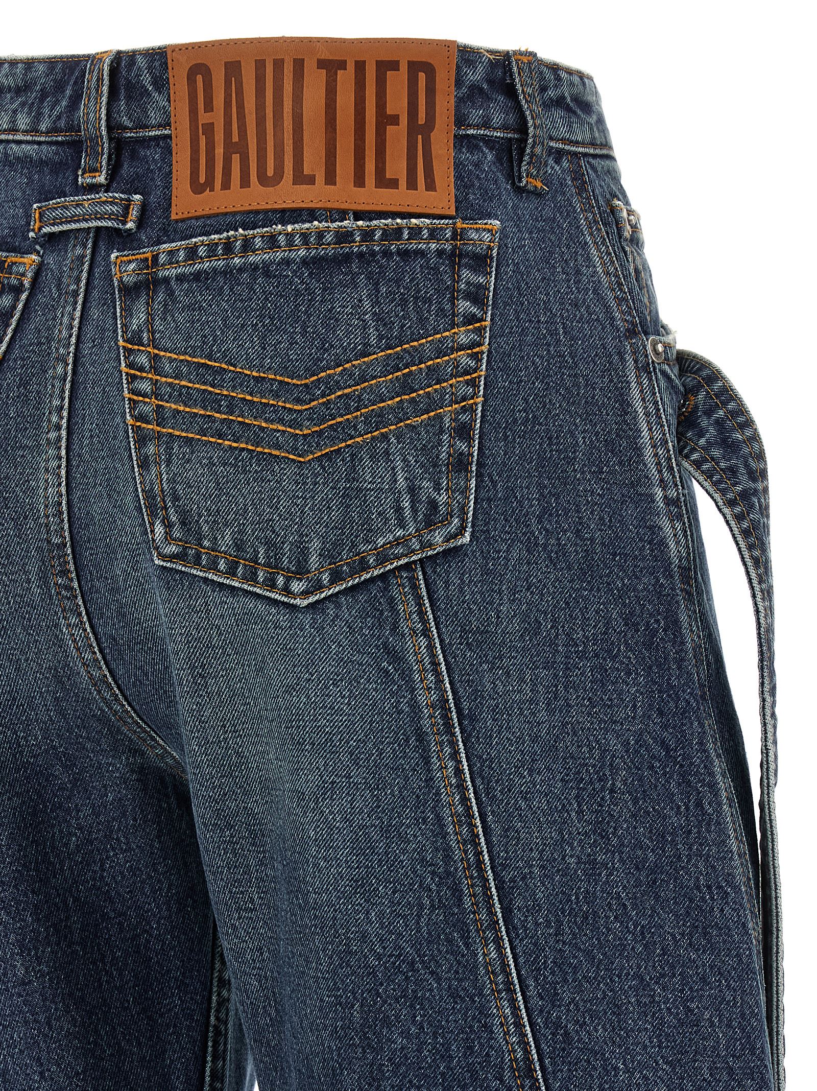 ‘The Blue Denim Strap’ cotton denim jeans with strap detail and front button closure, five pockets, wide barrel leg, five pockets, back logo tag.
