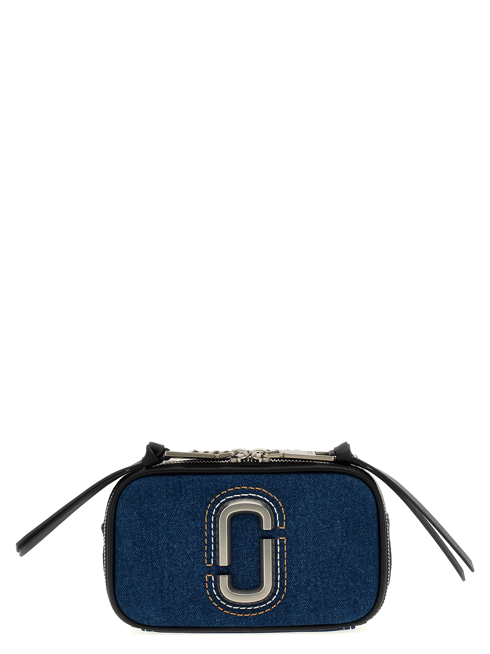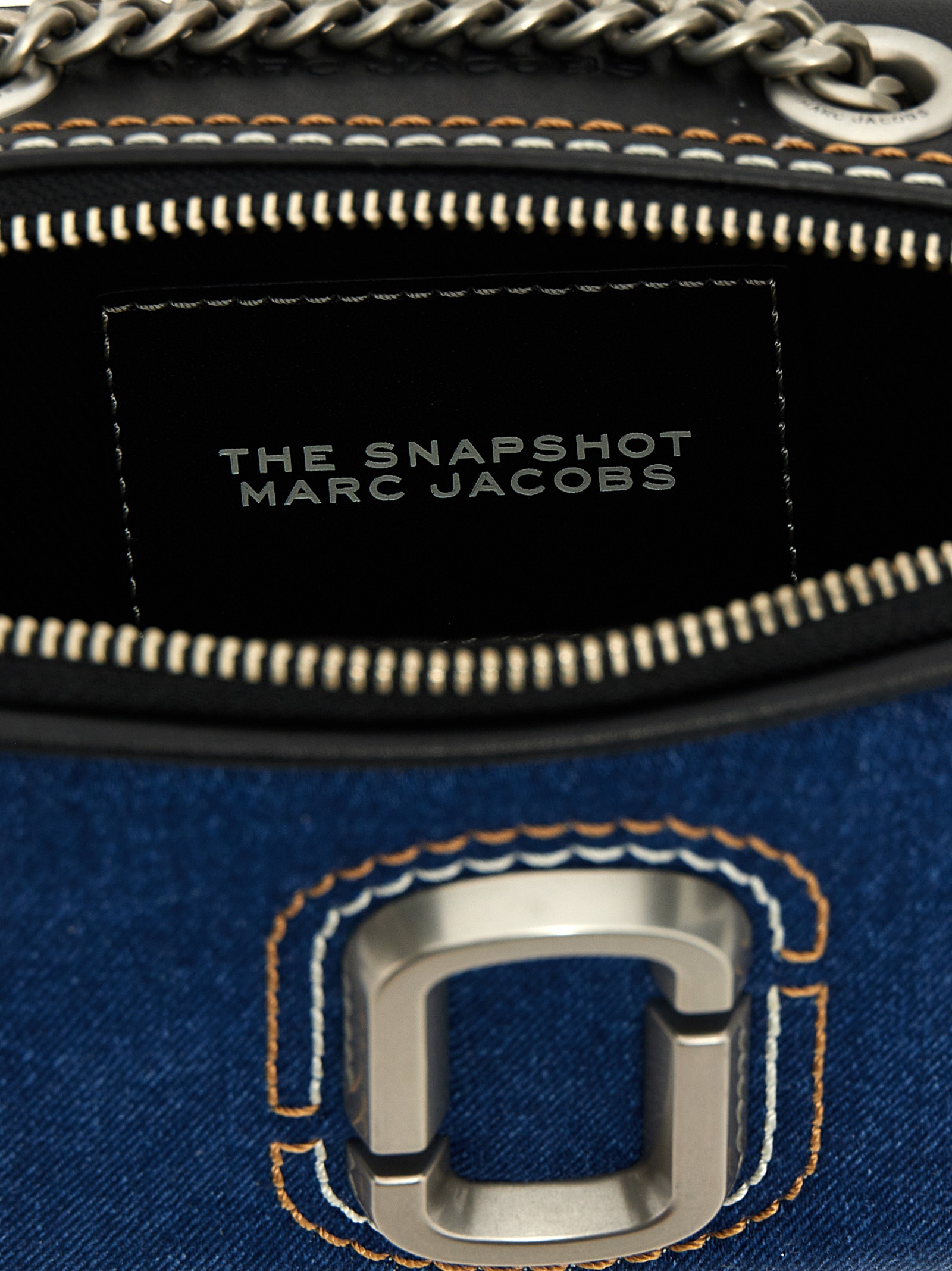 ‘The Denim Chain Snapshot’ cotton and leather denim crossbody bag with contrast stitching details, front metal logo, zip closure, sliding chain shoulder strap.