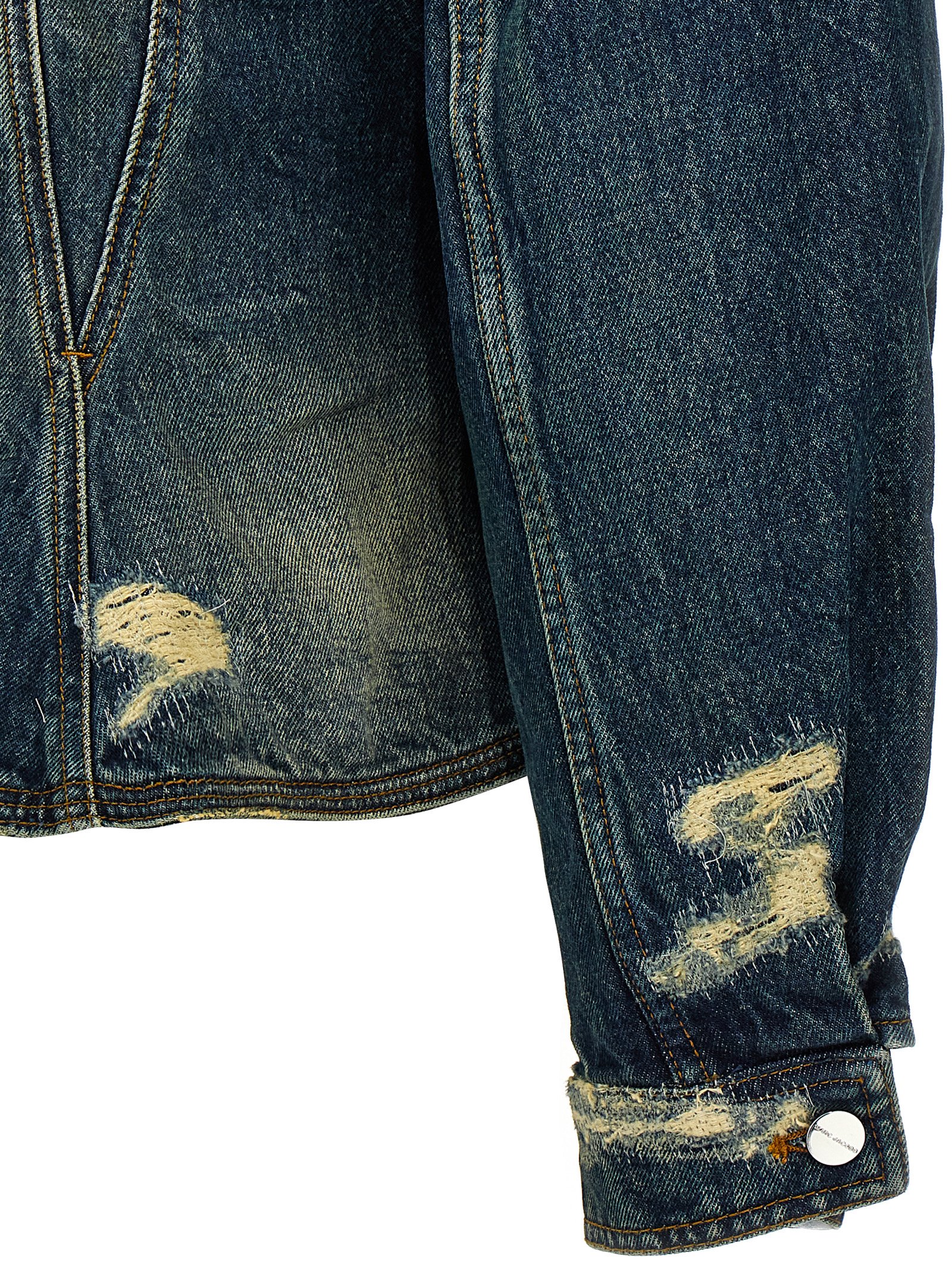The Rip And Repair Fluted Denim Jacket’ cotton denim jacket with all-over Rip and Repair effect, narrow waist and flared hem, button closure, pockets, back metal logo, long cuffed sleeves.