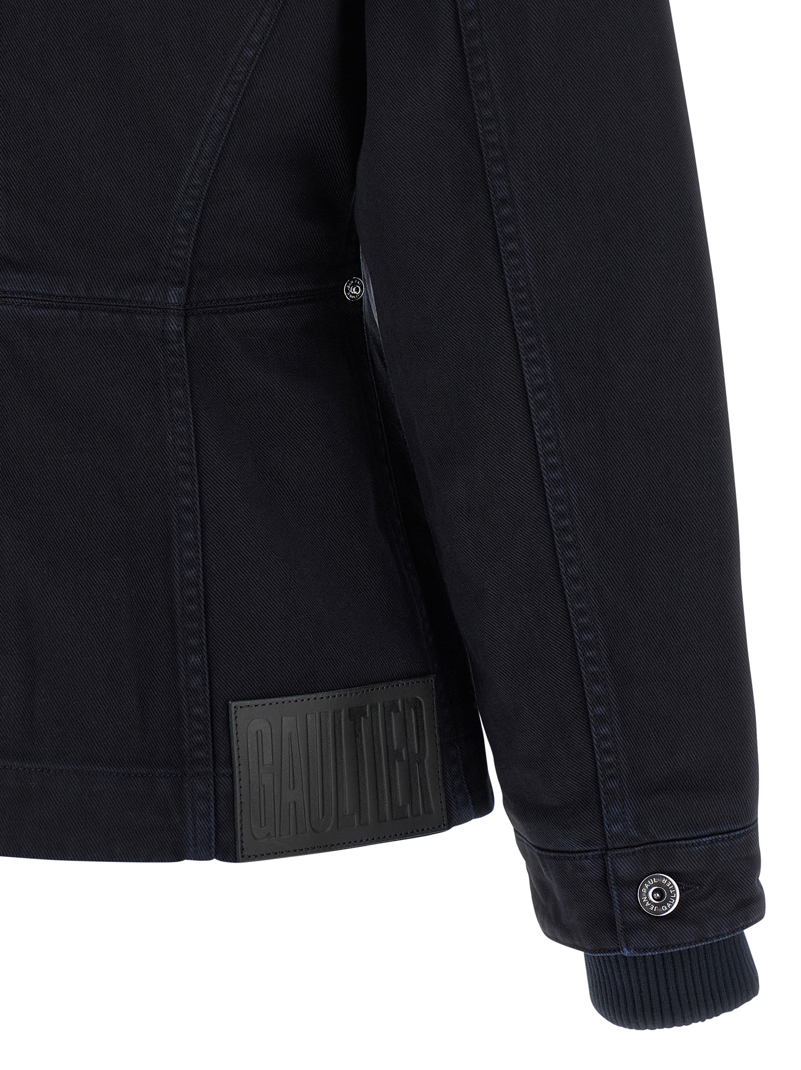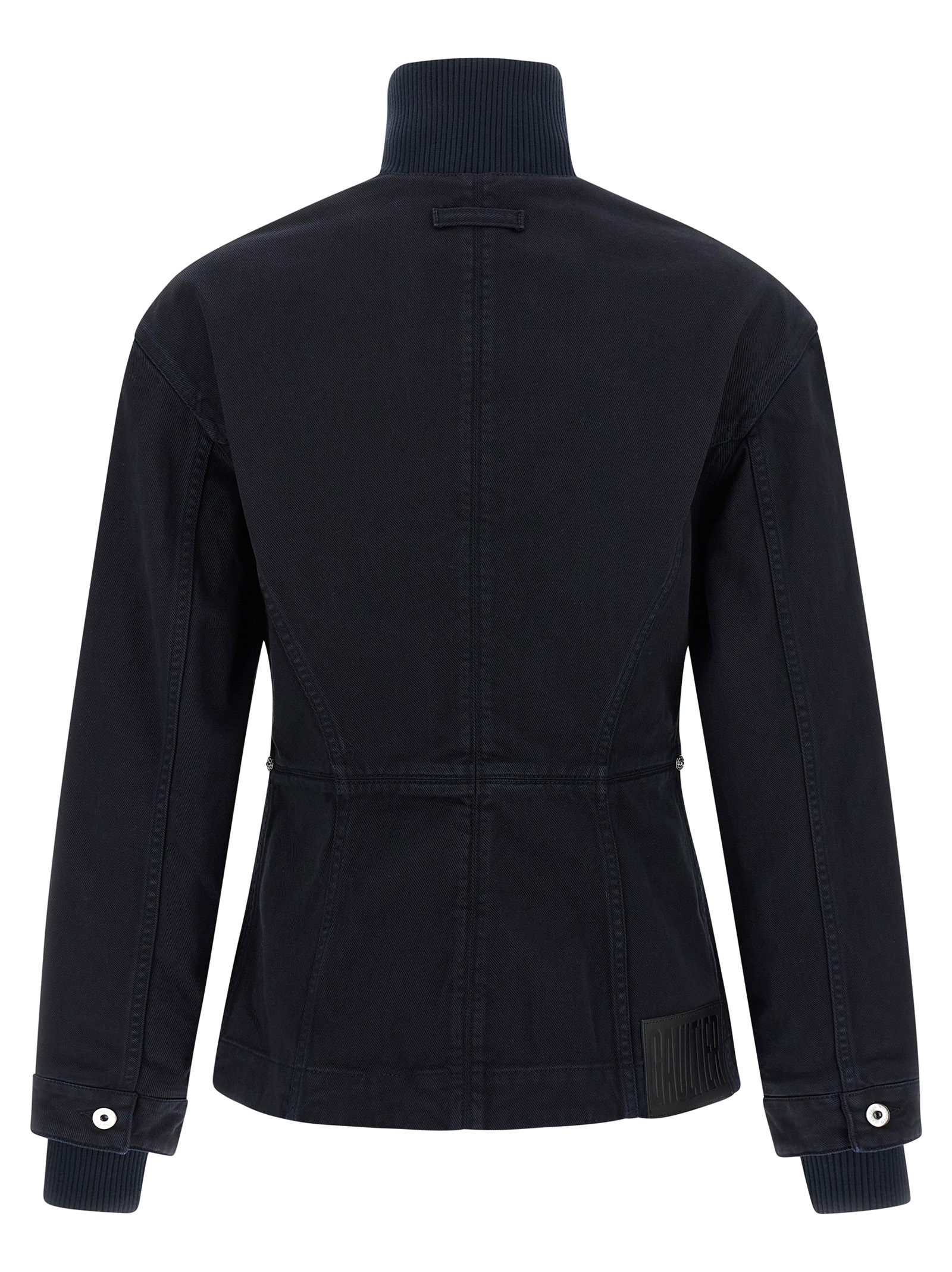 The Slit Denim’ cotton denim jacket with stretch ribbed knit details, zip closure and front splits, hourglass silhouette, pockets, long sleeves with double layer cuffs and dropped shoulders, back logo tag.