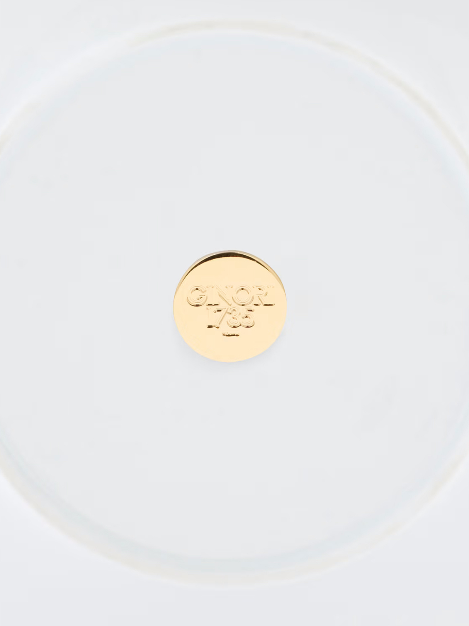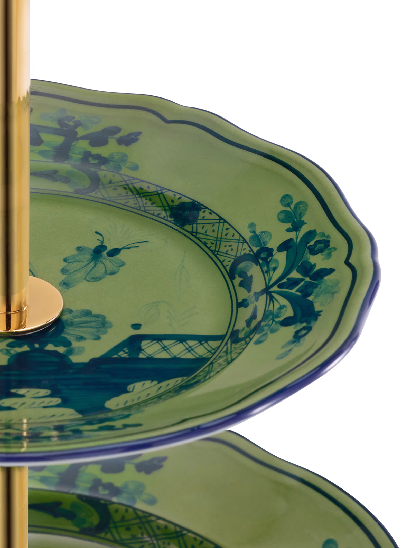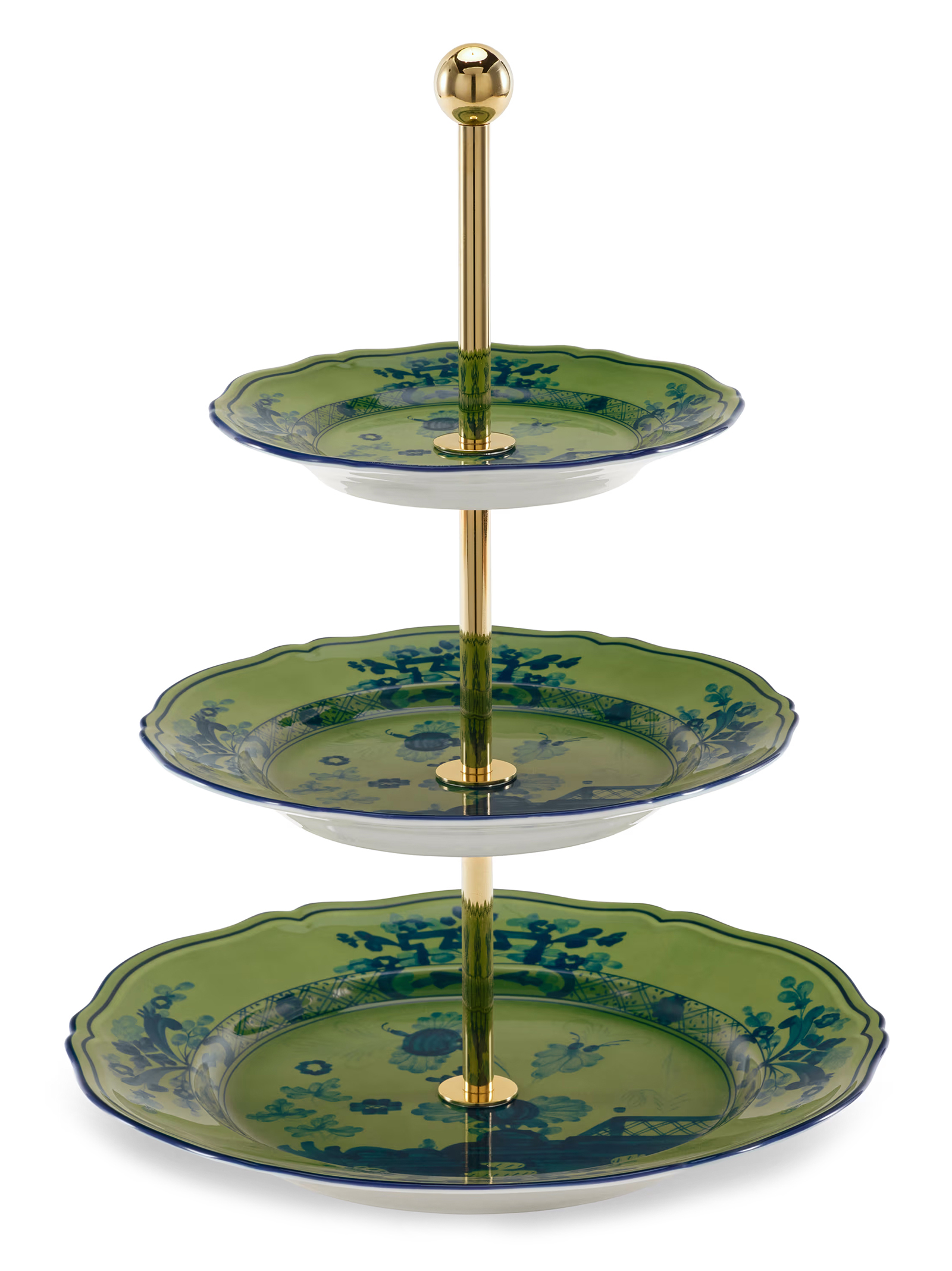 Three-storey riser with Malachite green decoration and blue thread, central part in metal. ‘Oriente Italiano’ collection, ‘Antico Doccia’ shape with iconic ‘a garofano’ pattern.