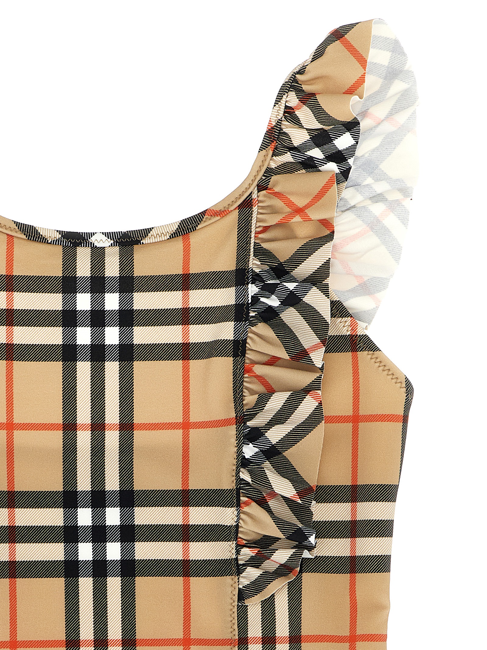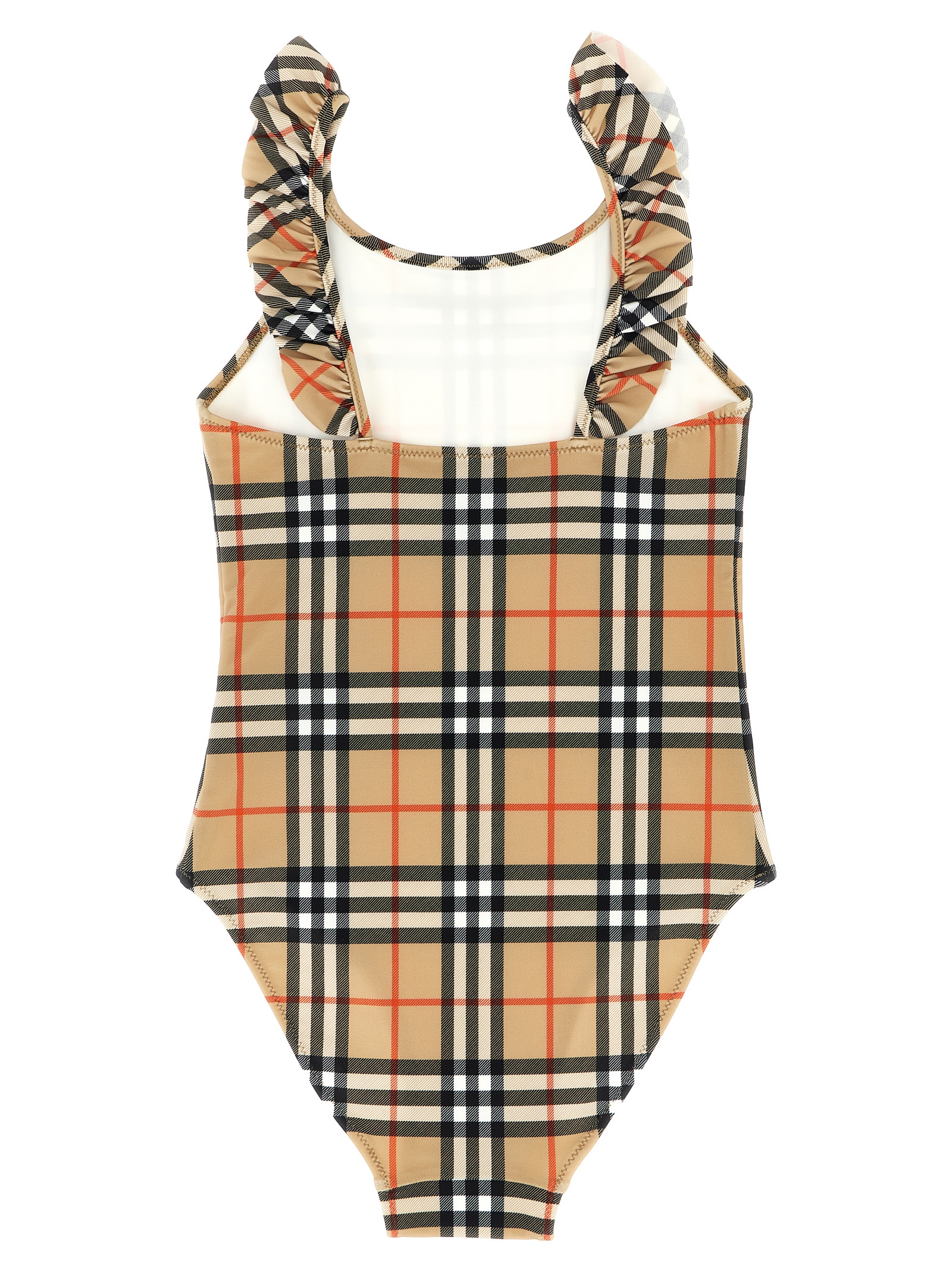 Burberry Check print stretch nylon one-piece swimsuit Tilly with ruffled shoulder straps.