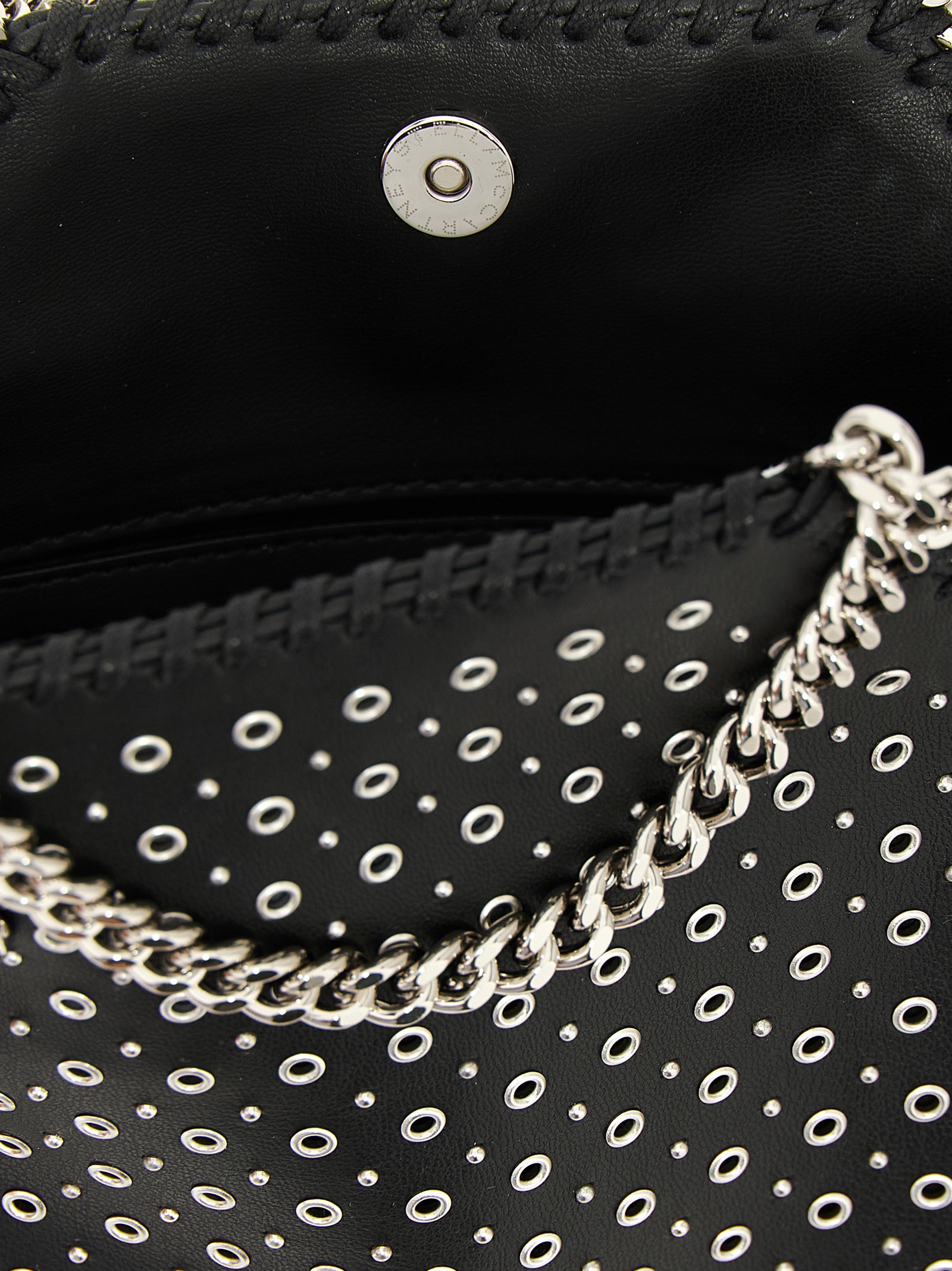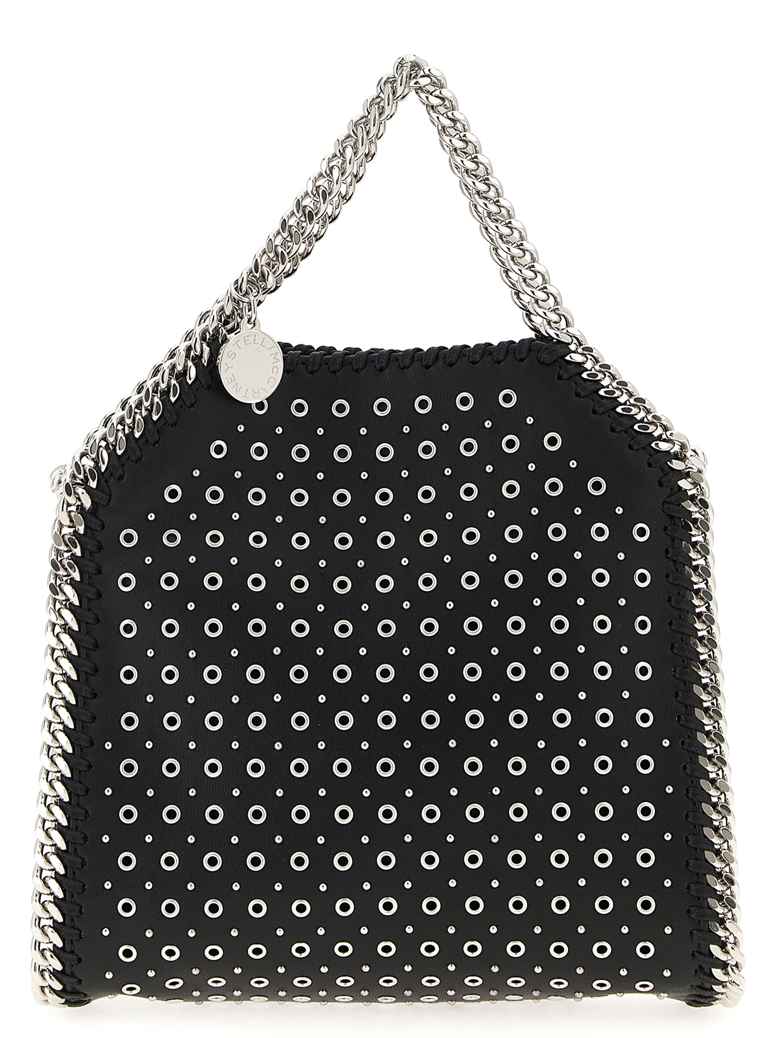 ‘Tiny Falabella’ handbag in leather-effect fabric with all-over metal studs, diamond-effect chain, double fixed handle, magnetic closure, chain shoulder strap, medallion charm with engraved logo.