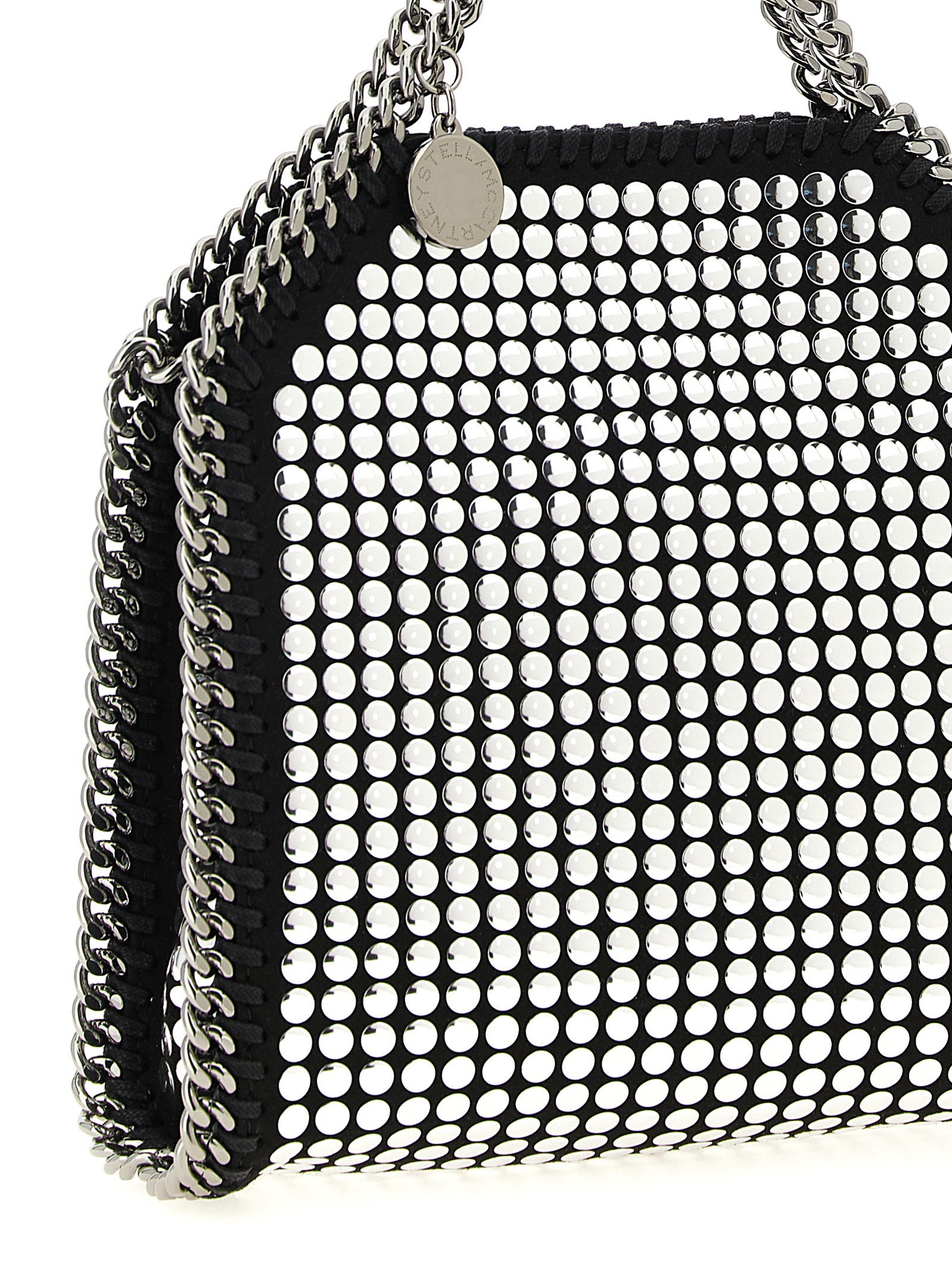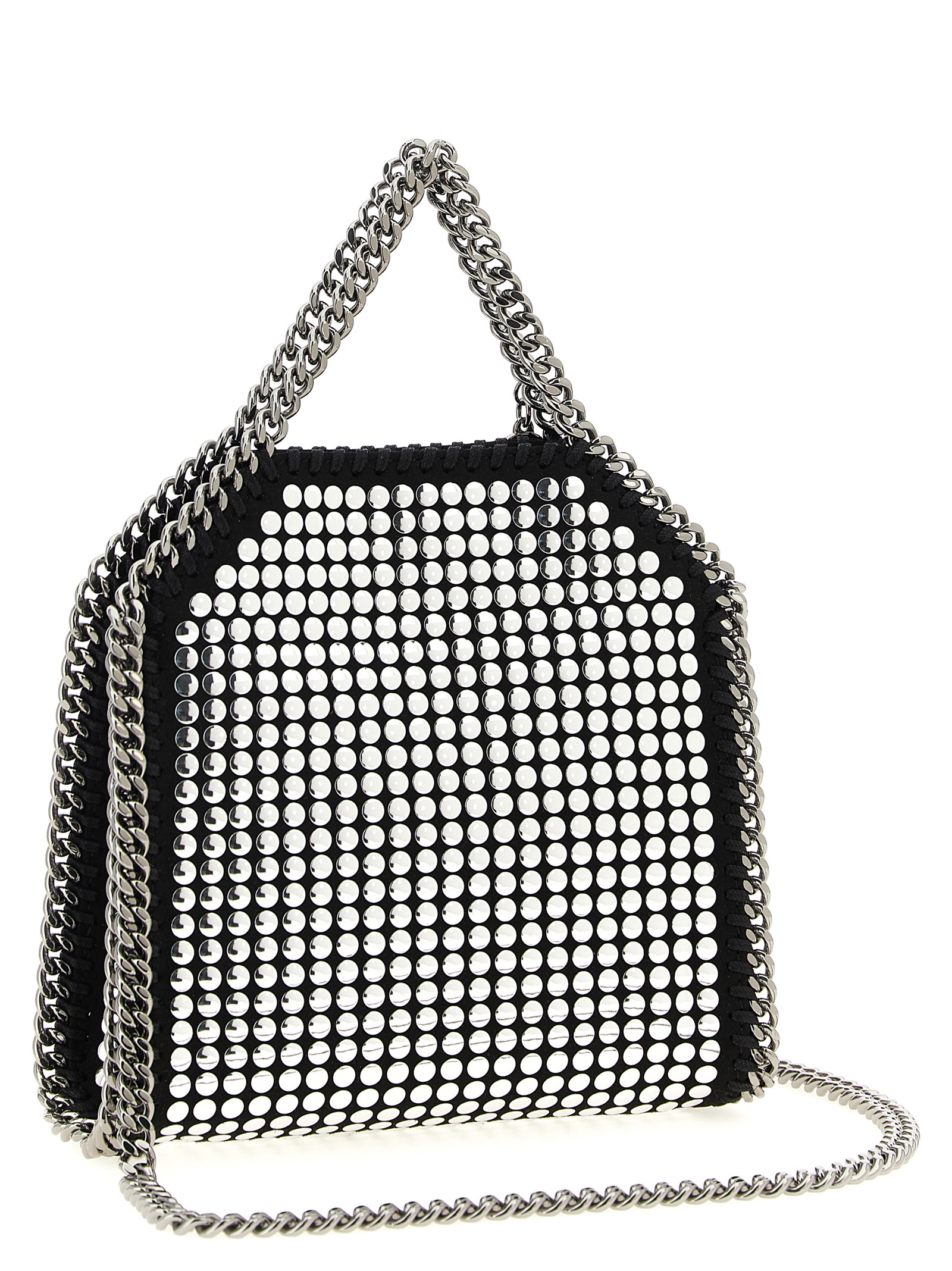 ‘Tiny Falabella’ handbag in leather-effect fabric with all-over stud appliqué, silver chain, double fixed handle, magnetic closure, chain shoulder strap, medallion charm with engraved logo.