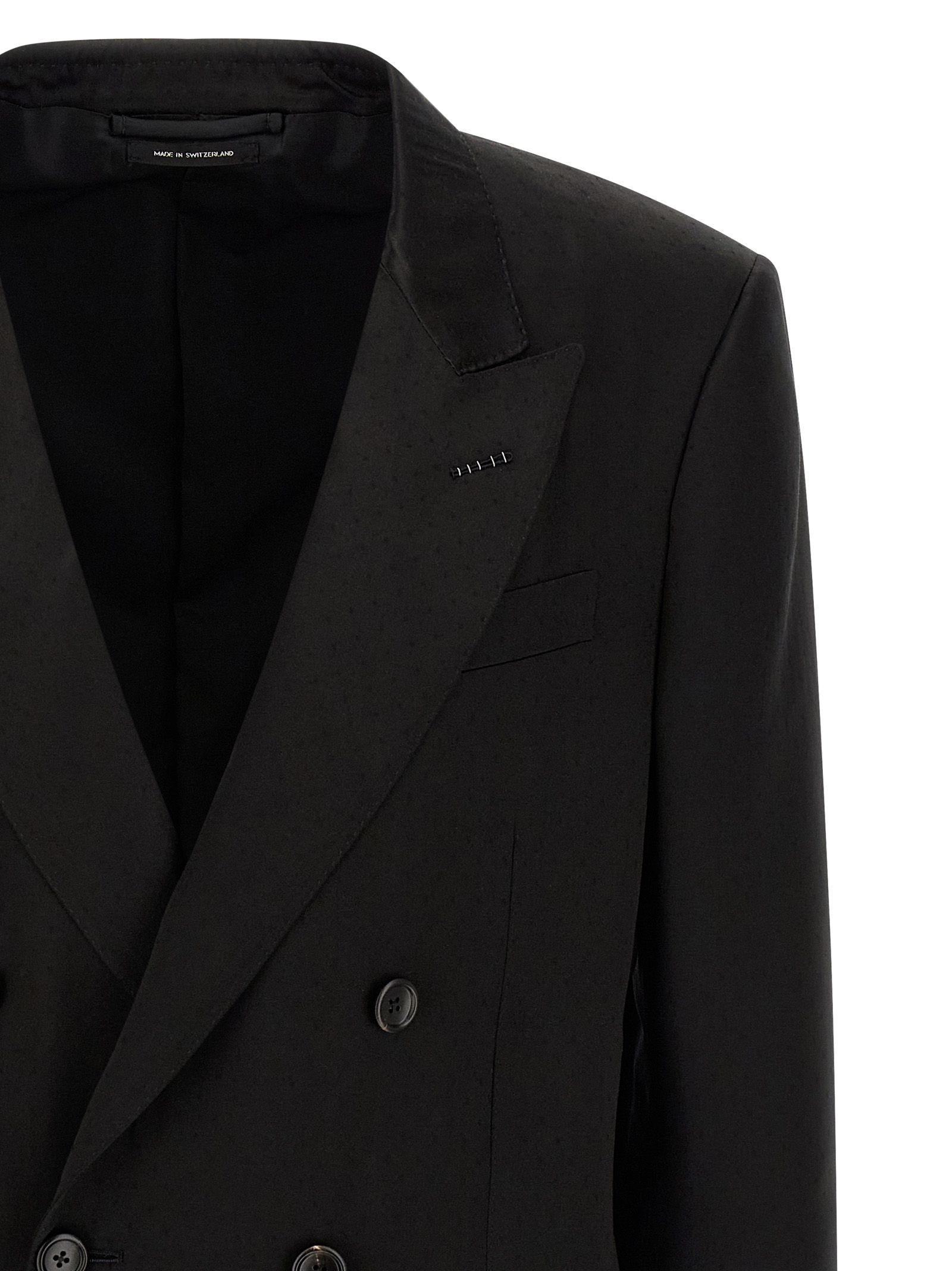 Blazer in viscose blend and glossy fluid silk with tone-on-tone micro polka dot pattern, double-breasted style with front horn button closure, peak lapels, breast pocket, flap pockets, structured shoulder strap, cuffs with open buttonholes, back slits, cupro and silk blend lining, and three inner pockets.
