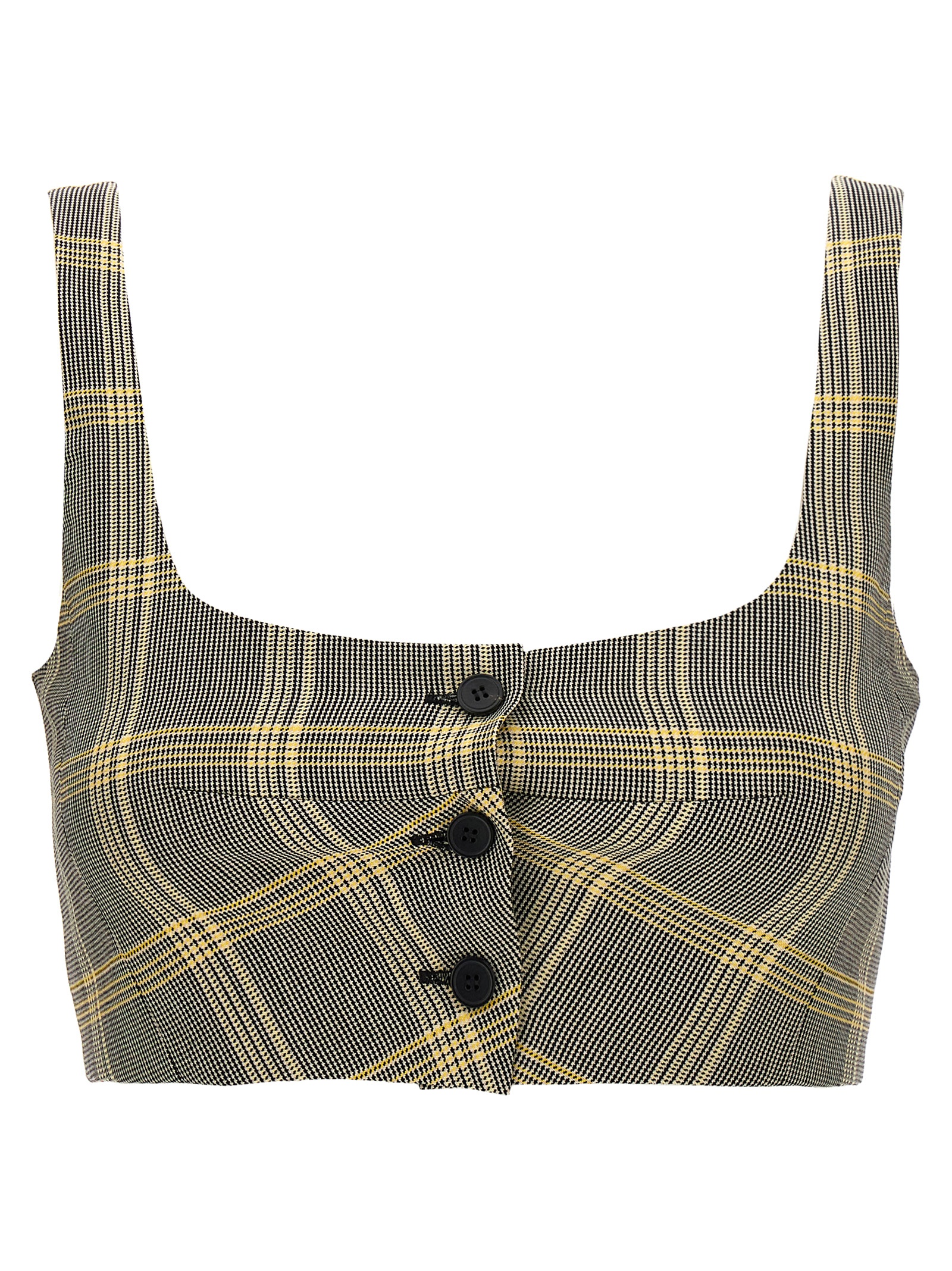 Check print wool blend cropped top, front button closure.