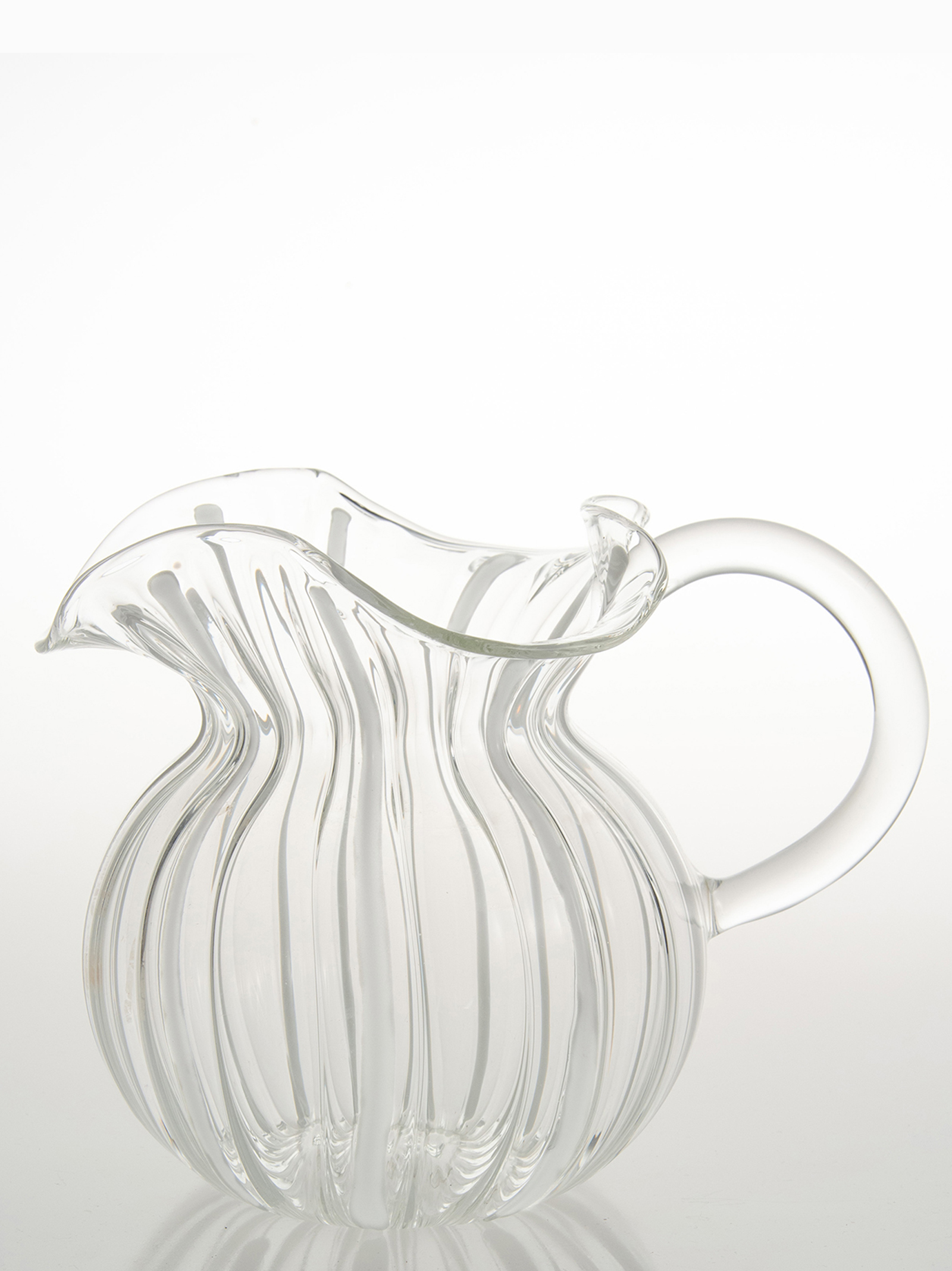 ‘Torcello’ jug in mouth-blown borosilicate glass. Decorated manually with colored glass rods spread in flame.