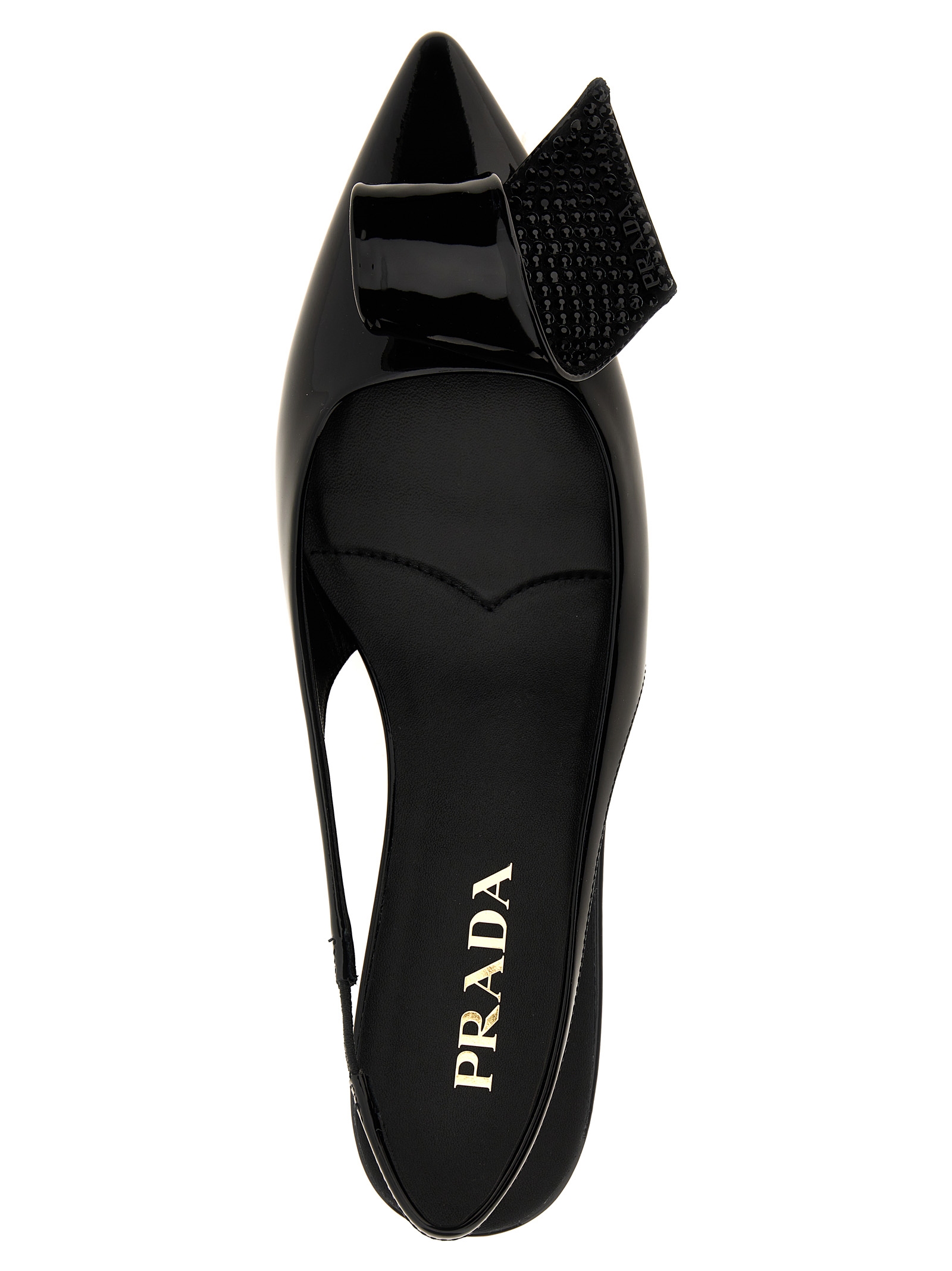 ‘Torchon’ patent leather slingback, patent leather and satin application with crystals, leather sole.