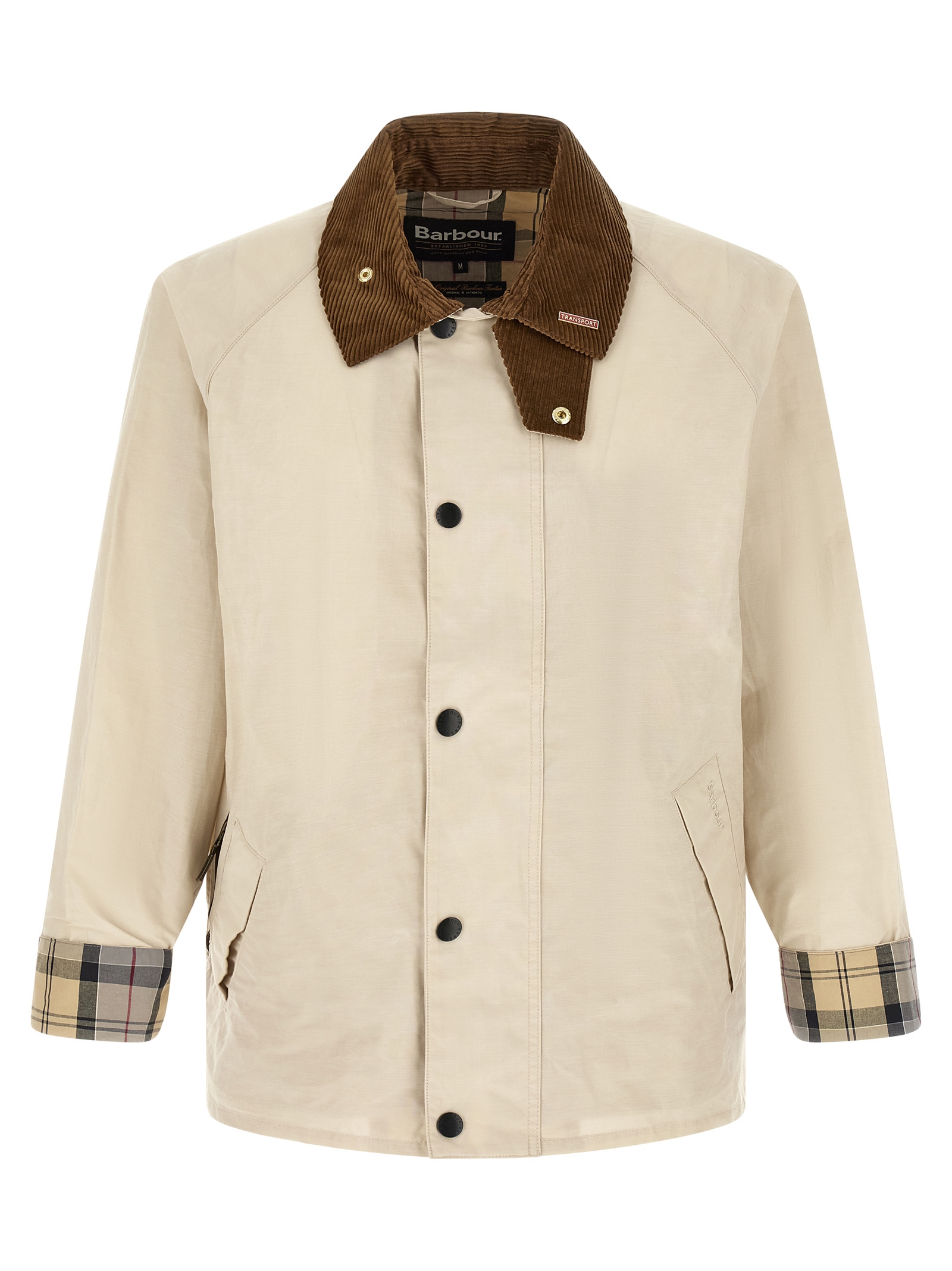 ‘Transporter Icons’ cotton blend jacket with contrast corduroy shirt collar with chinstrap, removable metal brooch and tartan under collar, tone-on-tone logo embroidery and front zip and snap button closure, pockets, long raglan sleeves with foldable cuffs, tone-on-tone logo patch on the back, tartan half lining.
