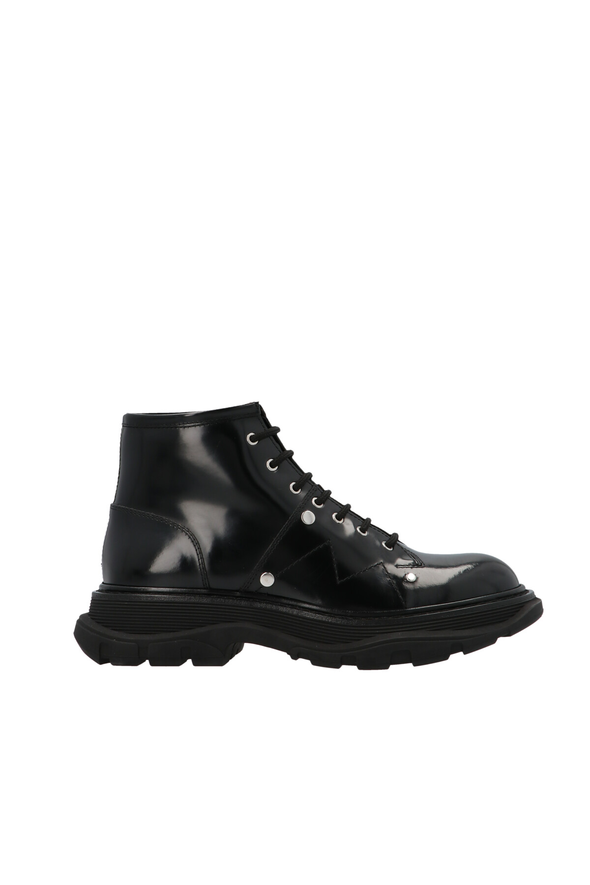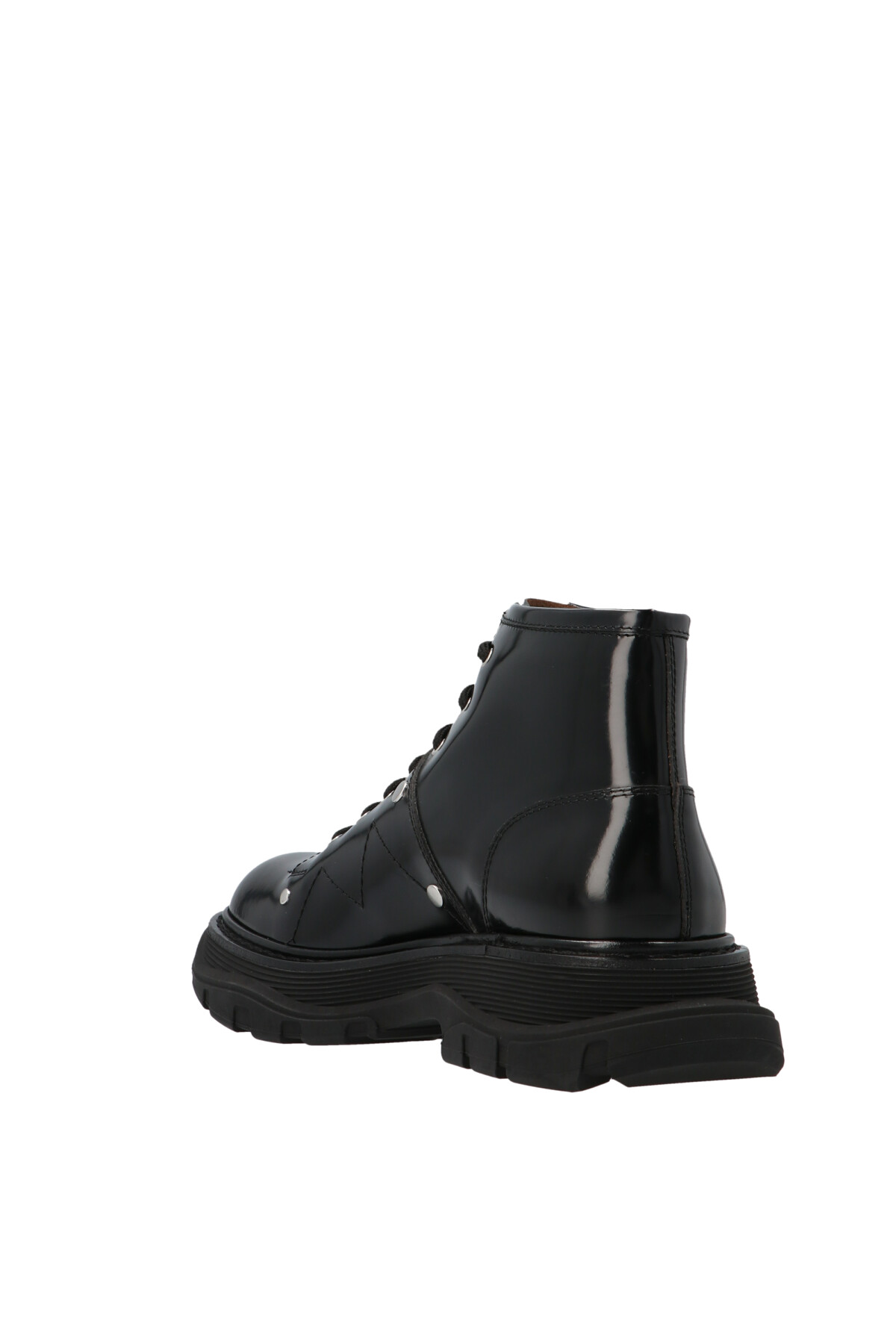 Alexander McQueen leather ankle boots featuring contrasting stitching and an oversize rubber sole, and laces.