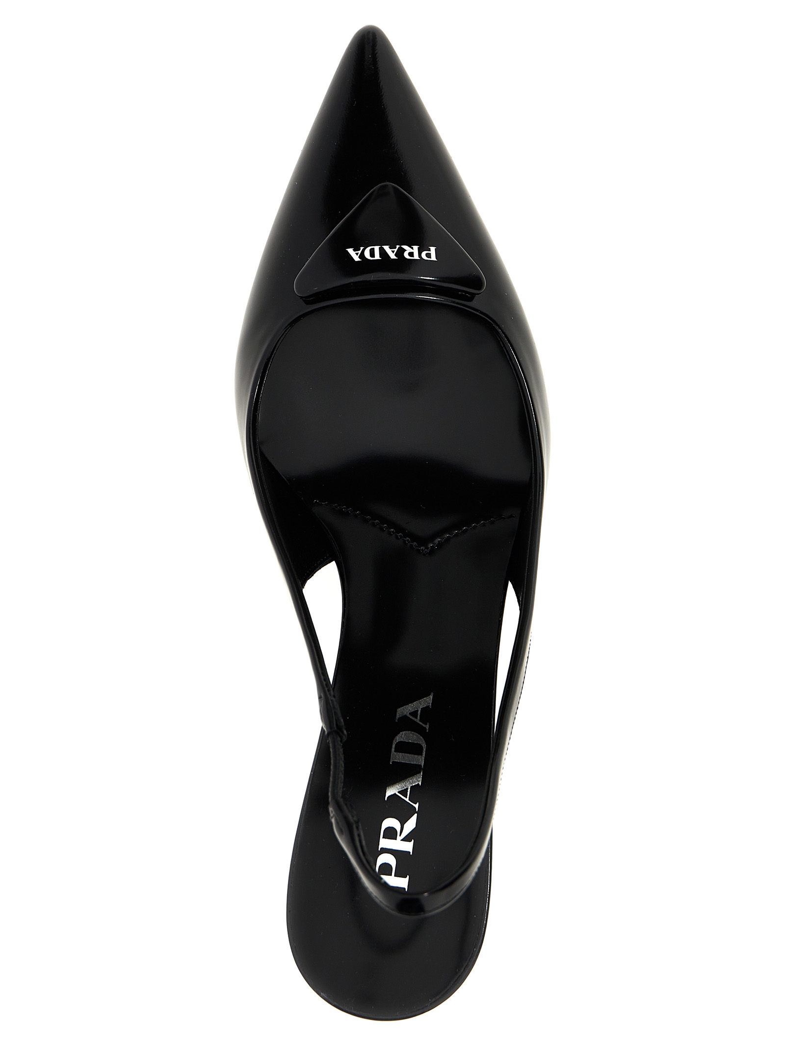 Leather slingbacks with triangle leather logo application on the front, elastic strap, sculptural heel.