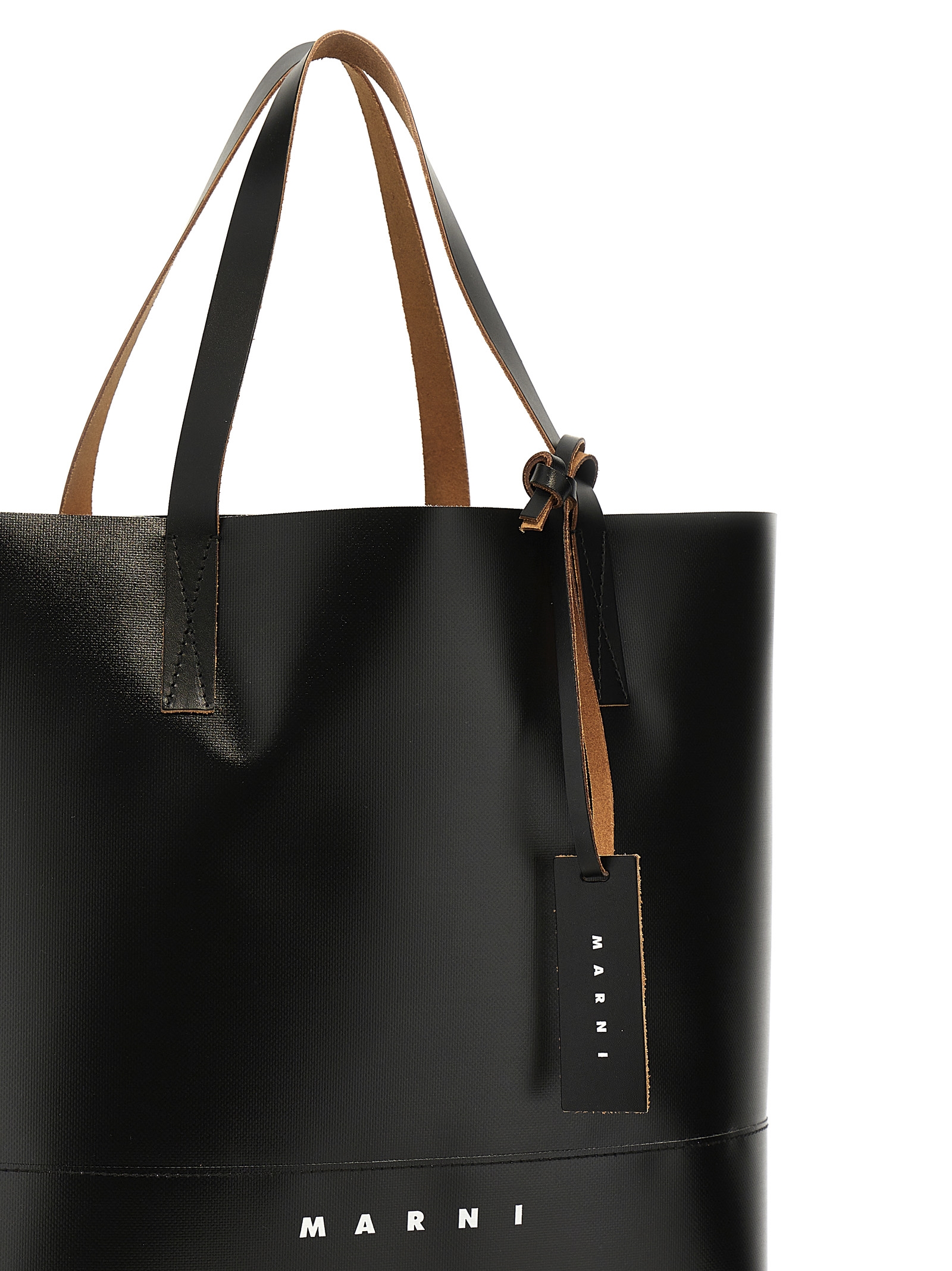 ‘Tribeca’ plastic shopping bag, front pocket with logo print, double leather handle, leather logo charm.