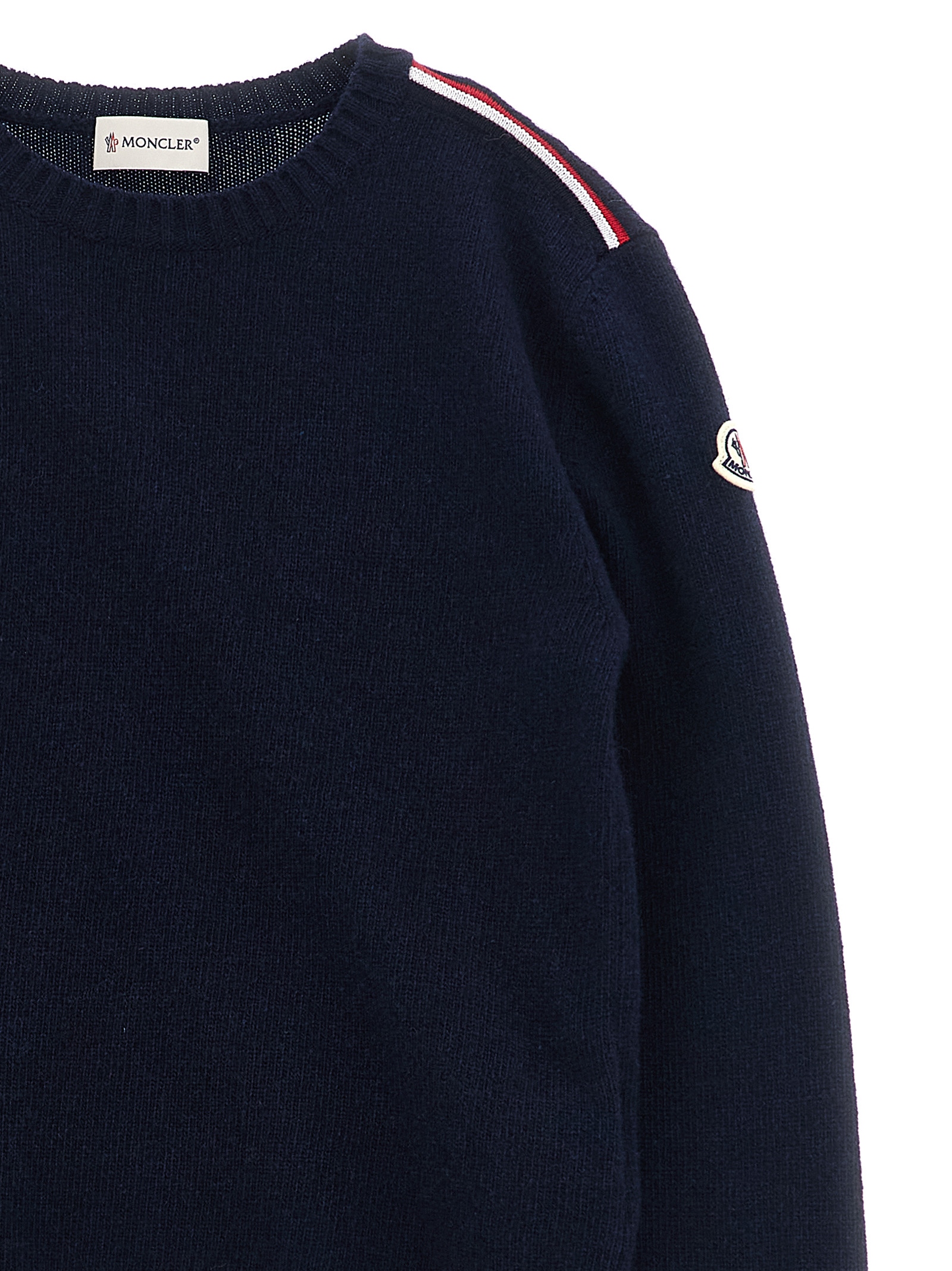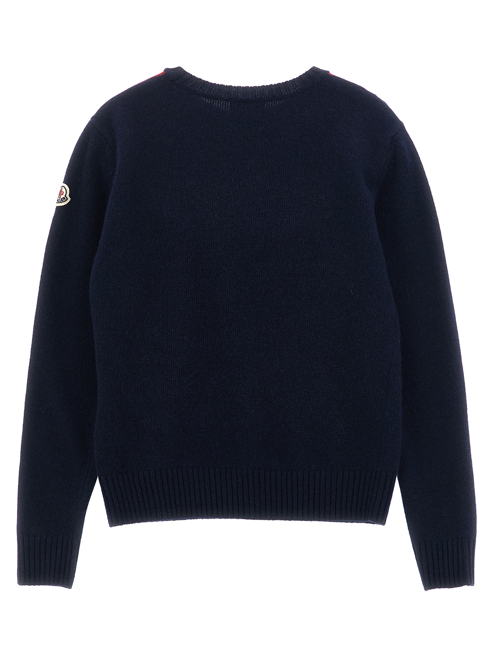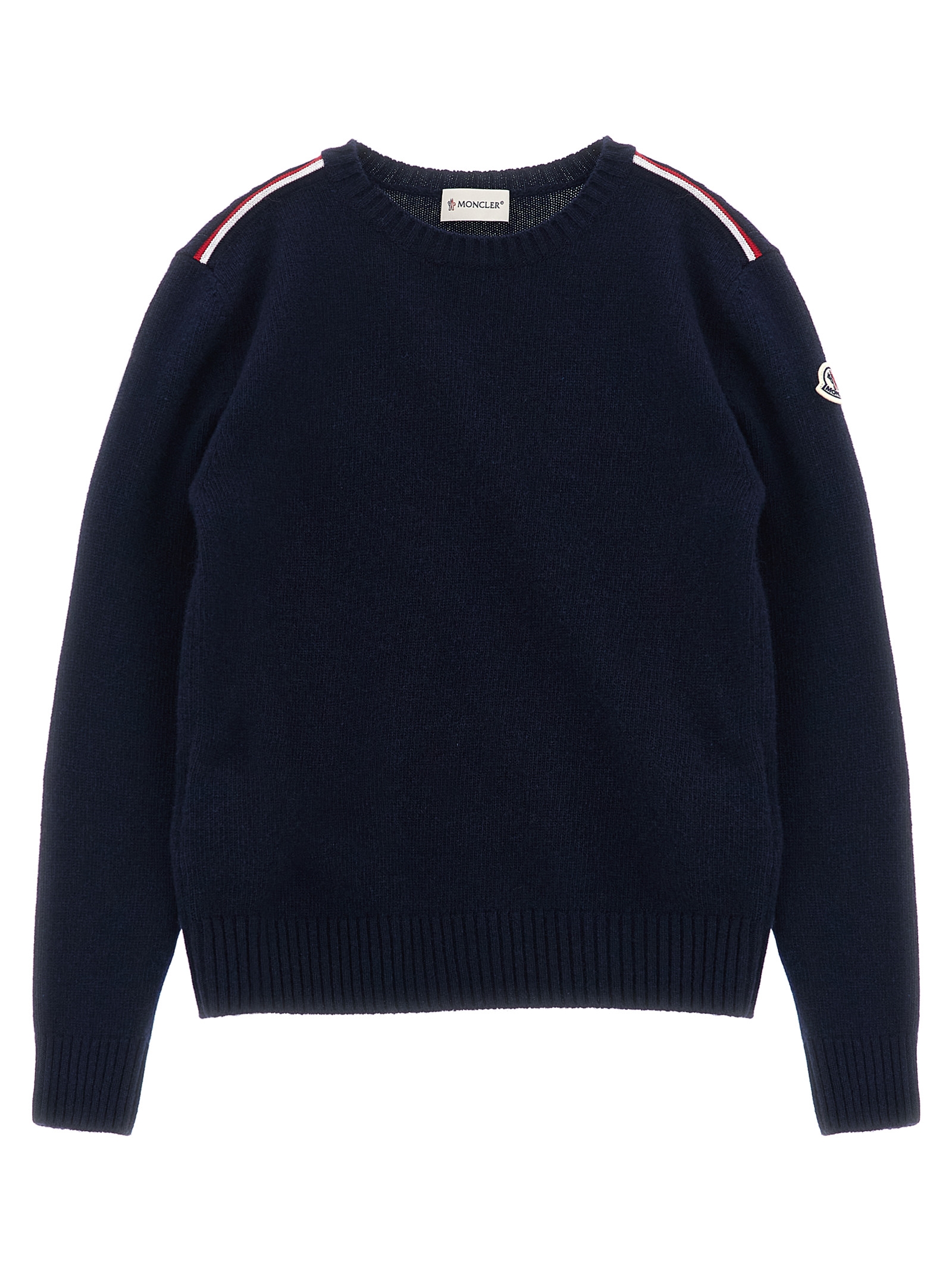 7 fineness carded wool sweater with tricolor jacquard detail on the shoulders, crew neck, long cuffed sleeves and felt logo patch appliqué.