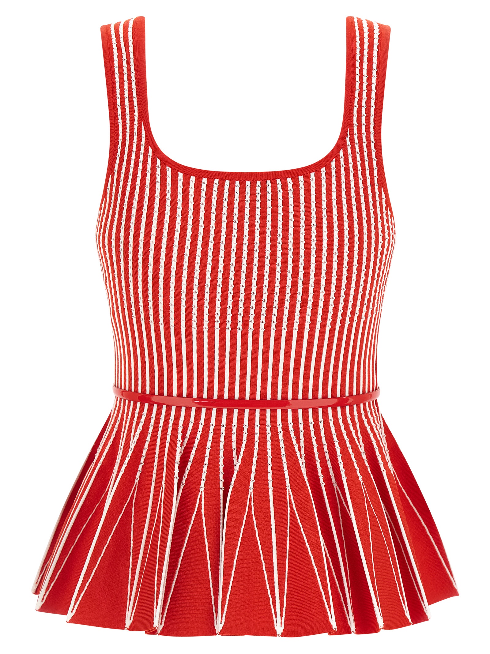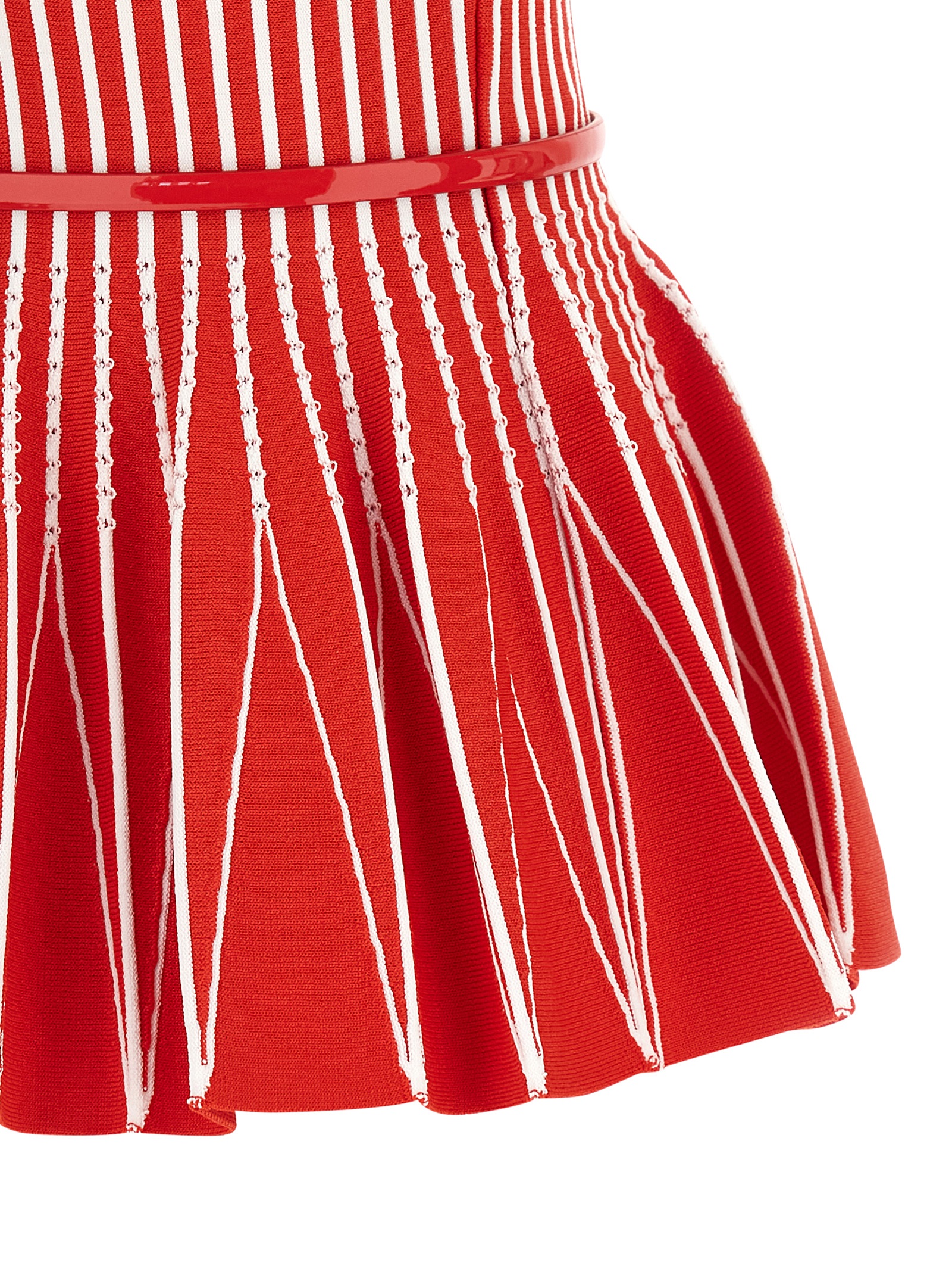 Striped tricot viscose blend top with round neckline at the front and back, wide shoulder strap, flared and pleated hem, adjustable and removable leather belt.
