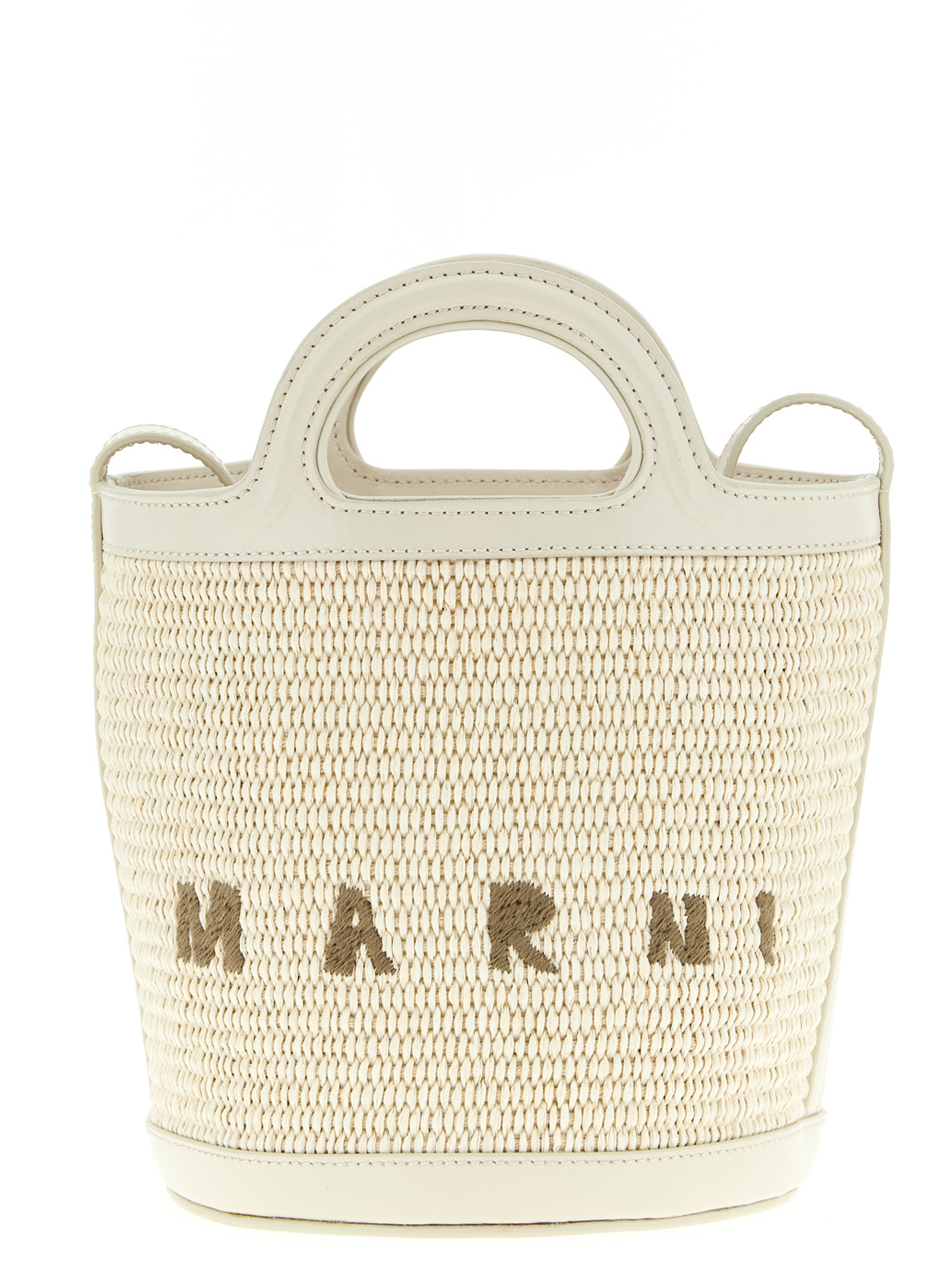 Small ‘Tropicalia’ bucket bag in woven raffia-effect fabric and smooth leather, contrast front logo embroidery, inner bag with drawstring, double fixed handle, rigid hem, adjustable shoulder strap.