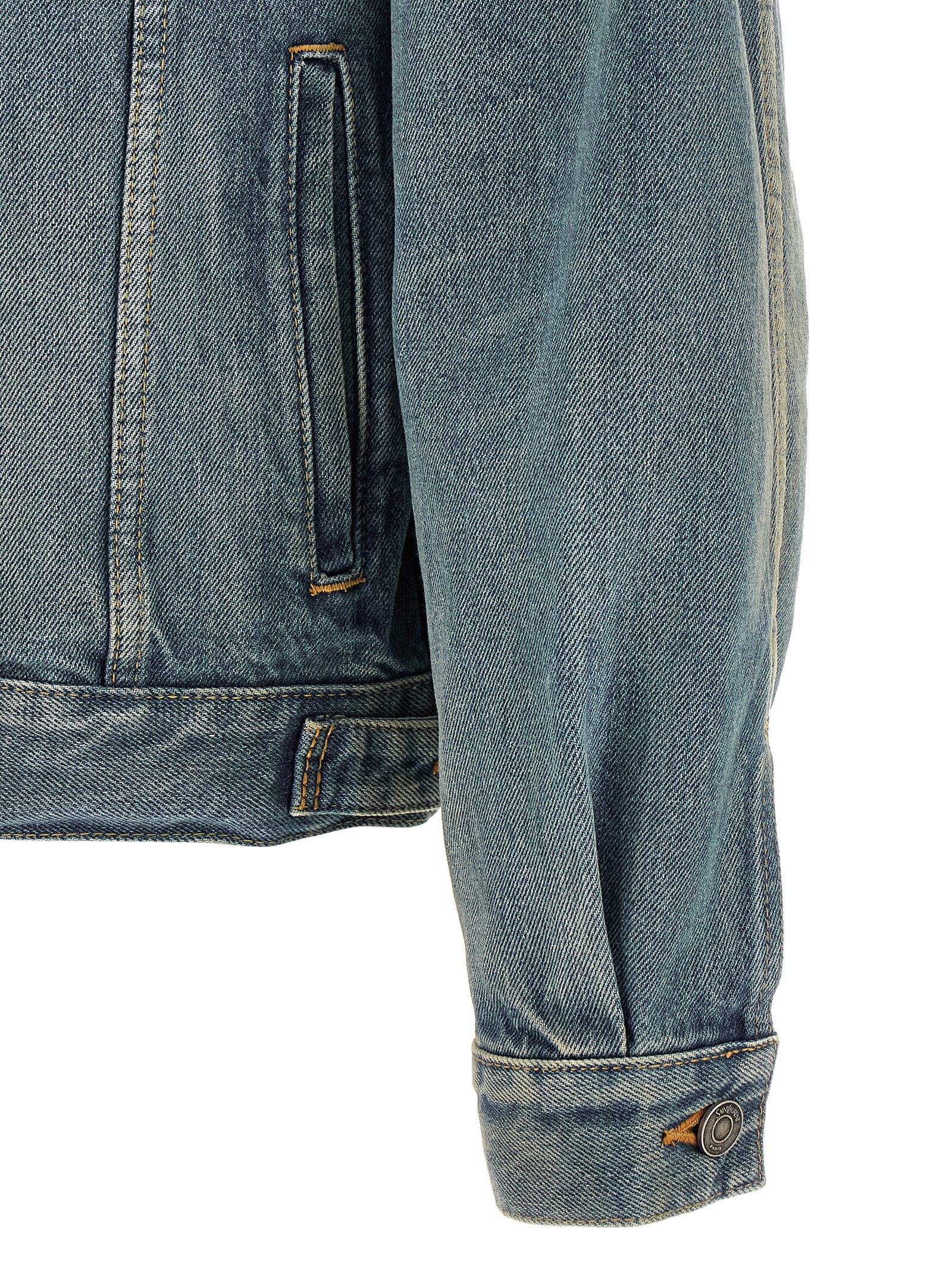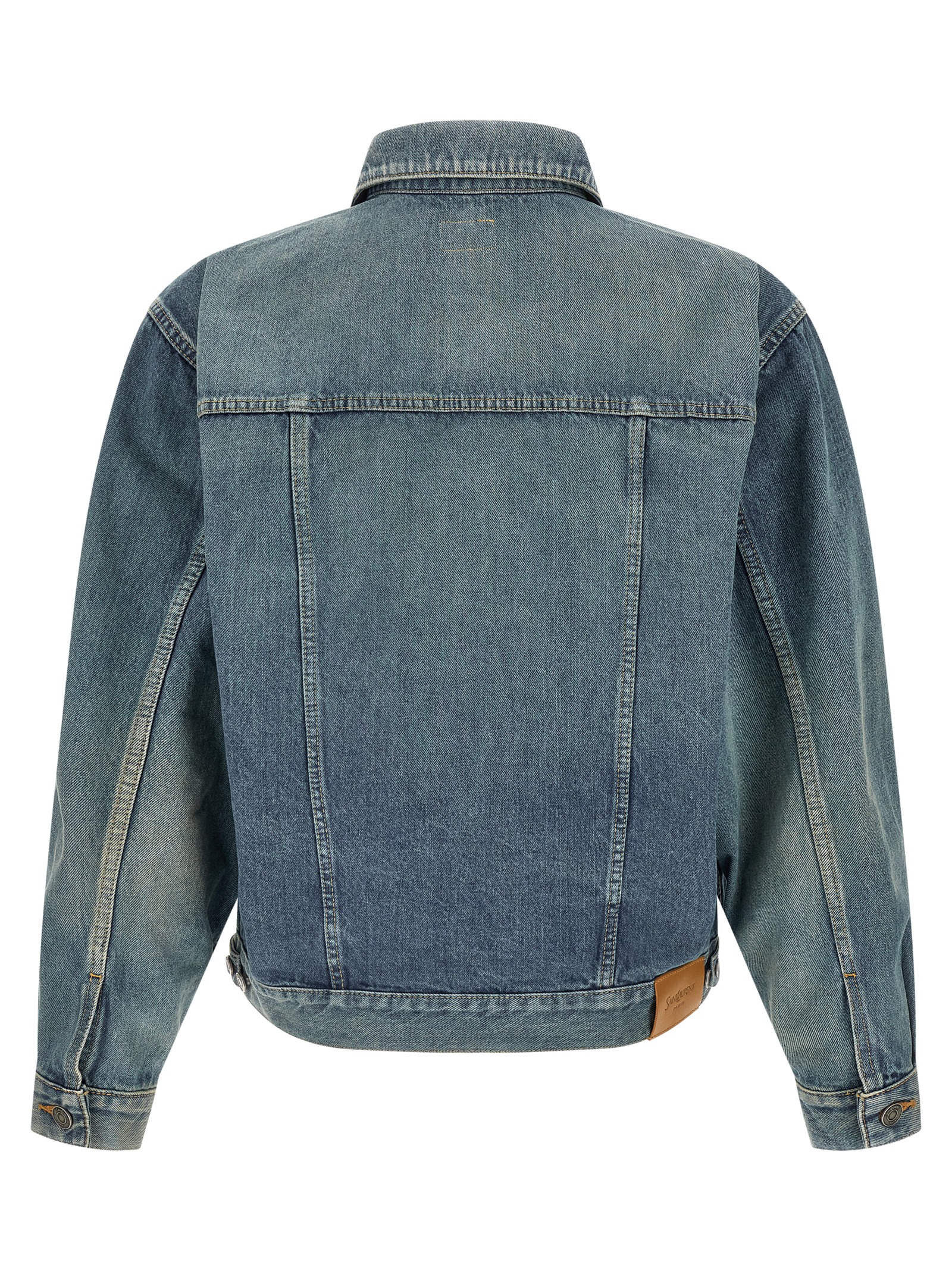 ‘Trucker’ stone-washed cotton denim jacket with contrast stitching, shirt collar, front metal button closure, pockets, long wide sleeves with cuffs and dropped shoulder, leather logo label on the back.