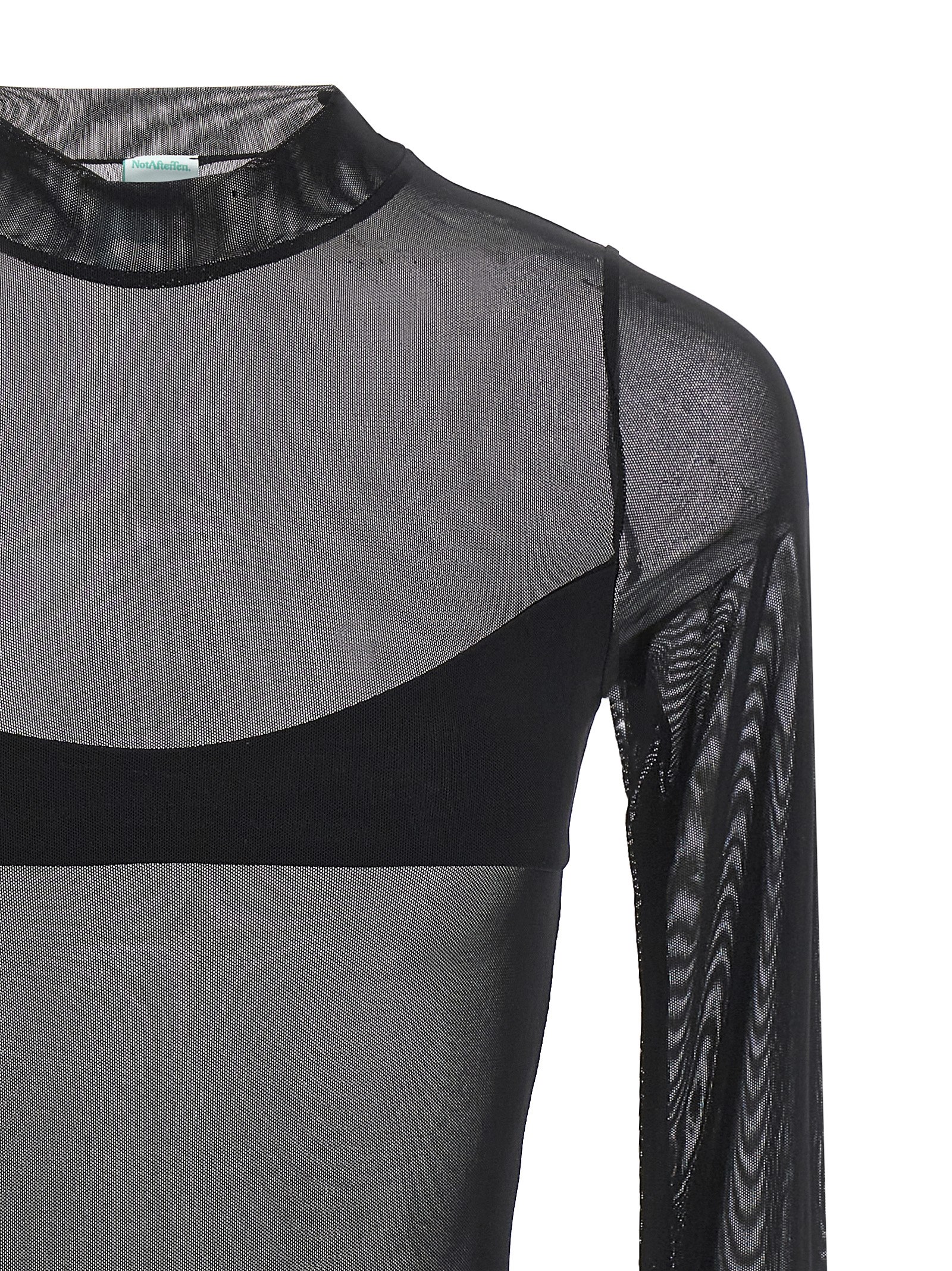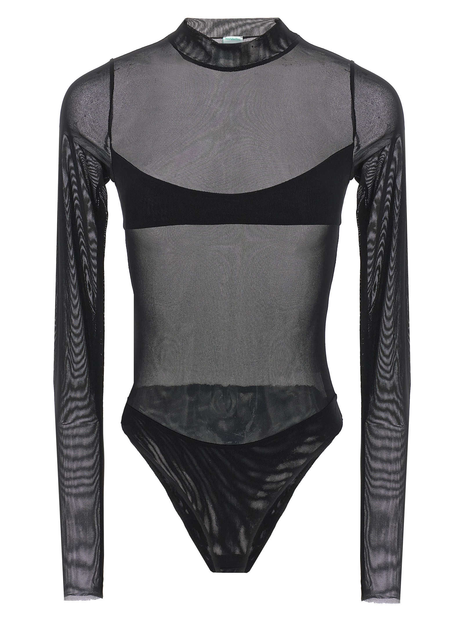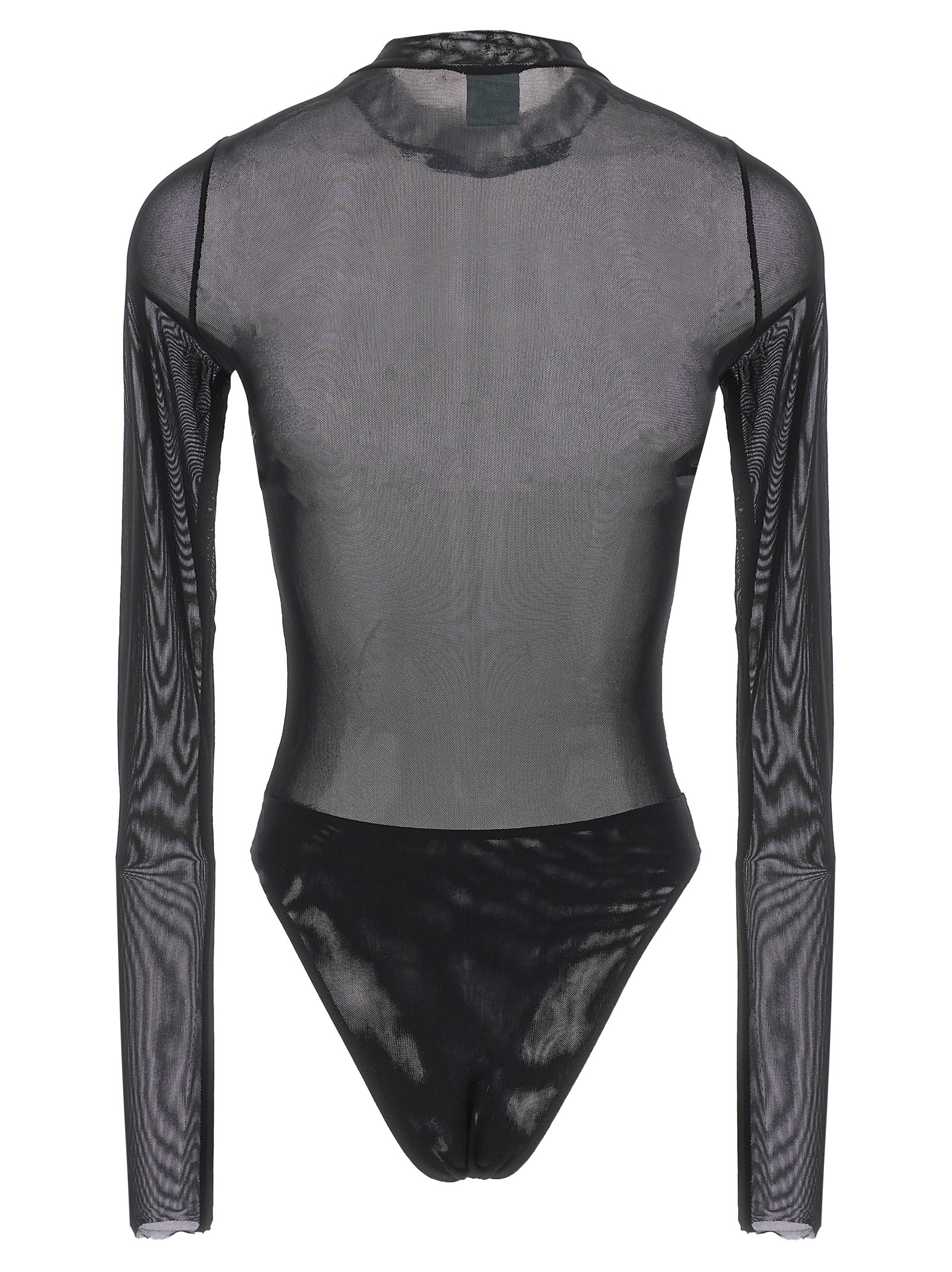 Transparent tulle bodysuit, high neck, long sleeves, and button closure.
