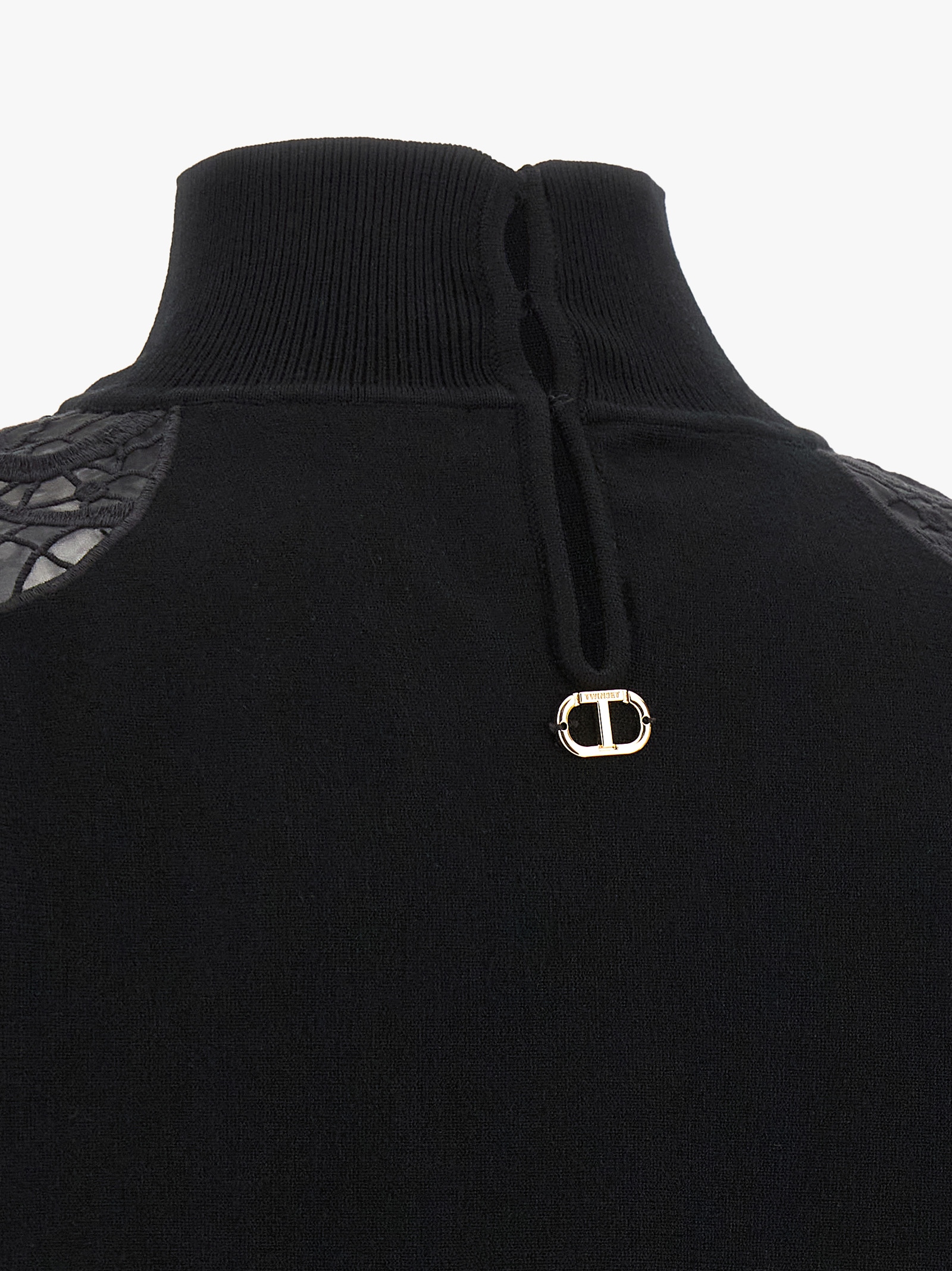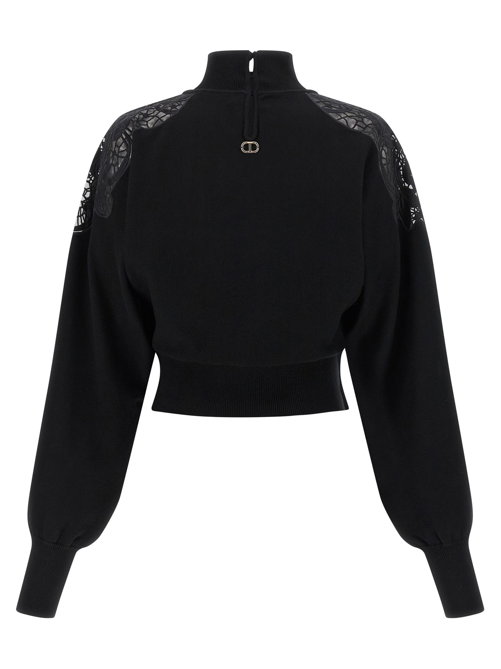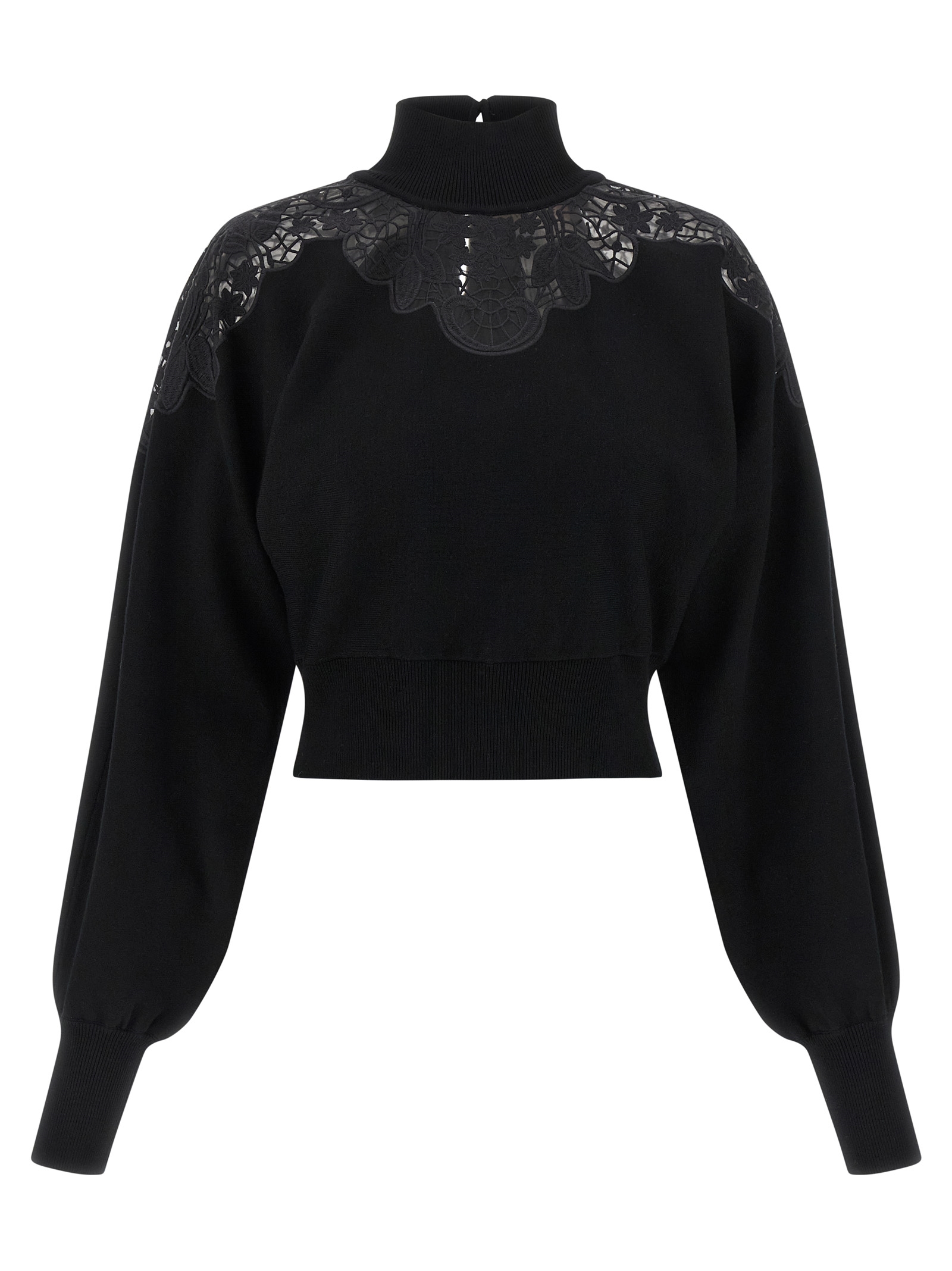 Viscose-blend sweater with semi-transparent tulle and lace details, crop model, high neck, long sleeves with cuffs and dropped shoulders.
