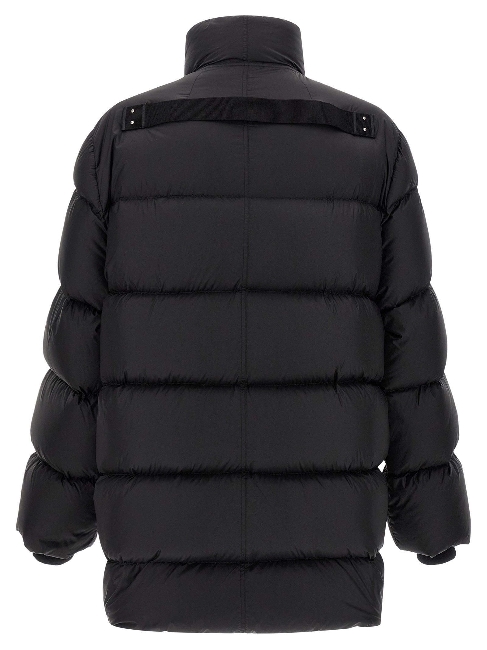 Long ‘Turtle’ quilted nylon down jacket with goose down padding, standing collar, asymmetrical front zip closure, pockets, long sleeves with stretch knit cuffs, cotton strap with rivets on the back rack.