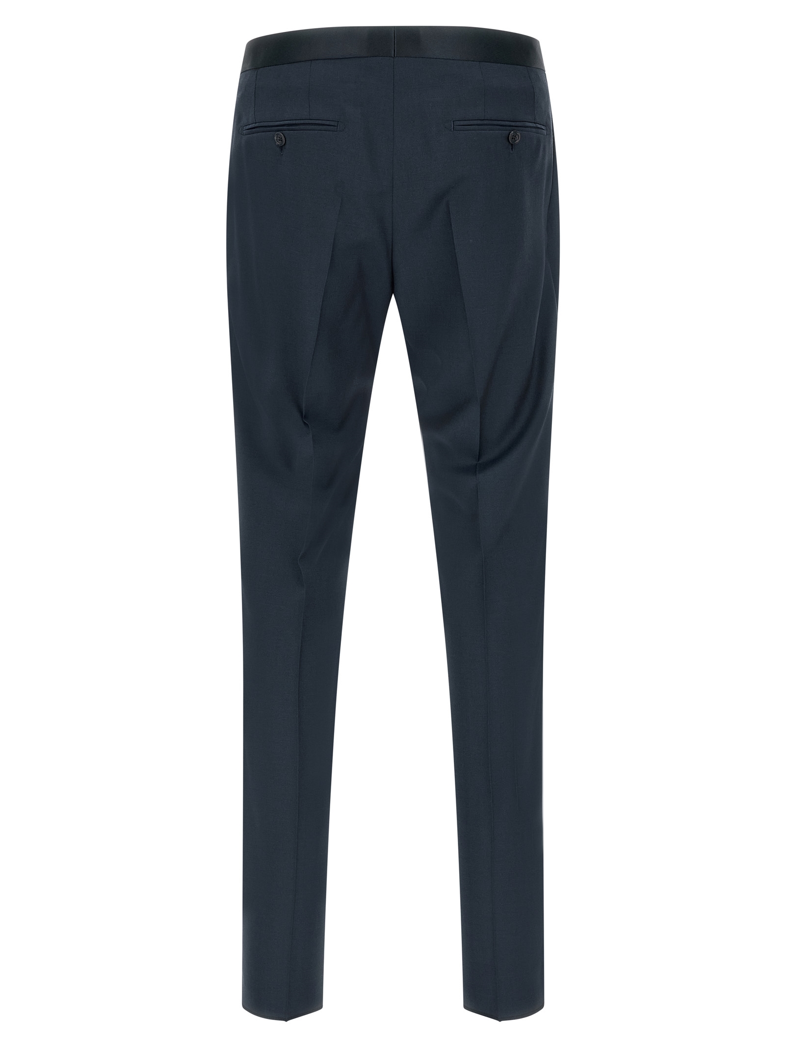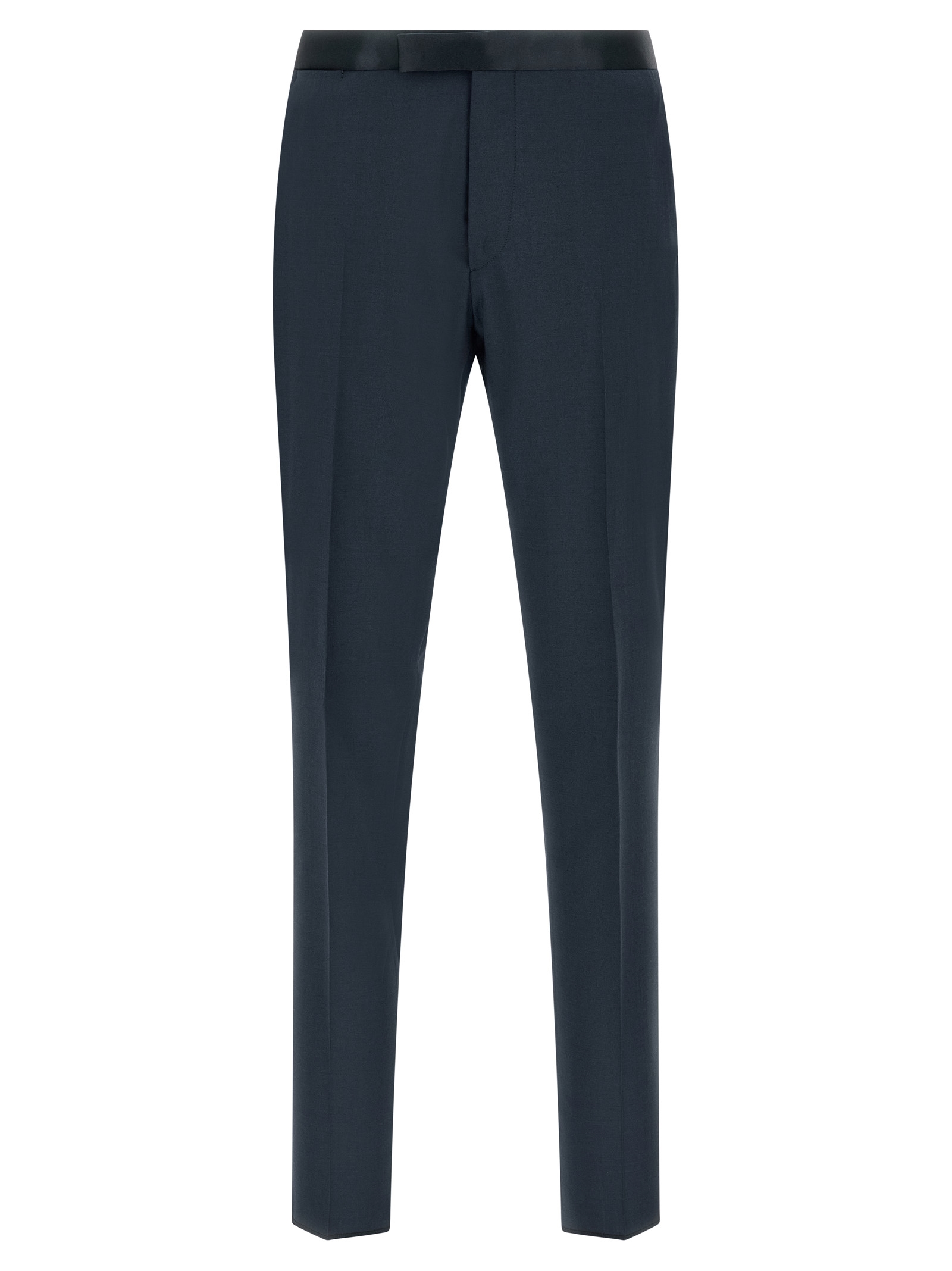 Super 110’s virgin wool dress with tone-on-tone satin details, tuxedo style consisting of single-breasted blazer with front covered button closure, peak lapels with removable metal brooch, breast pocket, patch pockets, cupro lining, four inner pockets, structured shoulder strap, cuffs with opening buttonholes, back vent and trousers with stretched pleat, straight leg. Front pockets, back welt pockets, zip hook and front button closure, leg bottoms with hem to be finished, cotton lining.