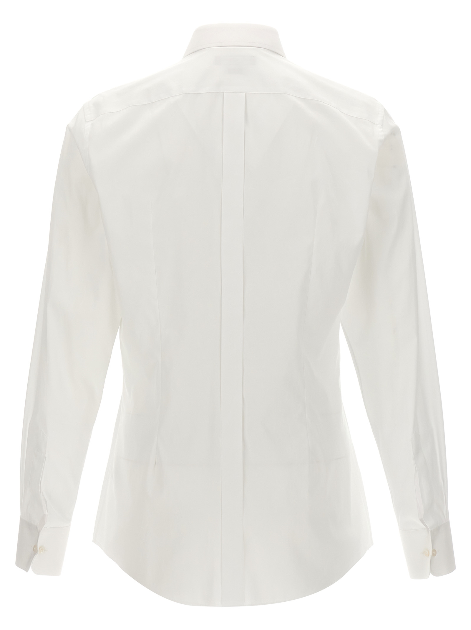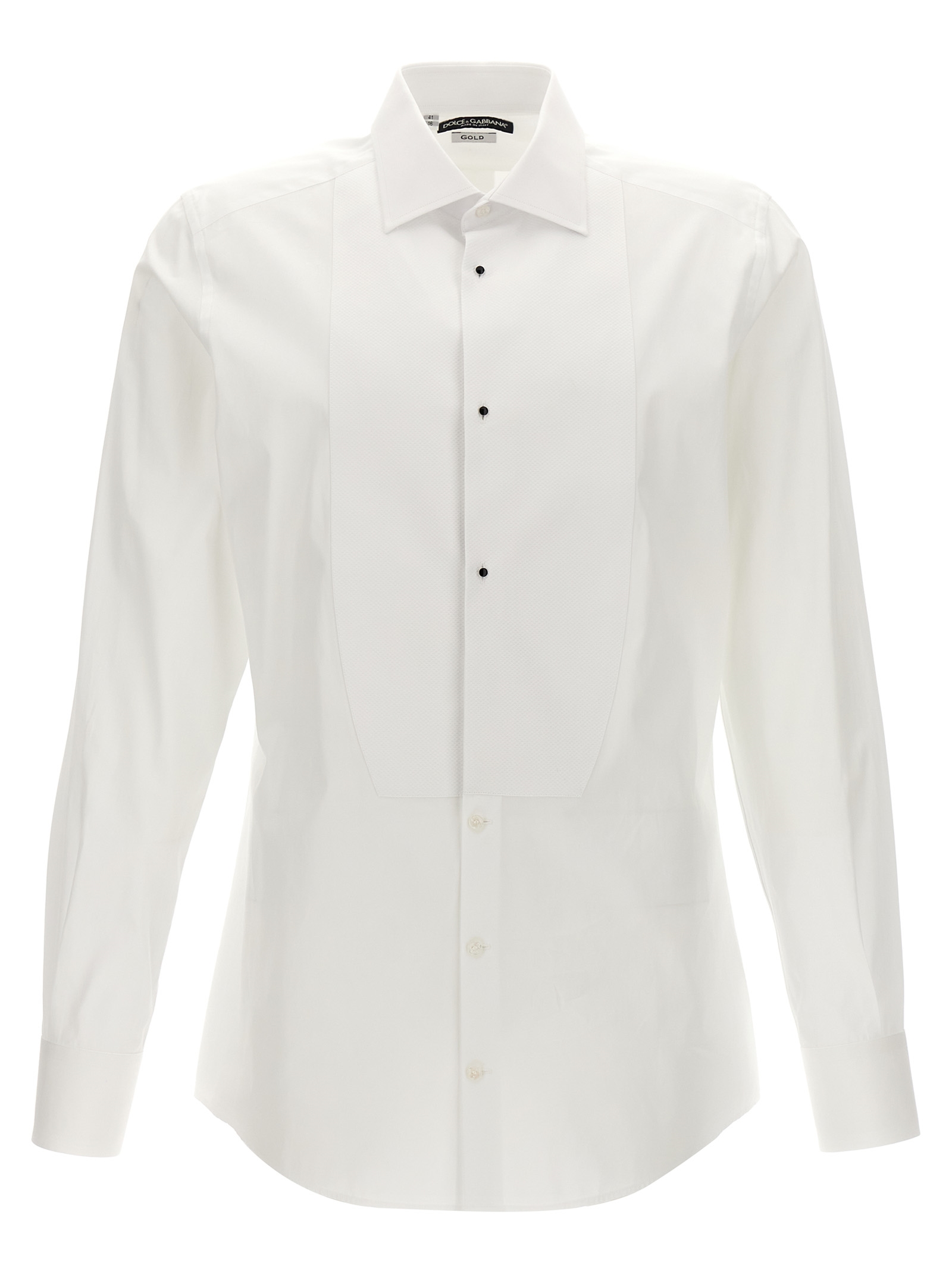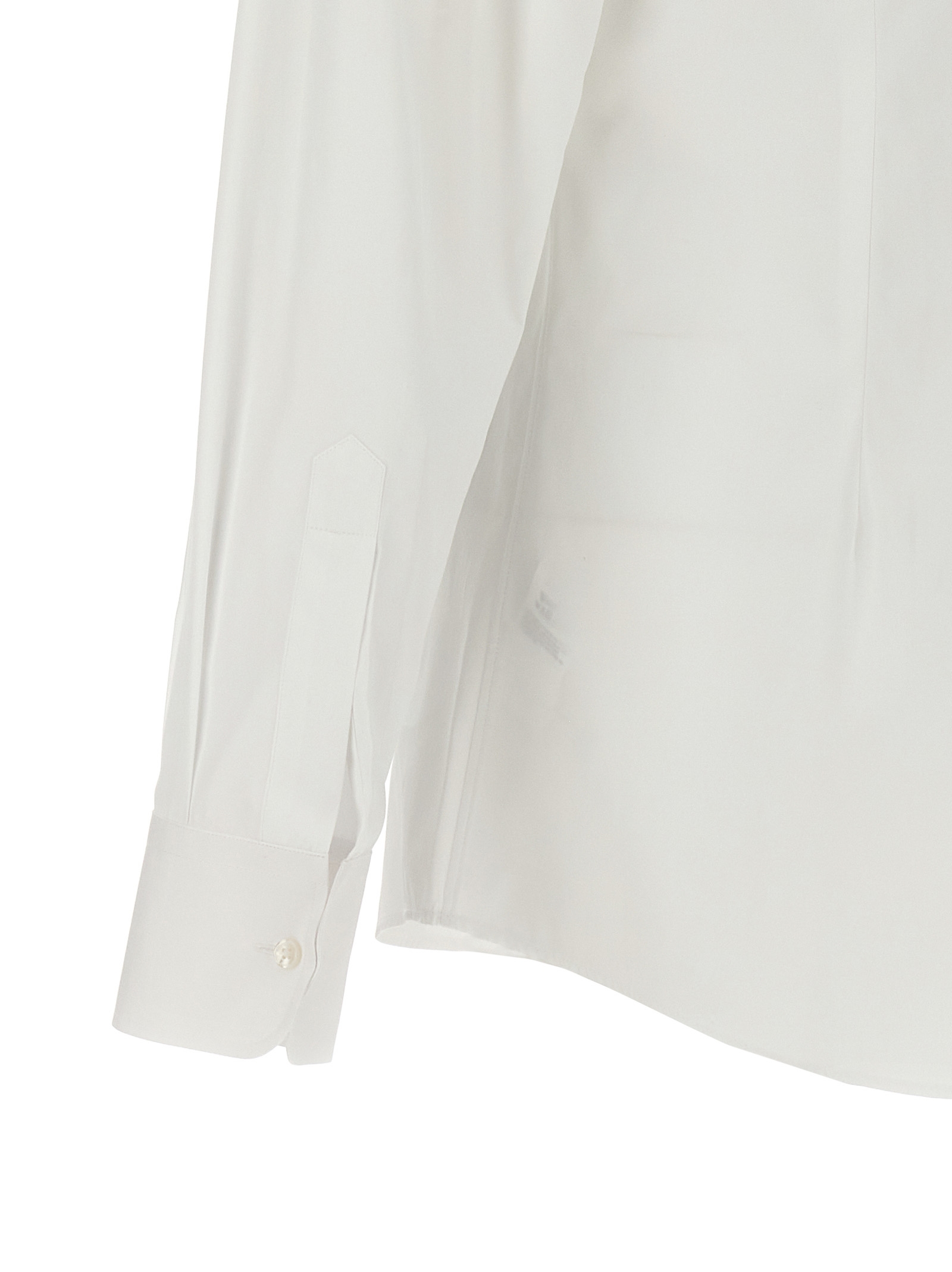 ‘Tuxedo’ cotton poplin shirt with French collar, rigid front plastron in cotton piquet, front closure with contrasting buttons, long sleeves with cufflinks.