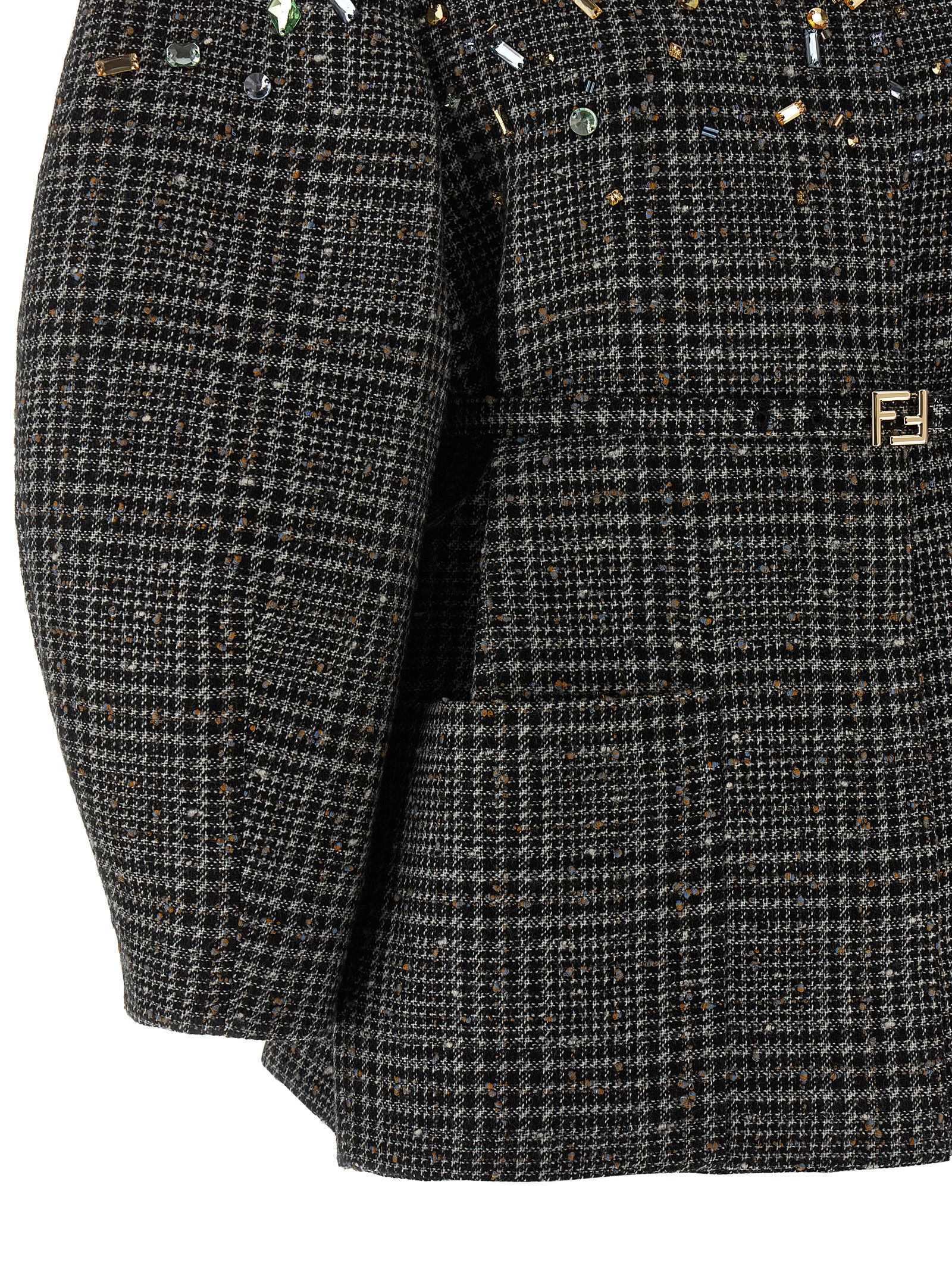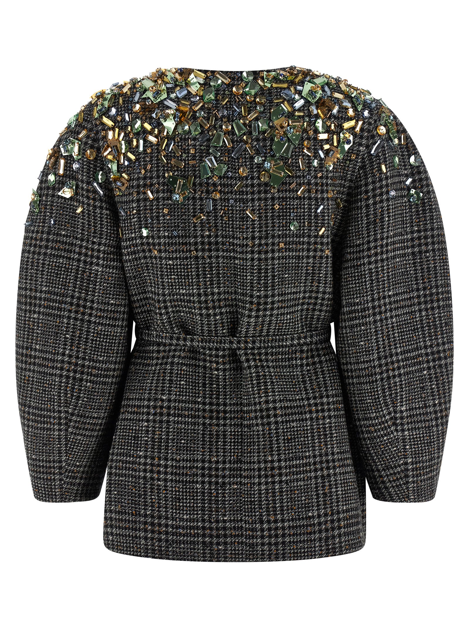Check wool tweed jacket, crystal embroidery at the top, front button closure, removable and adjustable waist belt with logo buckle.