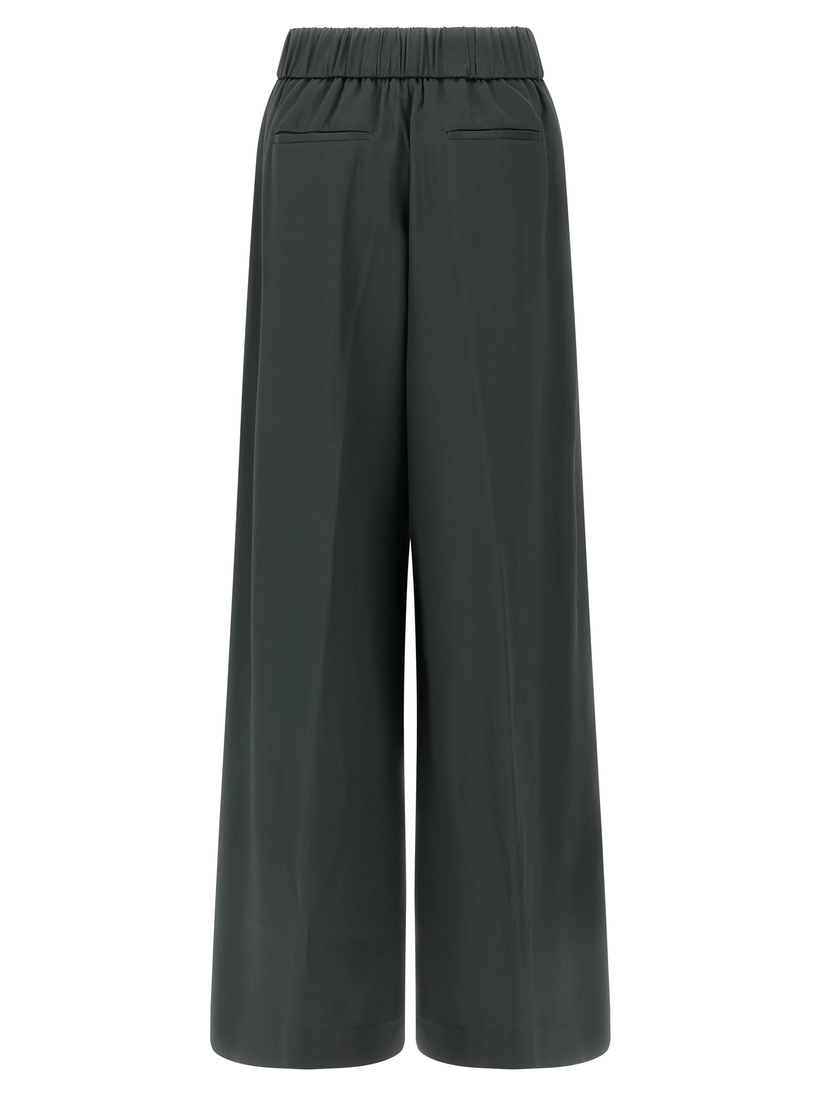 Fluid viscose twill pants, wide and straight leg, trompe l’oeil flap, elastic waistband, pockets.