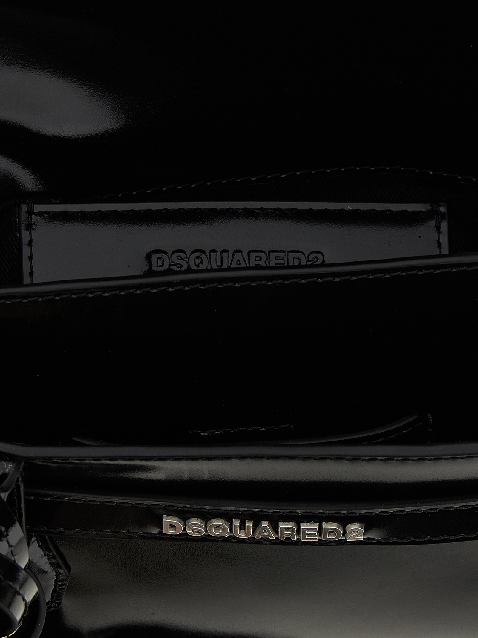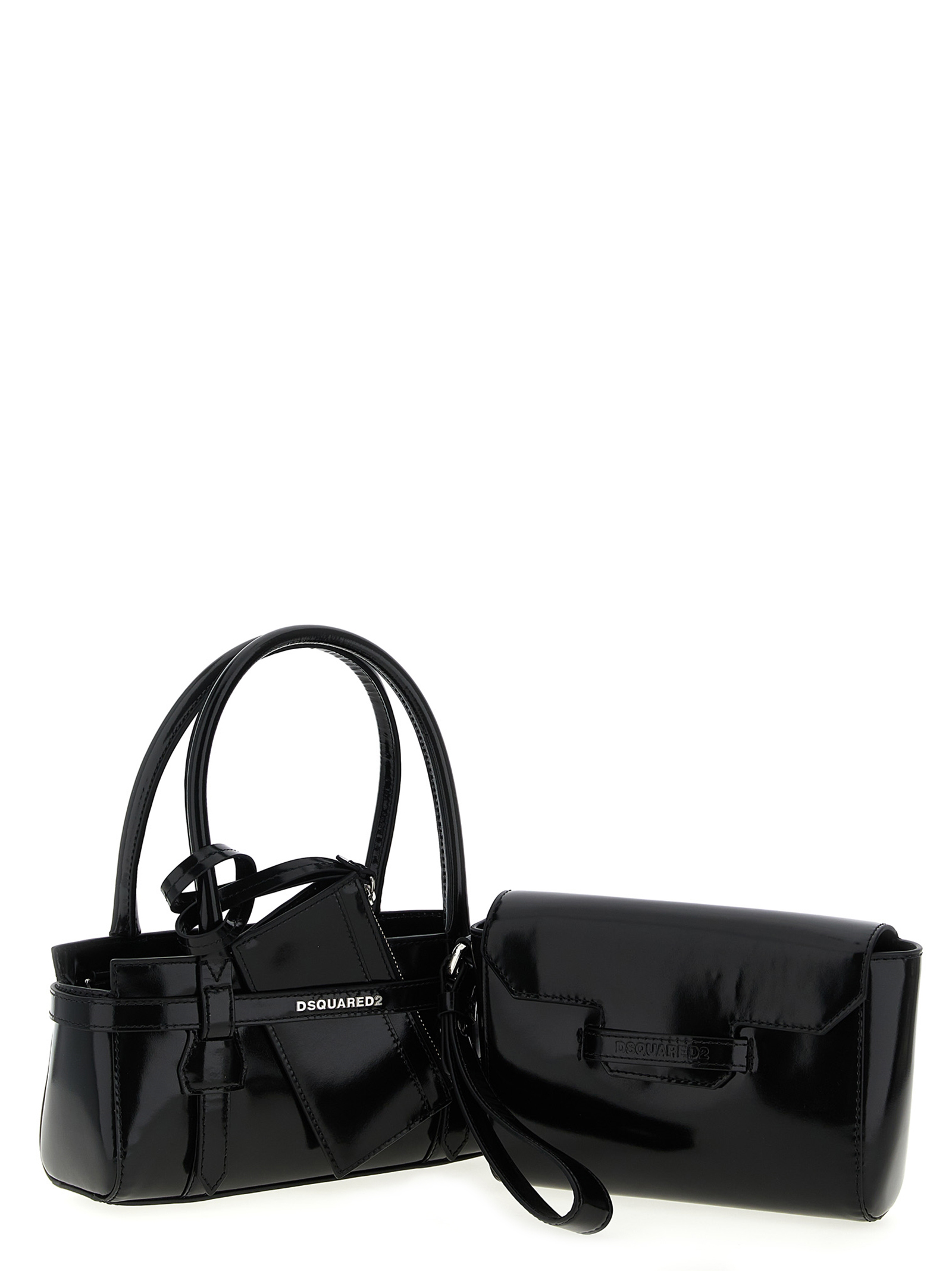 ‘Twin Mini’ patent leather handbag, front metal lettering logo, inner snap button closure, double fixed handle, adjustable and removable shoulder strap, removable inner clutch bag with magnetic flap closure and wrist handle, removable coin purse.