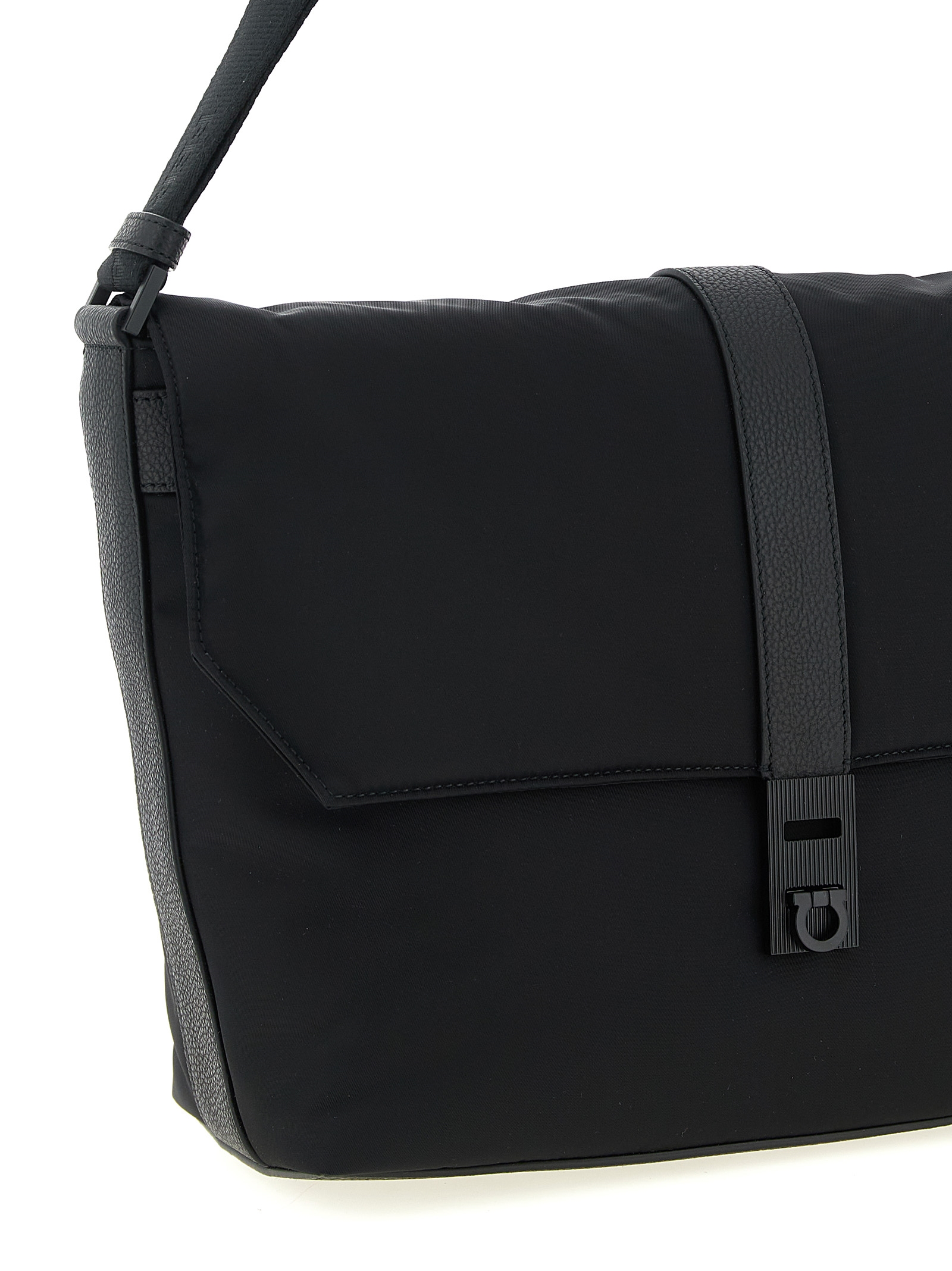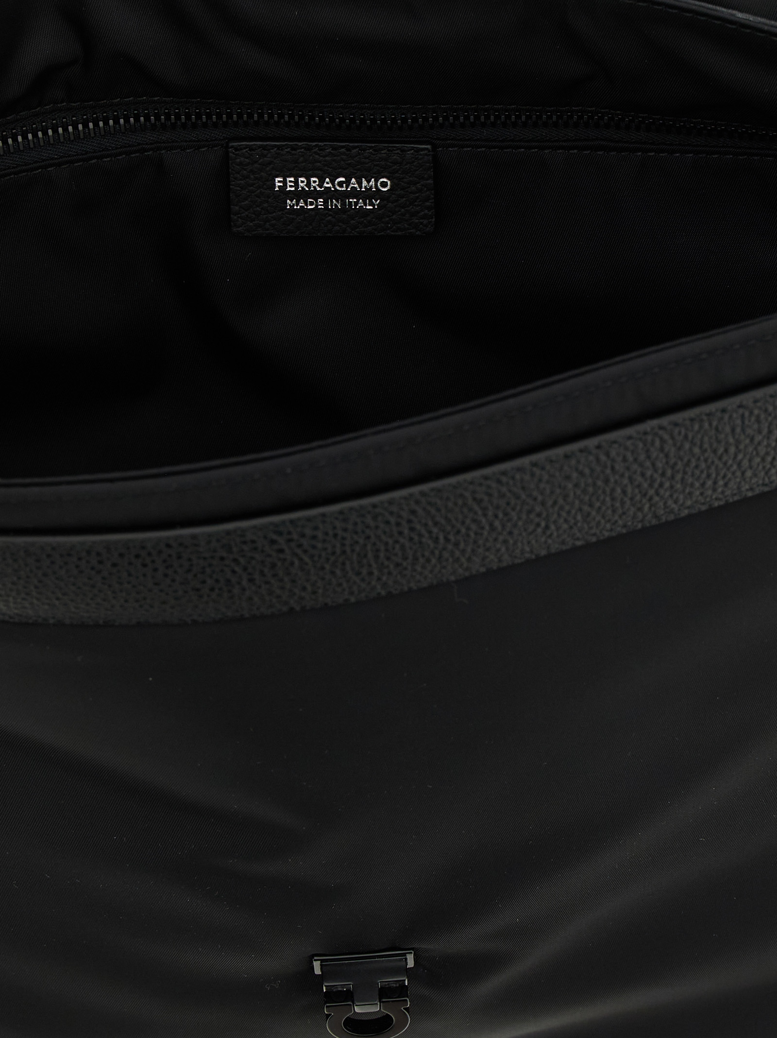 ‘Twins’ crossbody bag in technical fabric and hammered leather, flap closure with tone-on-tone ‘Gancini’ knurled buckle, zip pocket and band to attach the bag to the back trolley, adjustable shoulder strap in jacquard logo ribbon.