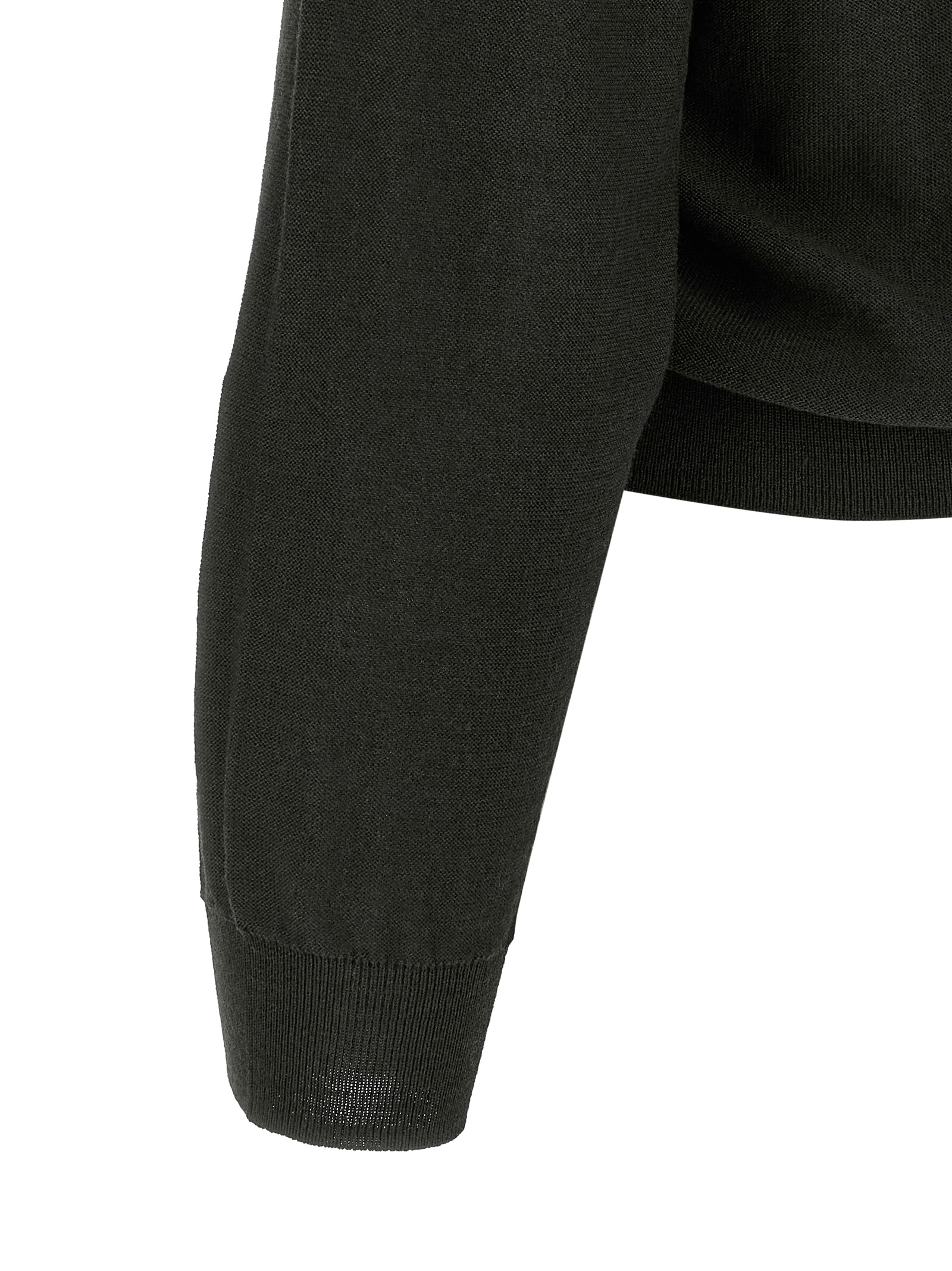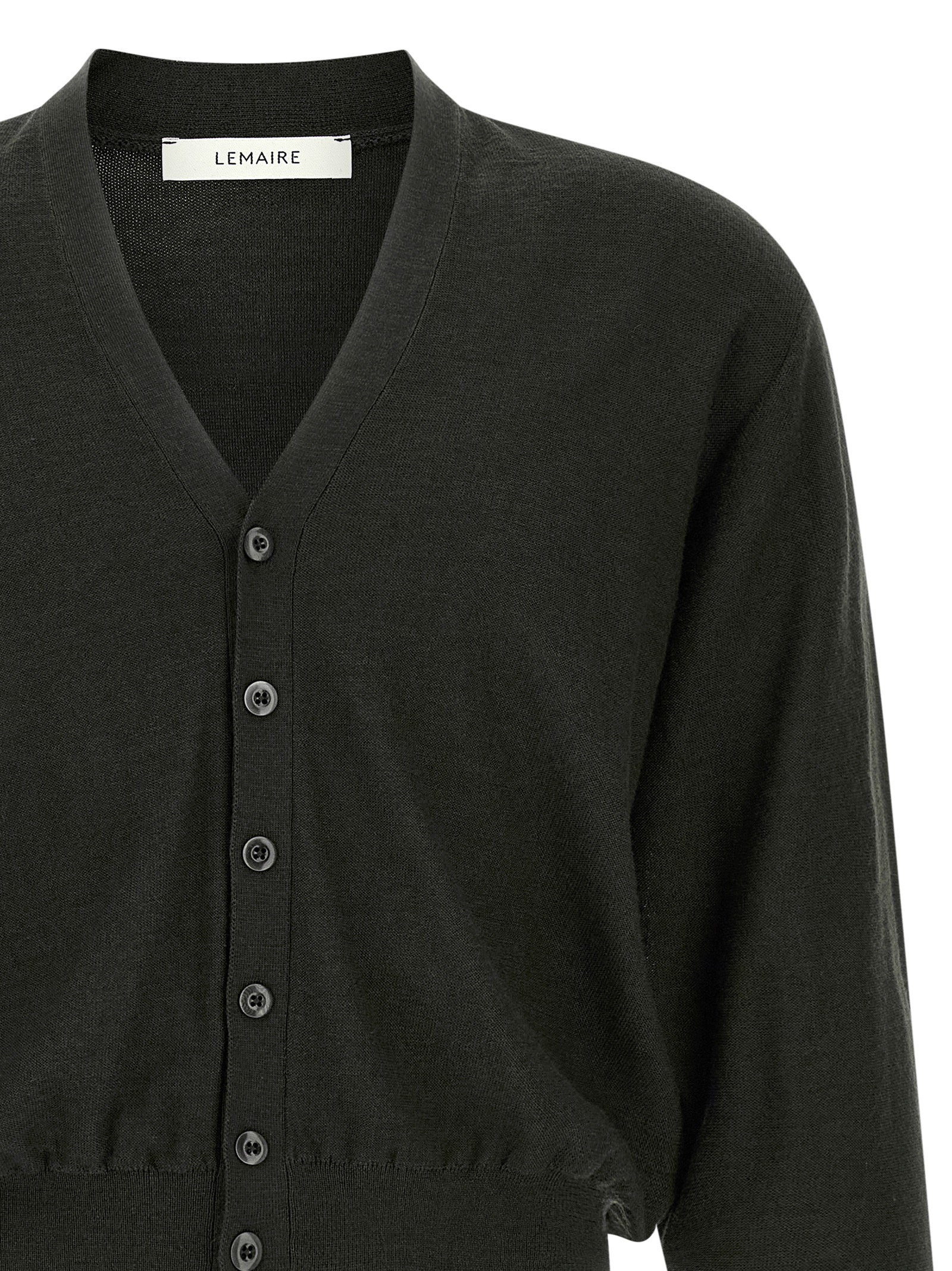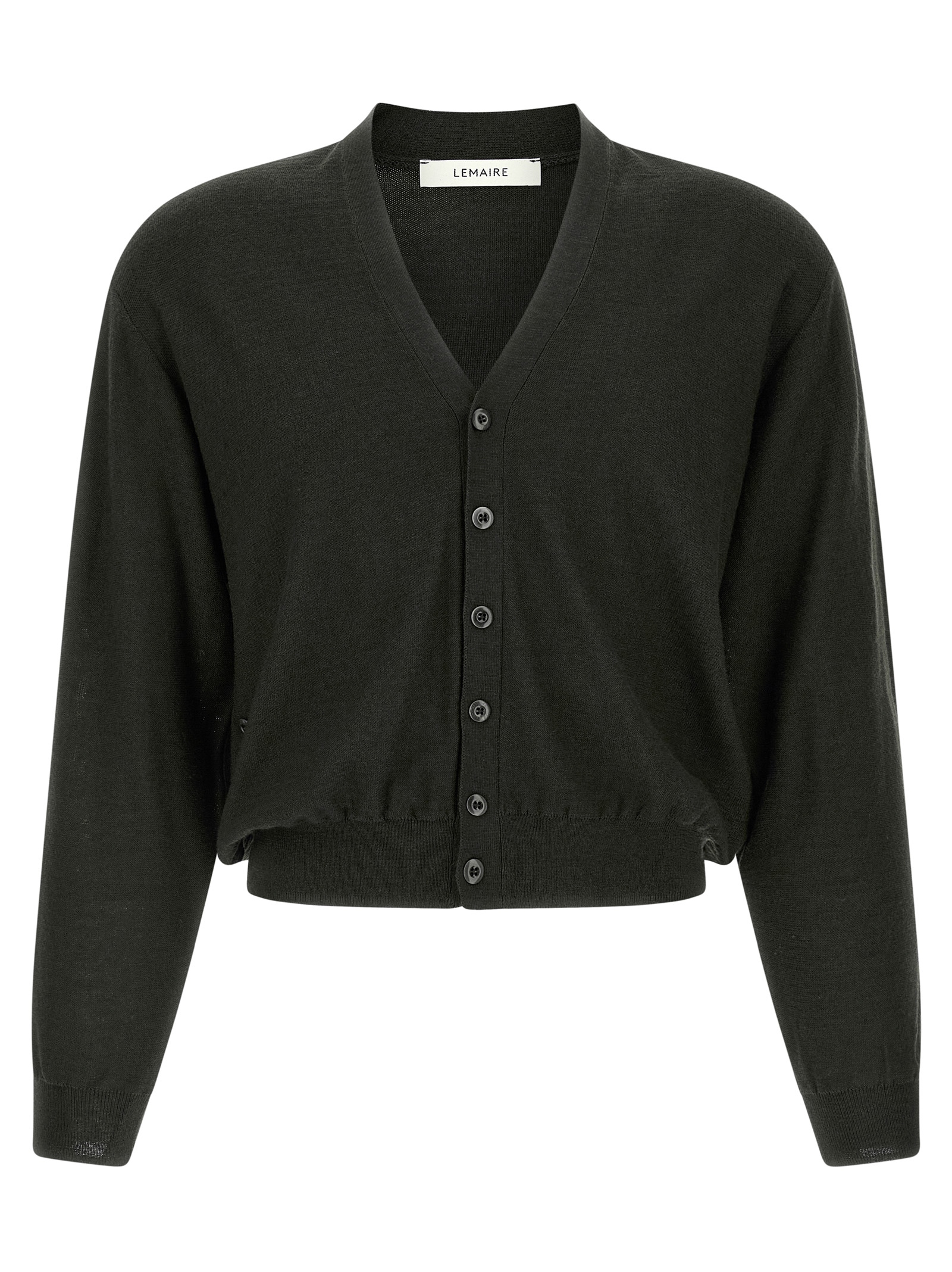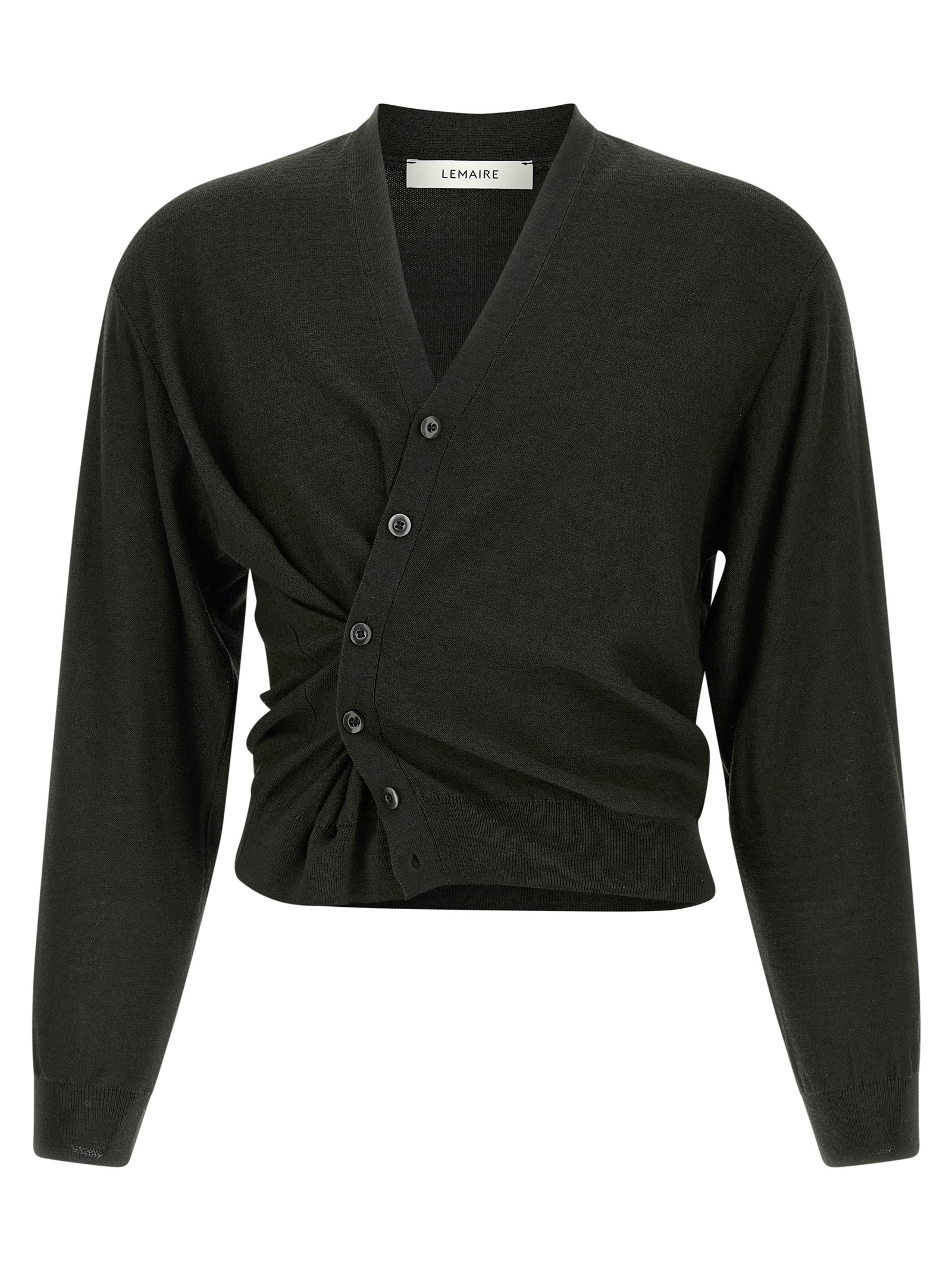 ‘Twisted’ wool blend knit cardigan with V-neck, front asymmetric button closure, long cuffed sleeves, and headband.