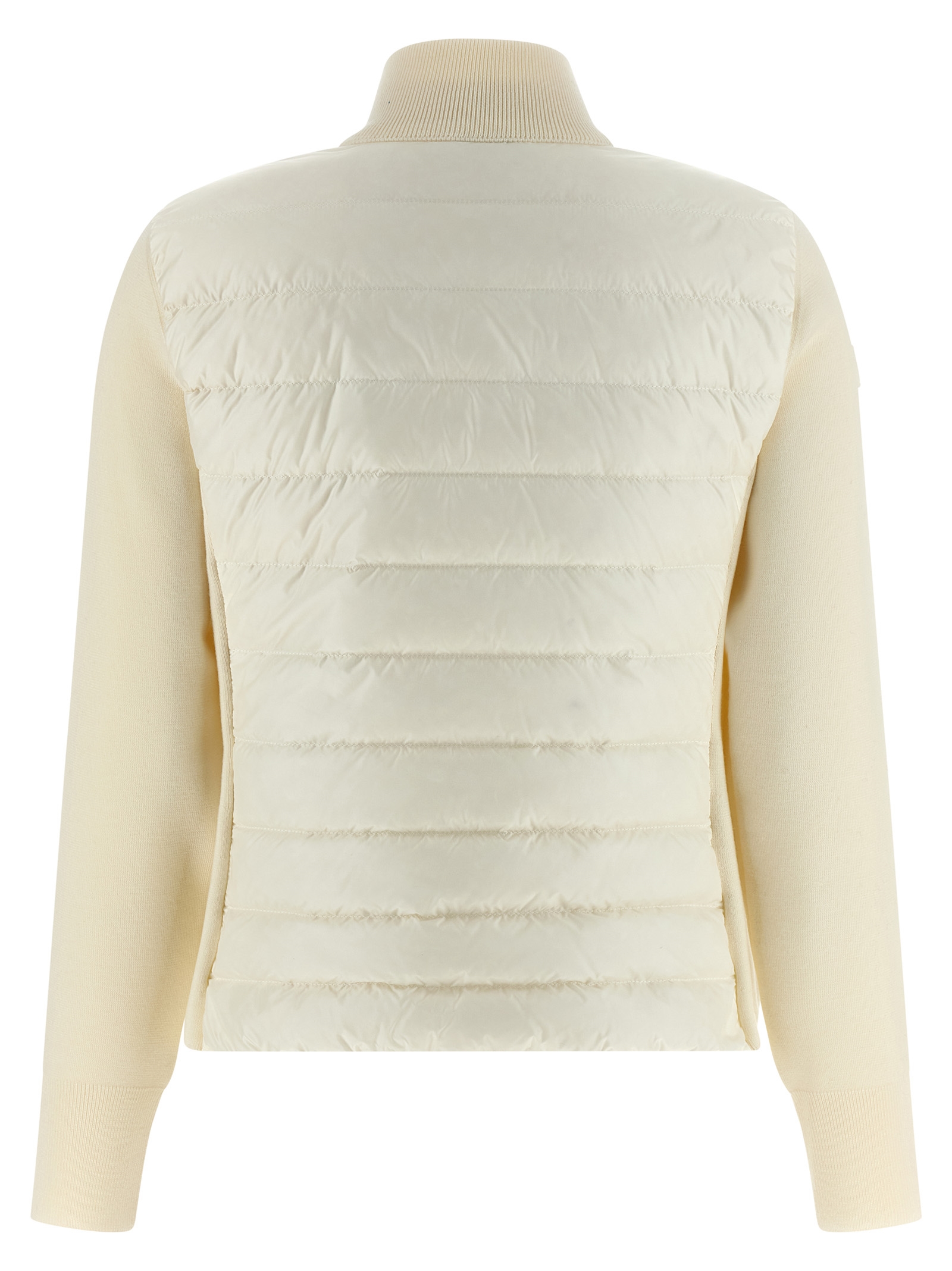 Two-material virgin wool cardigan, quilted saison quilted longue vest, high neck, front zip closure, pockets, long cuffed sleeves and felt logo patch appliqué.