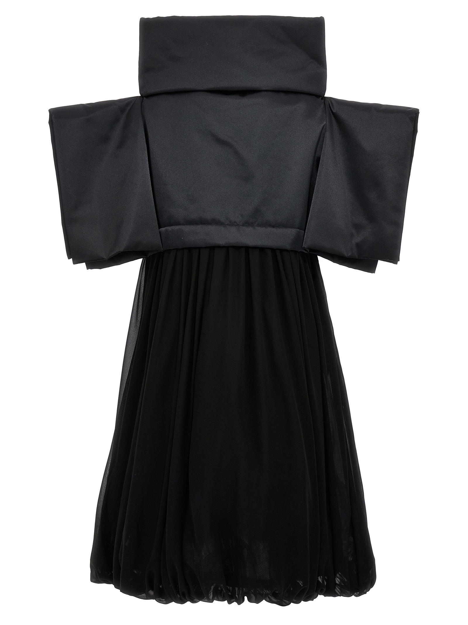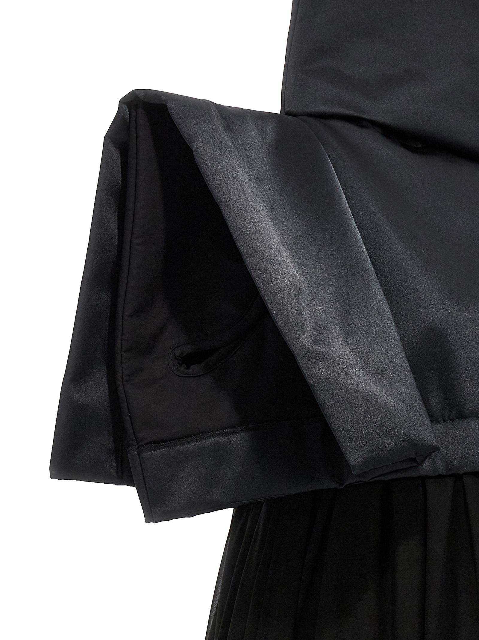Two-material dress with padded and satin fabric top, square sleeves and high boat neck. The part of the skirt is made of flounced tulle.