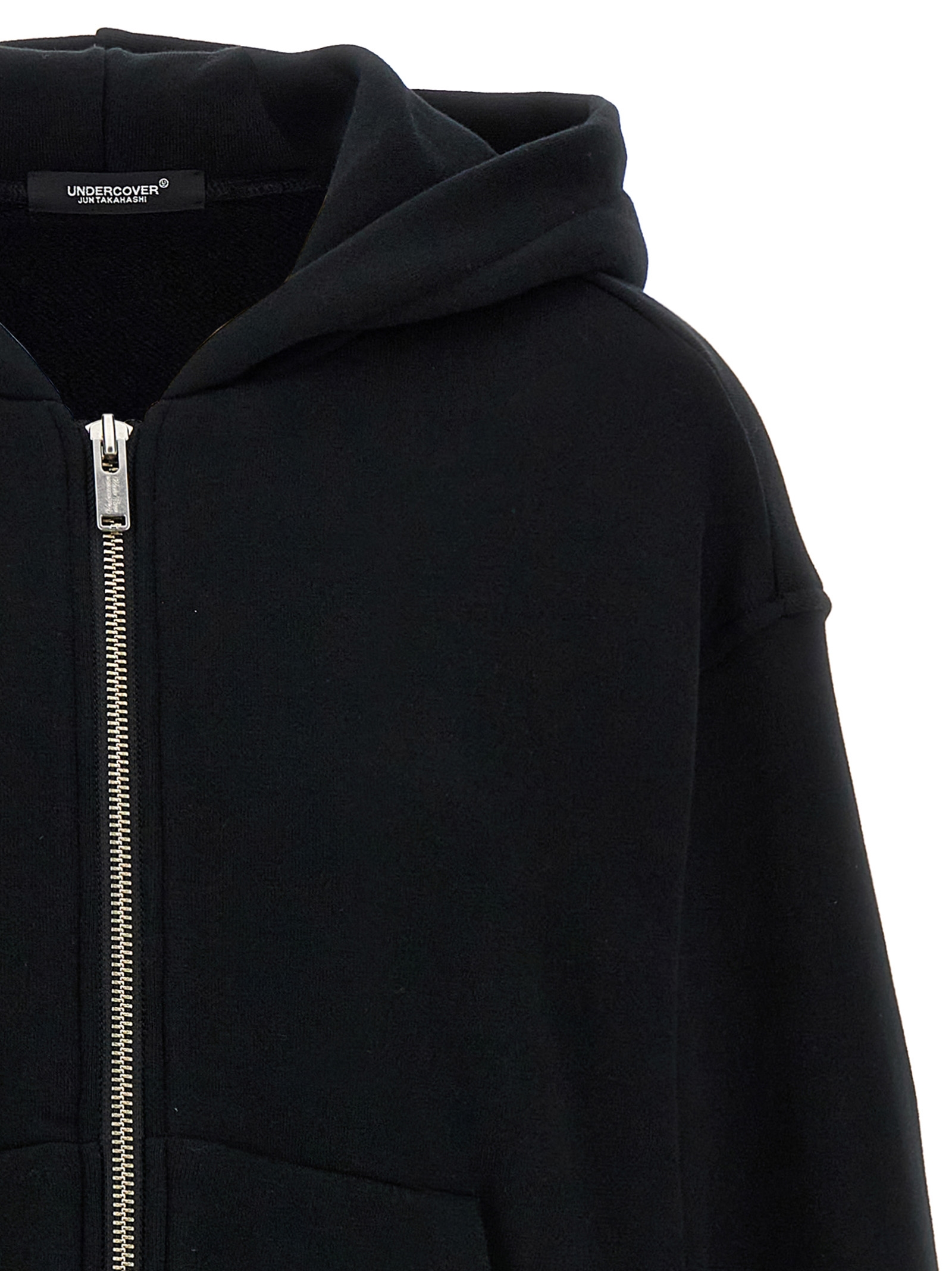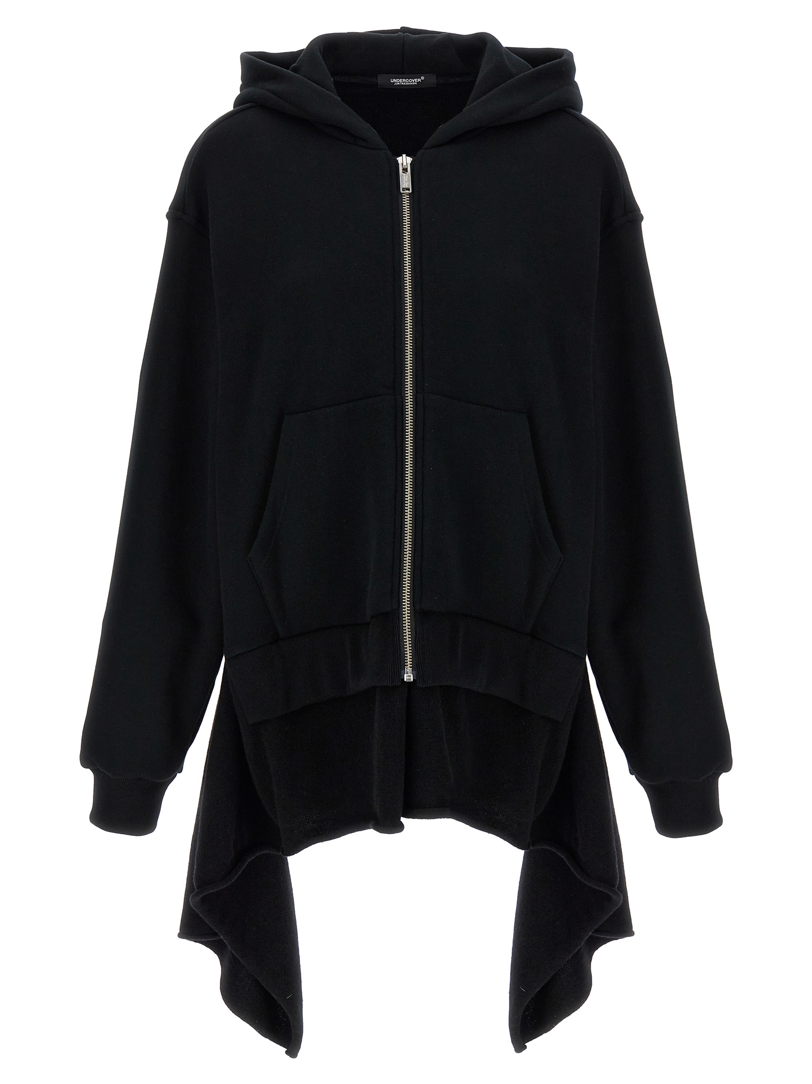Hoodie in brushed cotton with asymmetrical wool inserts, zip closure, pockets, long sleeves with cuffs.