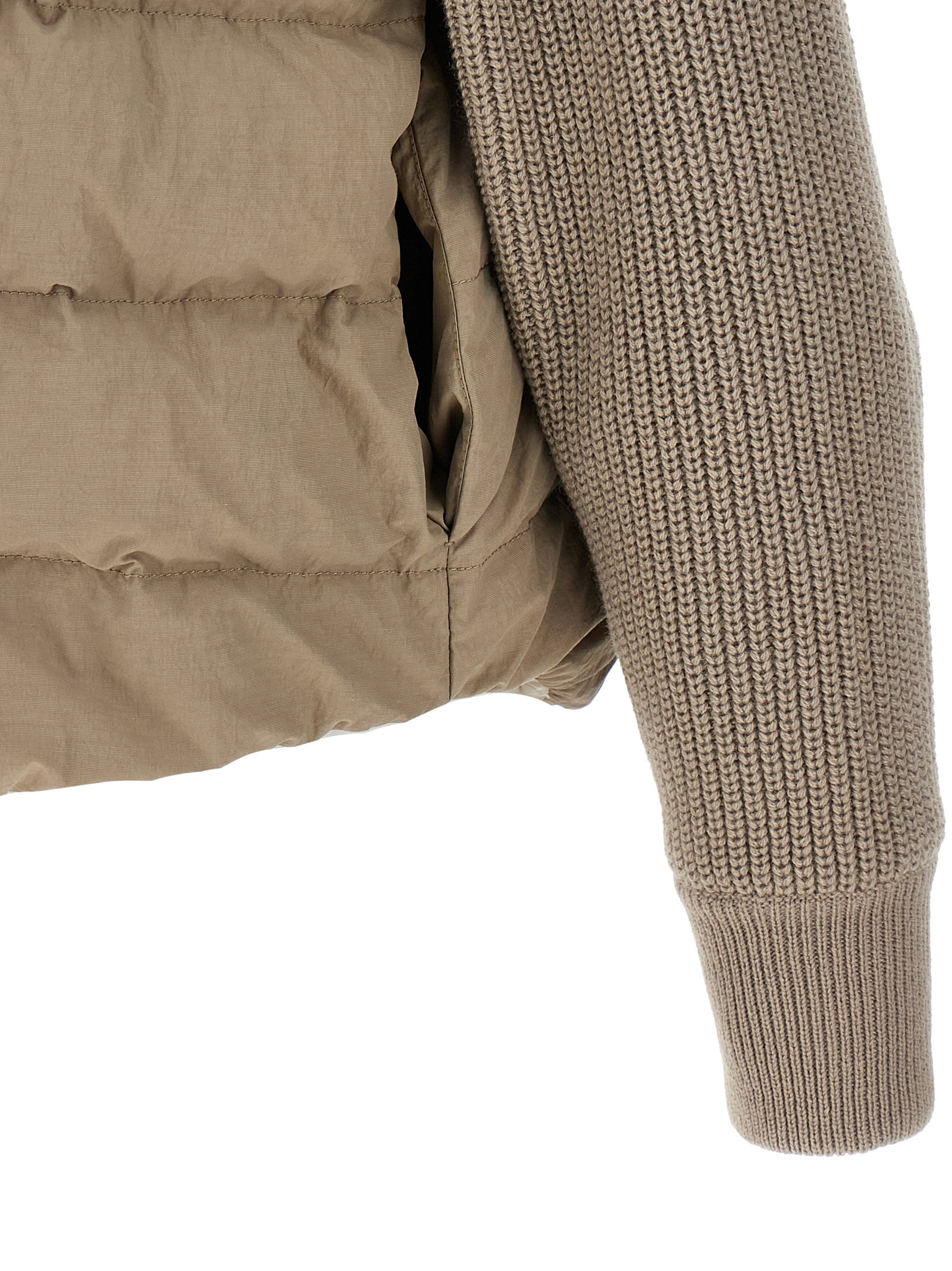 Two-material water-repellent nylon down jacket with goose down padded with virgin wool, cashmere and silk knit sleeves, shirt collar, front snap button closure, pockets with Monile ‘Shiny Flap Detail’, wide long sleeves with cuffs.