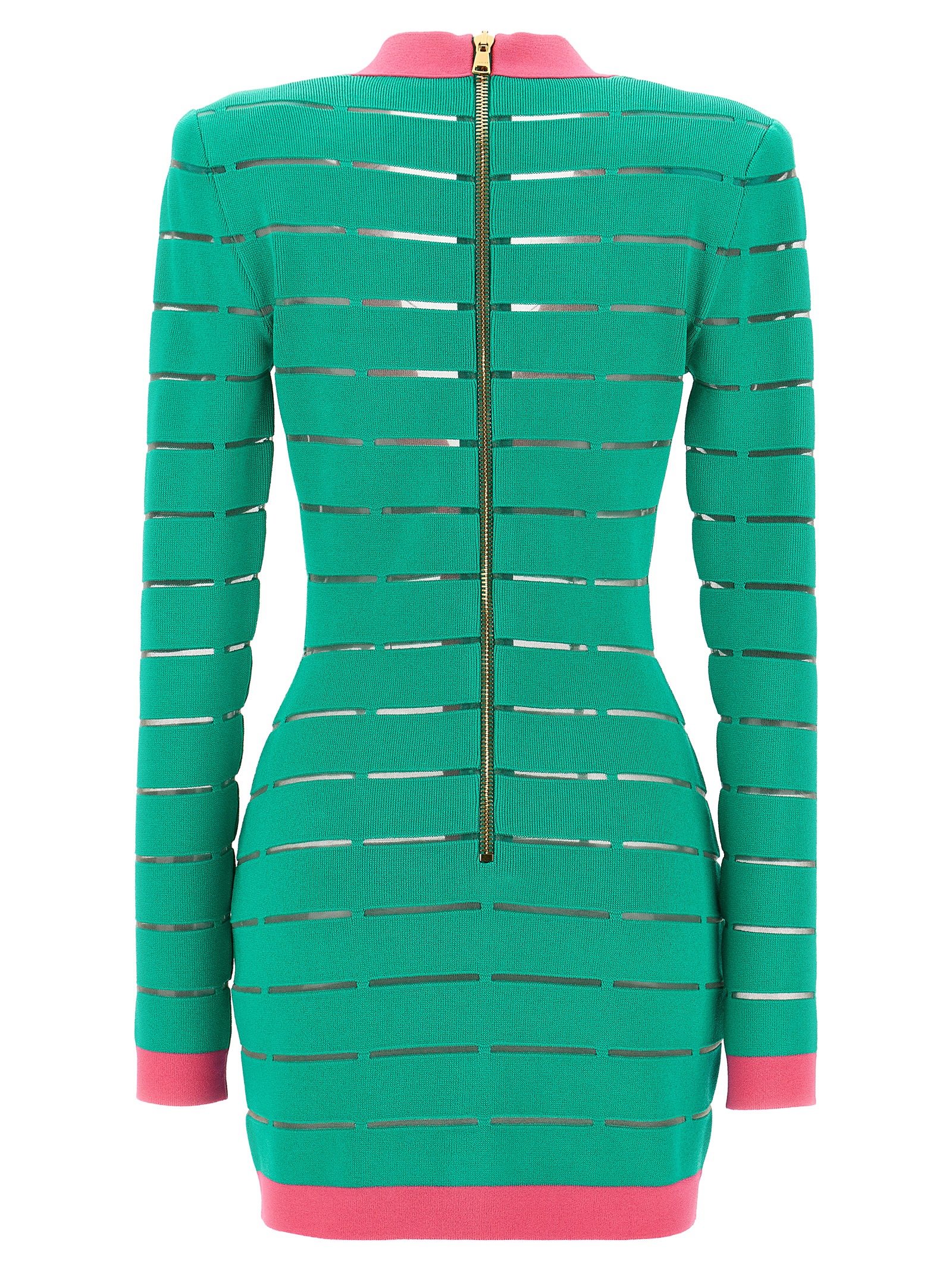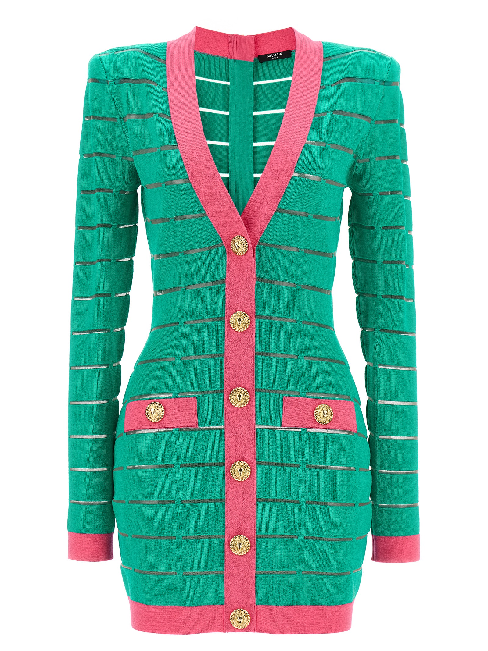 Two-tone viscose blend knit dress, sheer mesh inserts, V-neck with front logo buttons, back zip closure, padded shoulders, long sleeves.