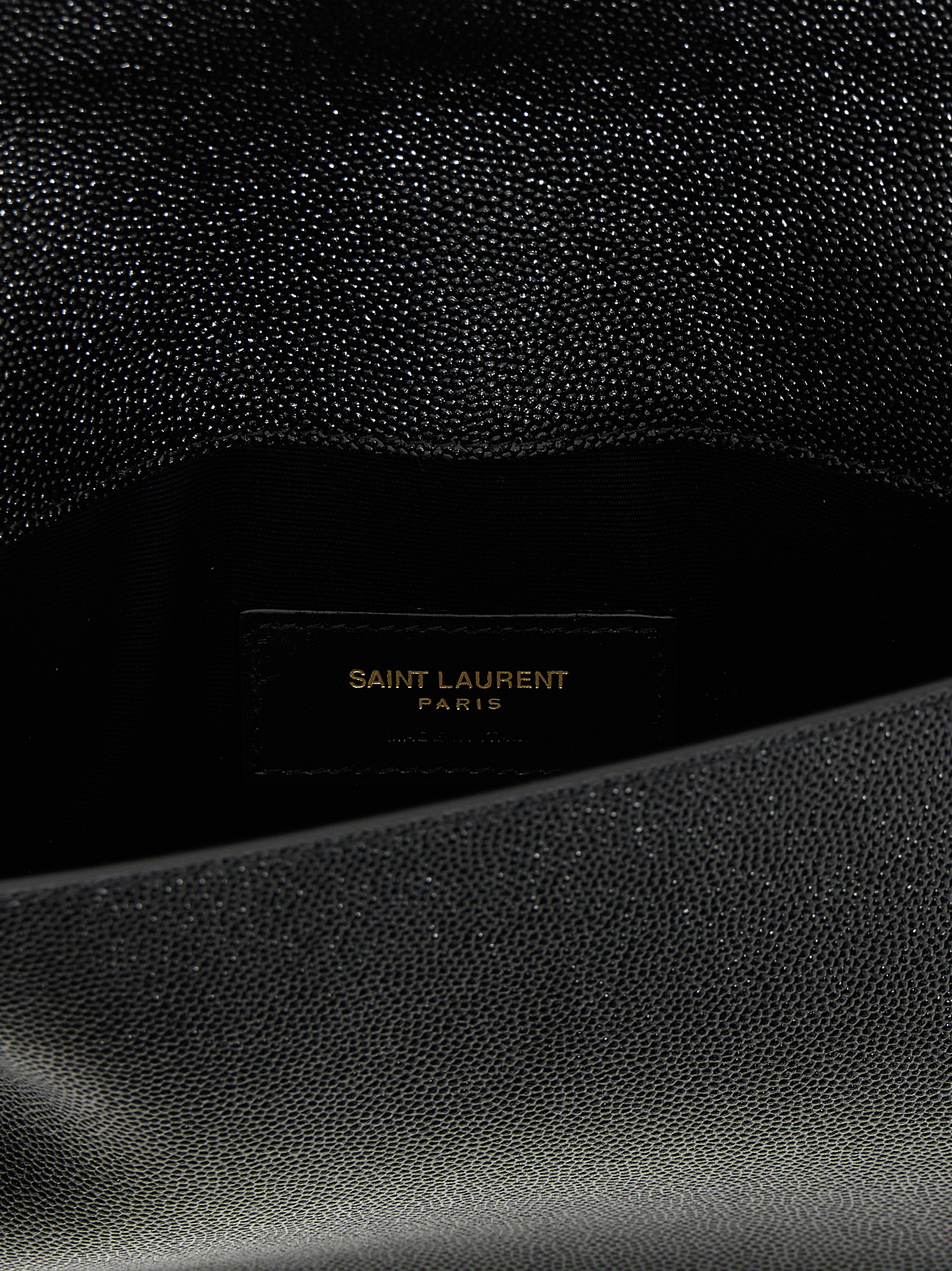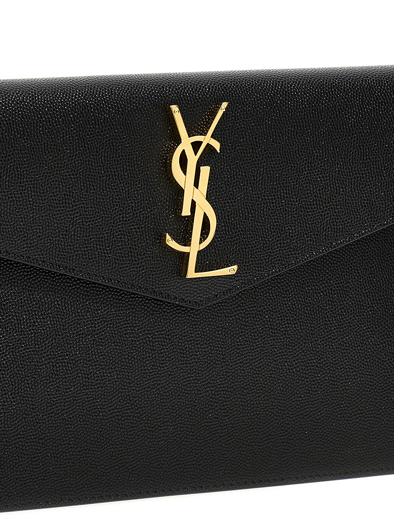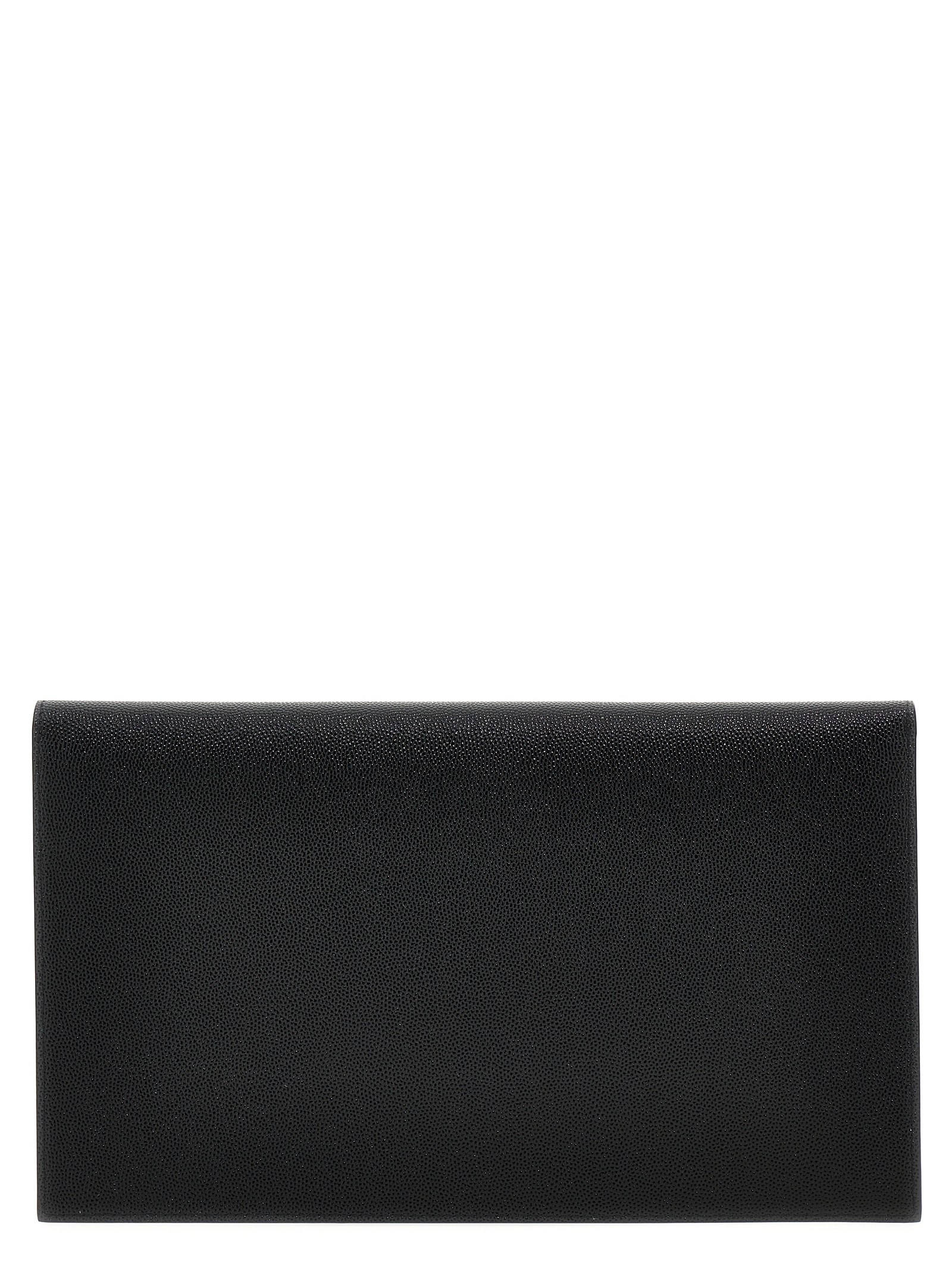 Uptown’ clutch bag in grain de poudre leather with YSL metal logo and a flap closure.
