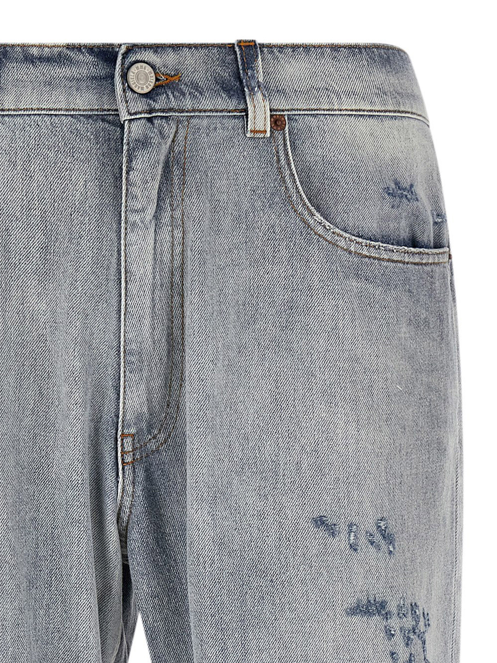 Used-effect stone washed cotton denim jeans with rips and patches, contrast stitching, wide and straight leg, front zip and button closure, five pockets, ‘White Stitch Line’ and back logo tag, split on the leg bottom.