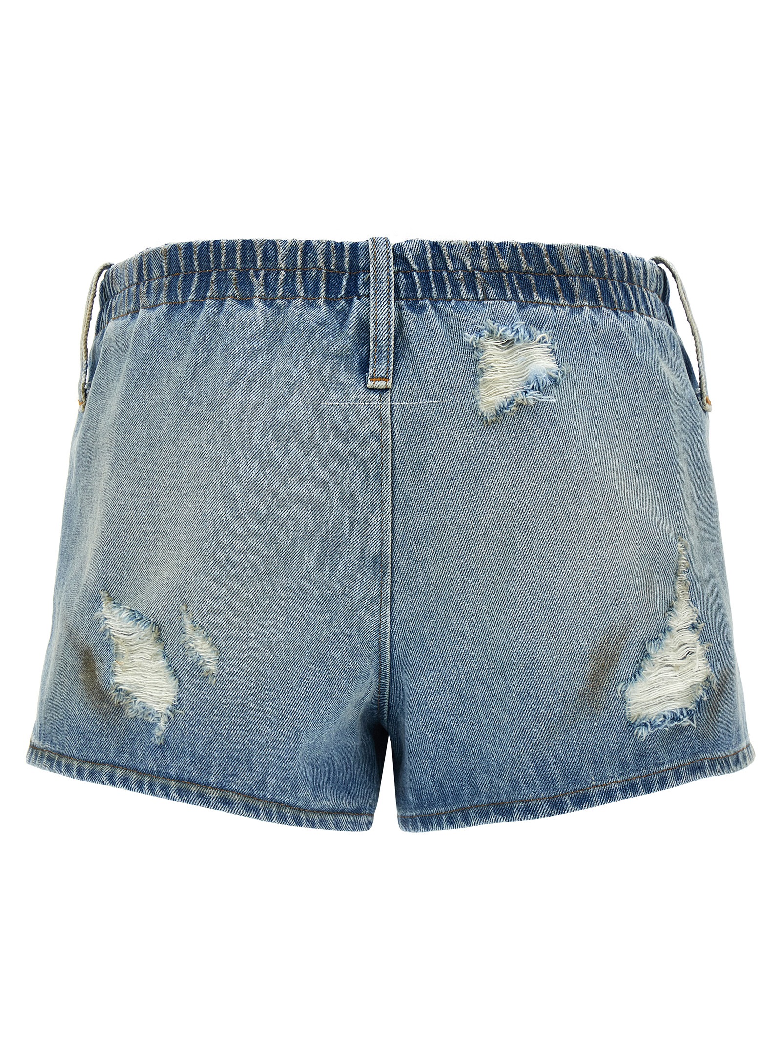Shorts in used-effect cotton denim with rips and stains, elastic waistband, pockets, side slits.