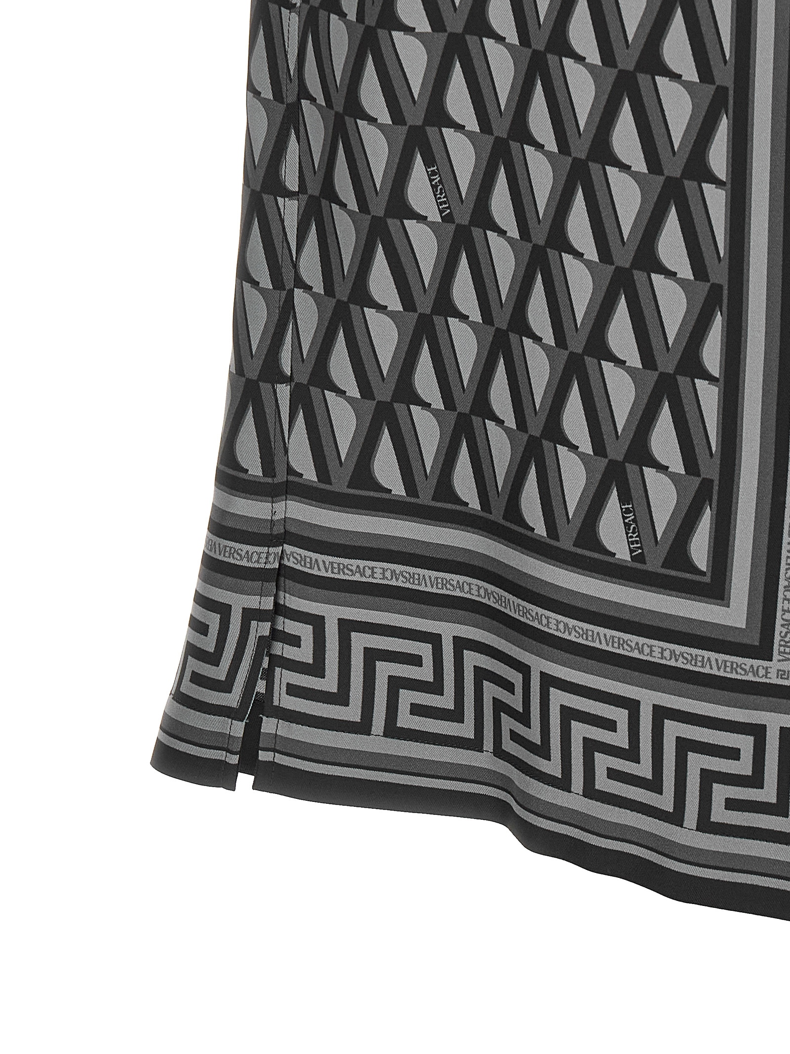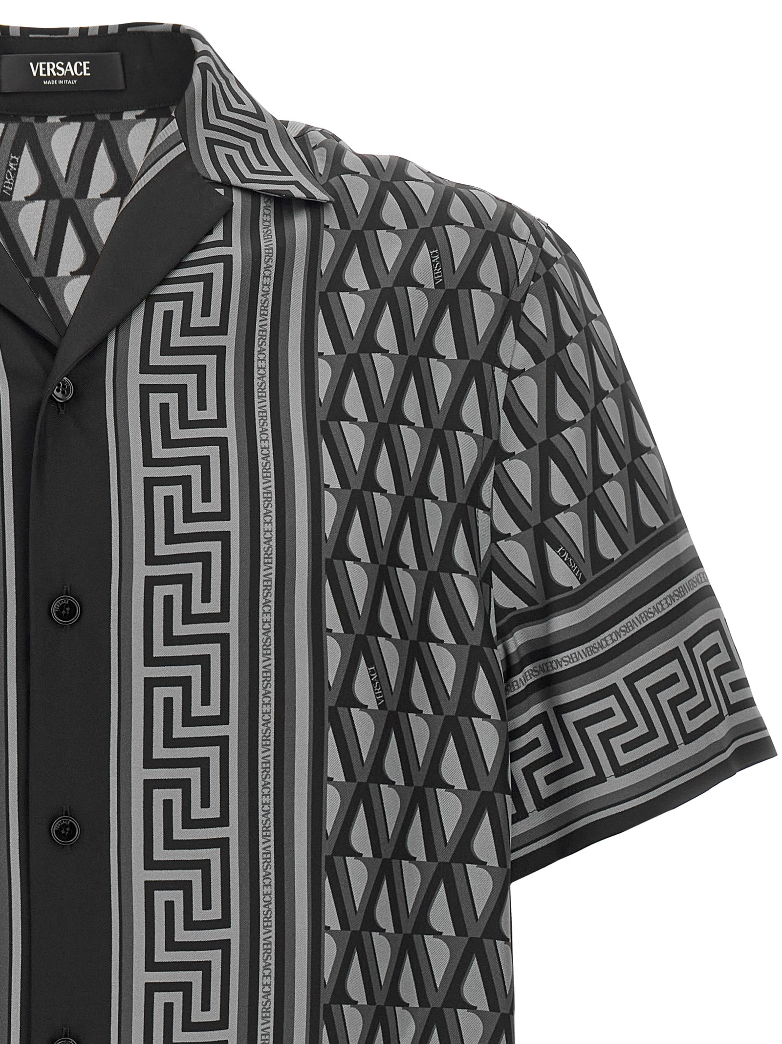 All-over ‘V Greca’ print silk twill shirt with bowling style, front button closure, short sleeves, side slits.